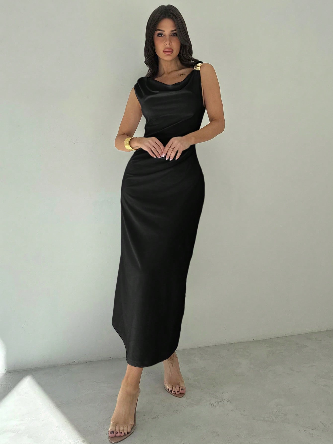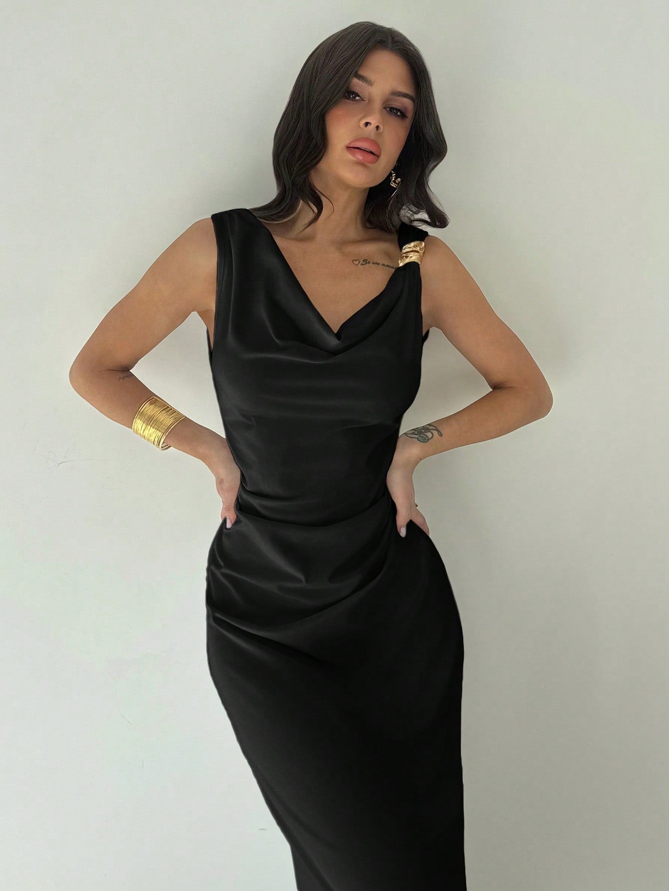 فستان نسائي أبيض من فيري، بياقة غير متماثلة وخصر مكشكش، متوسط الطول