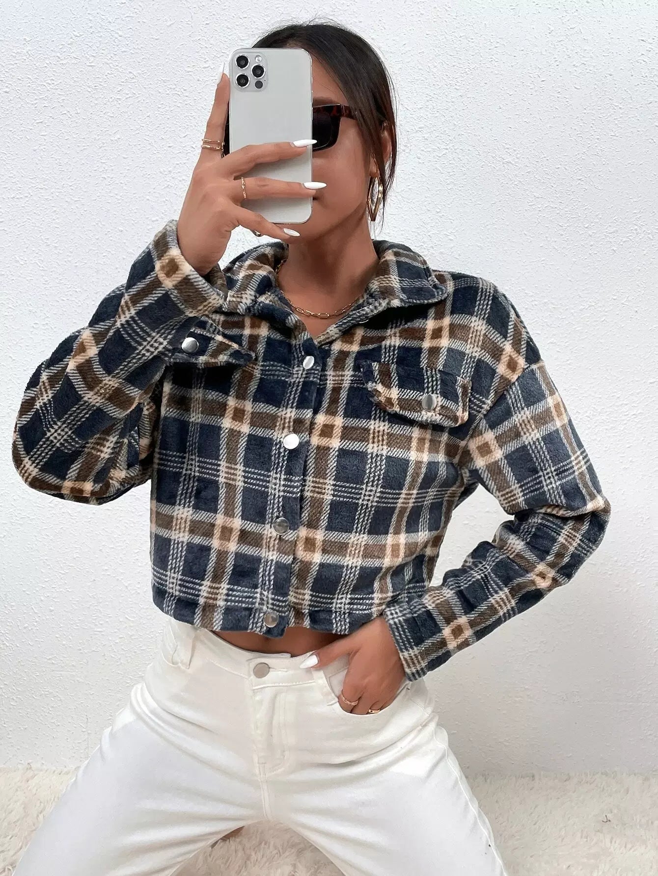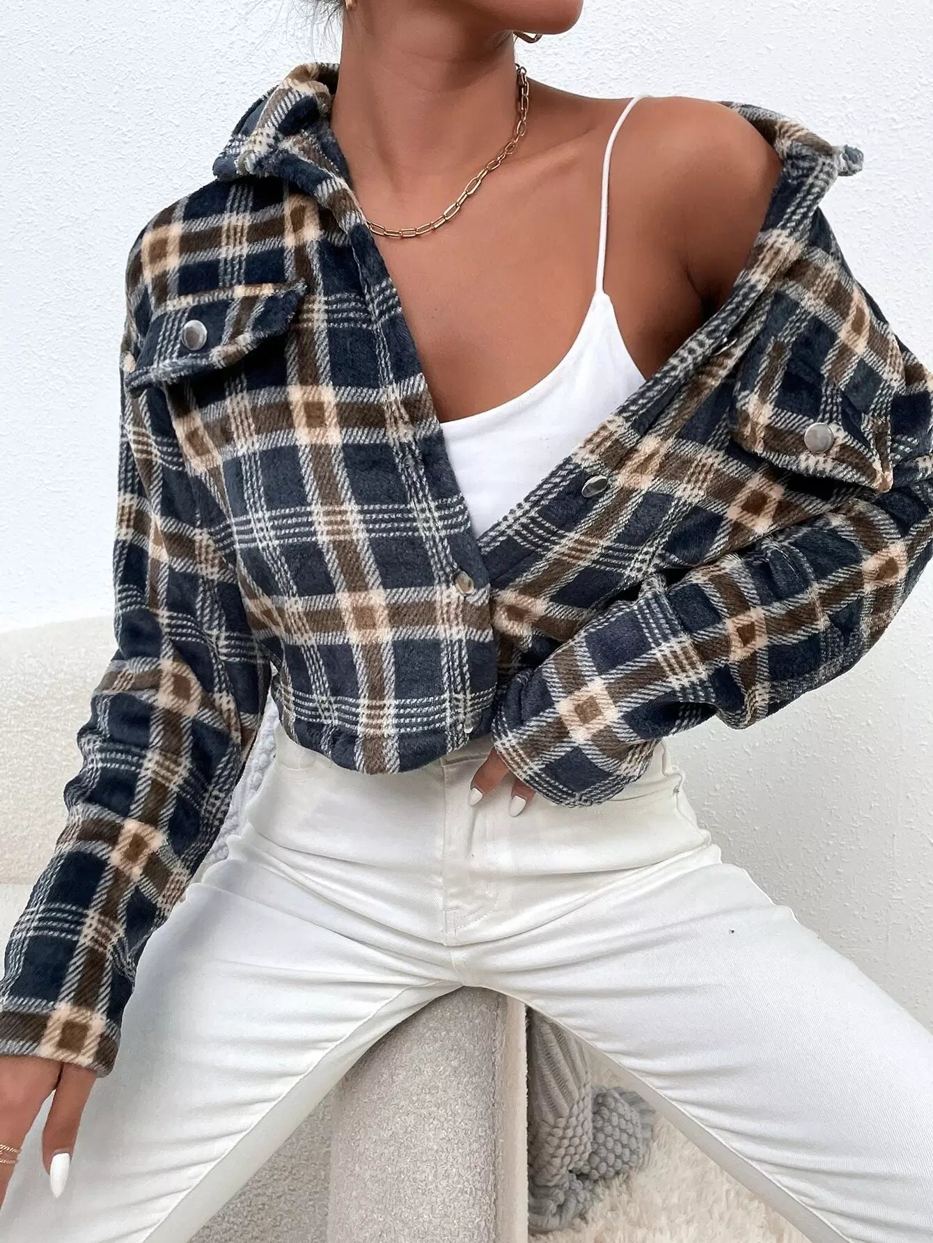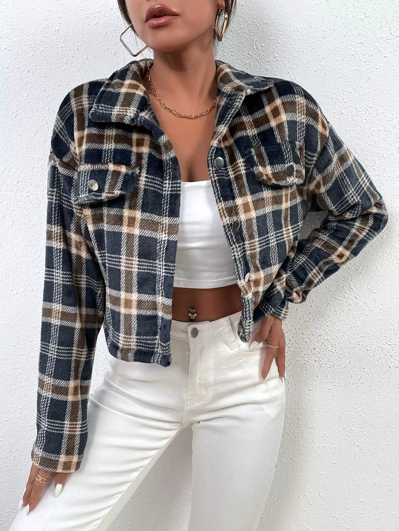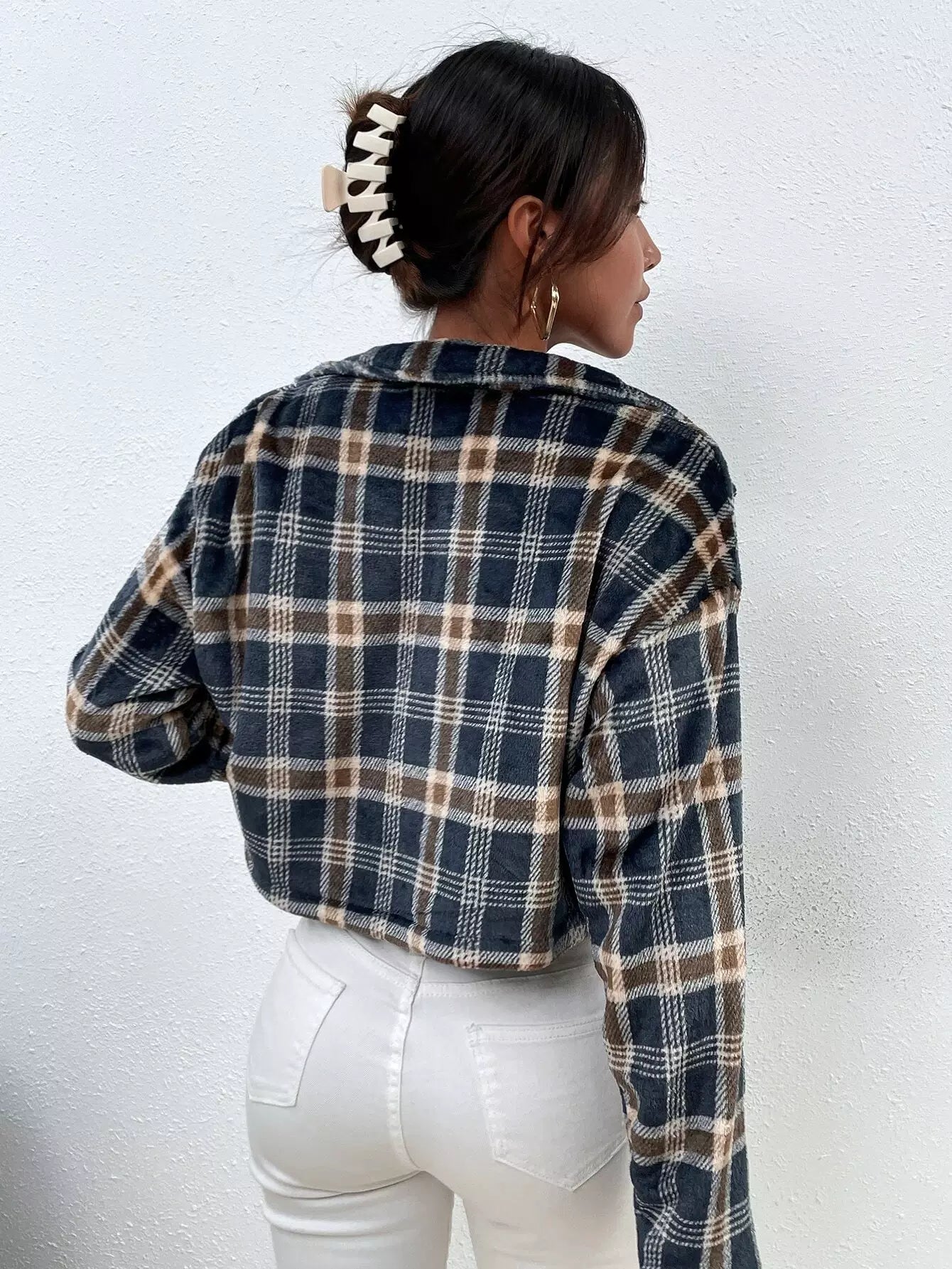للنساء - سترة بافلو منقوشة بكتف منسدل وتفاصيل قلابة