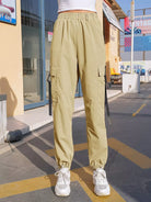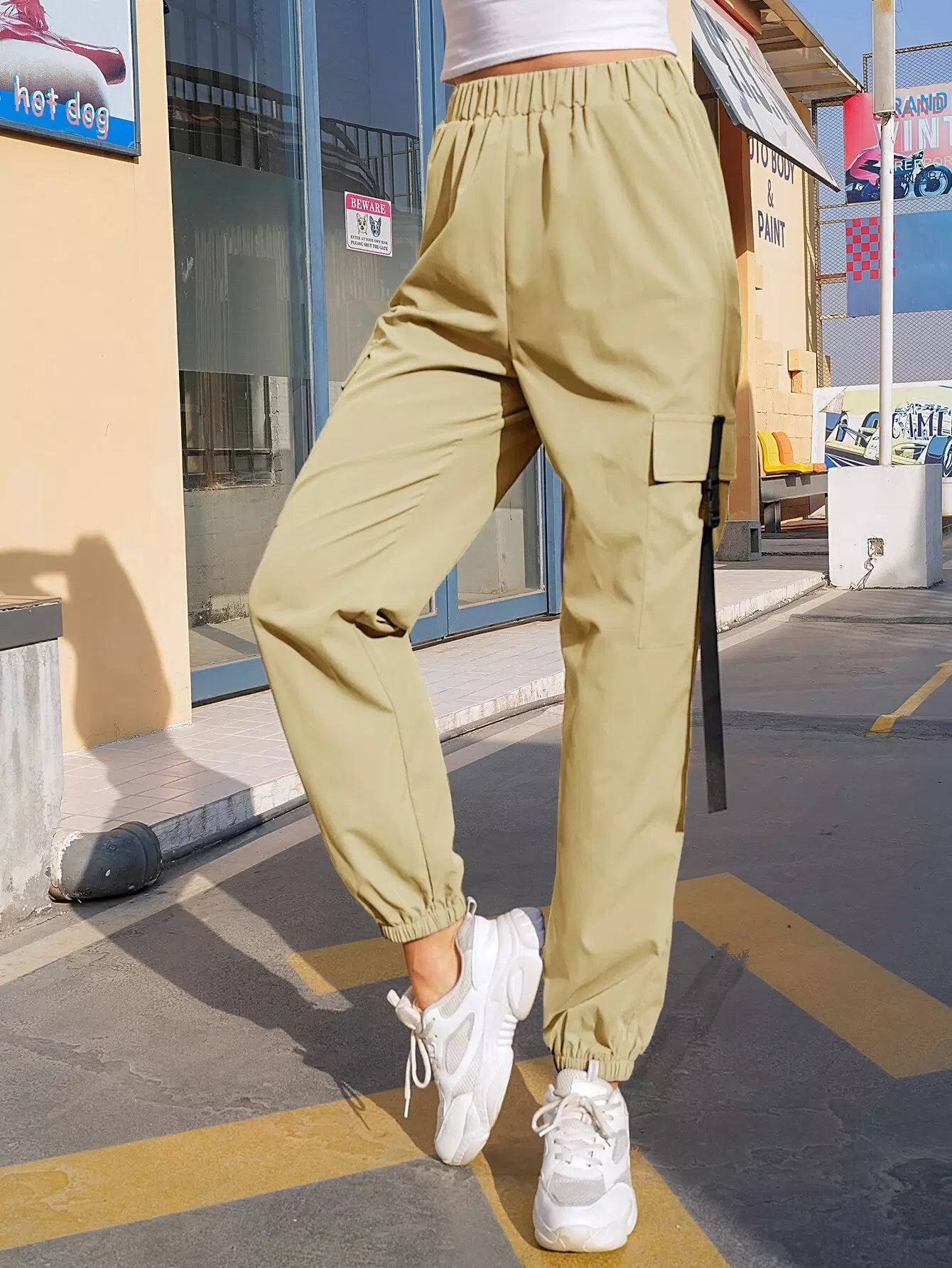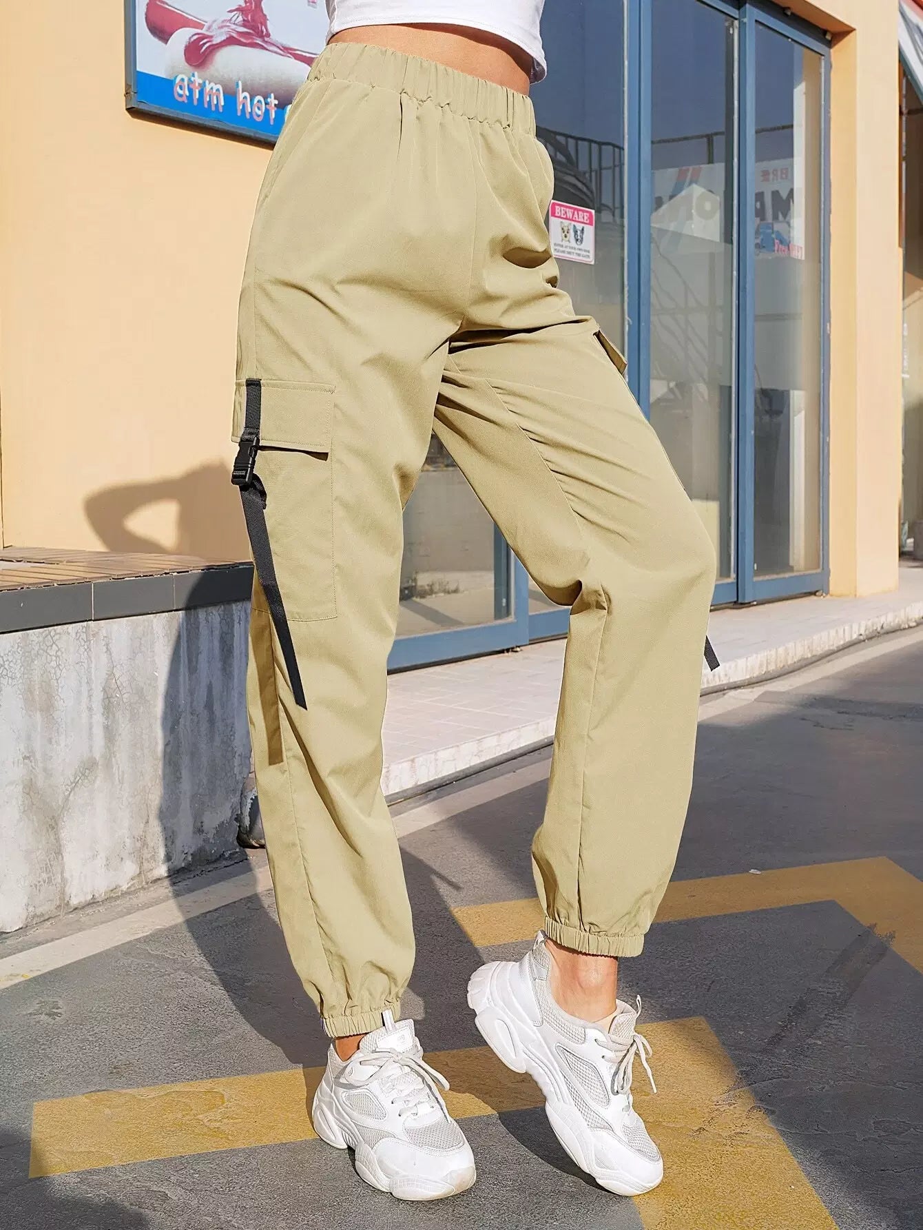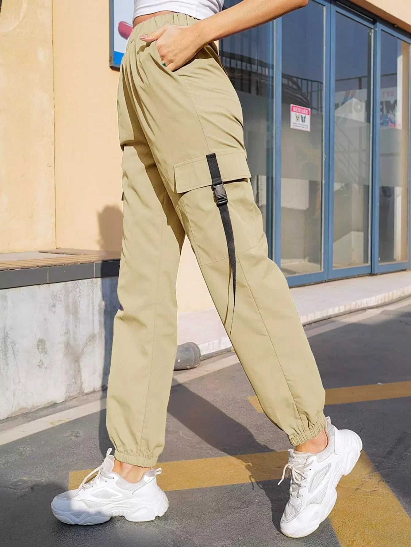 بنطلون بجيوب بغطاء بغطاء بإبزيم وشريط لاصق