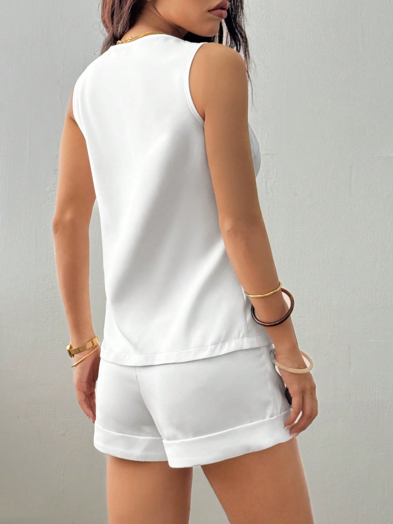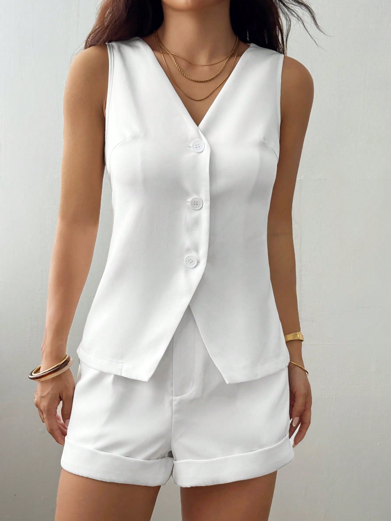 Flirla Casual Minimalist Sleeveless Cropped Jacket With Front Buttons & High-Low Hem, Matching High-Waisted