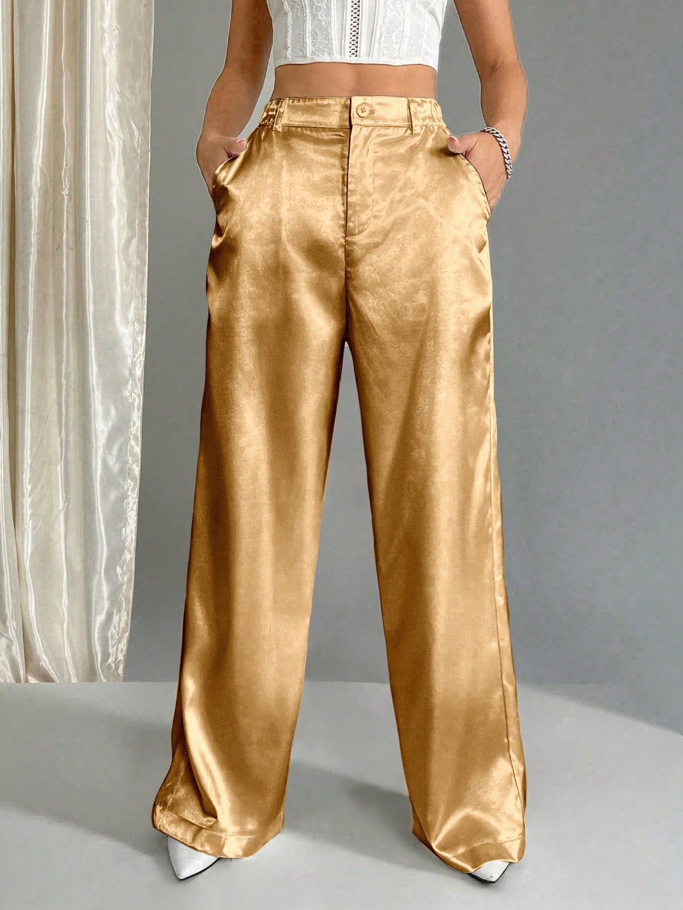 Flirla Women's Solid Color Button Front Pocket Simple Casual Long Pants, Everyday Wear