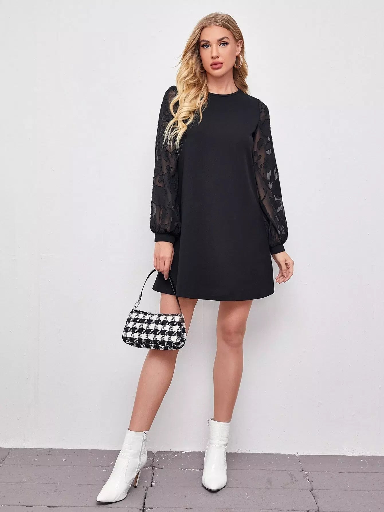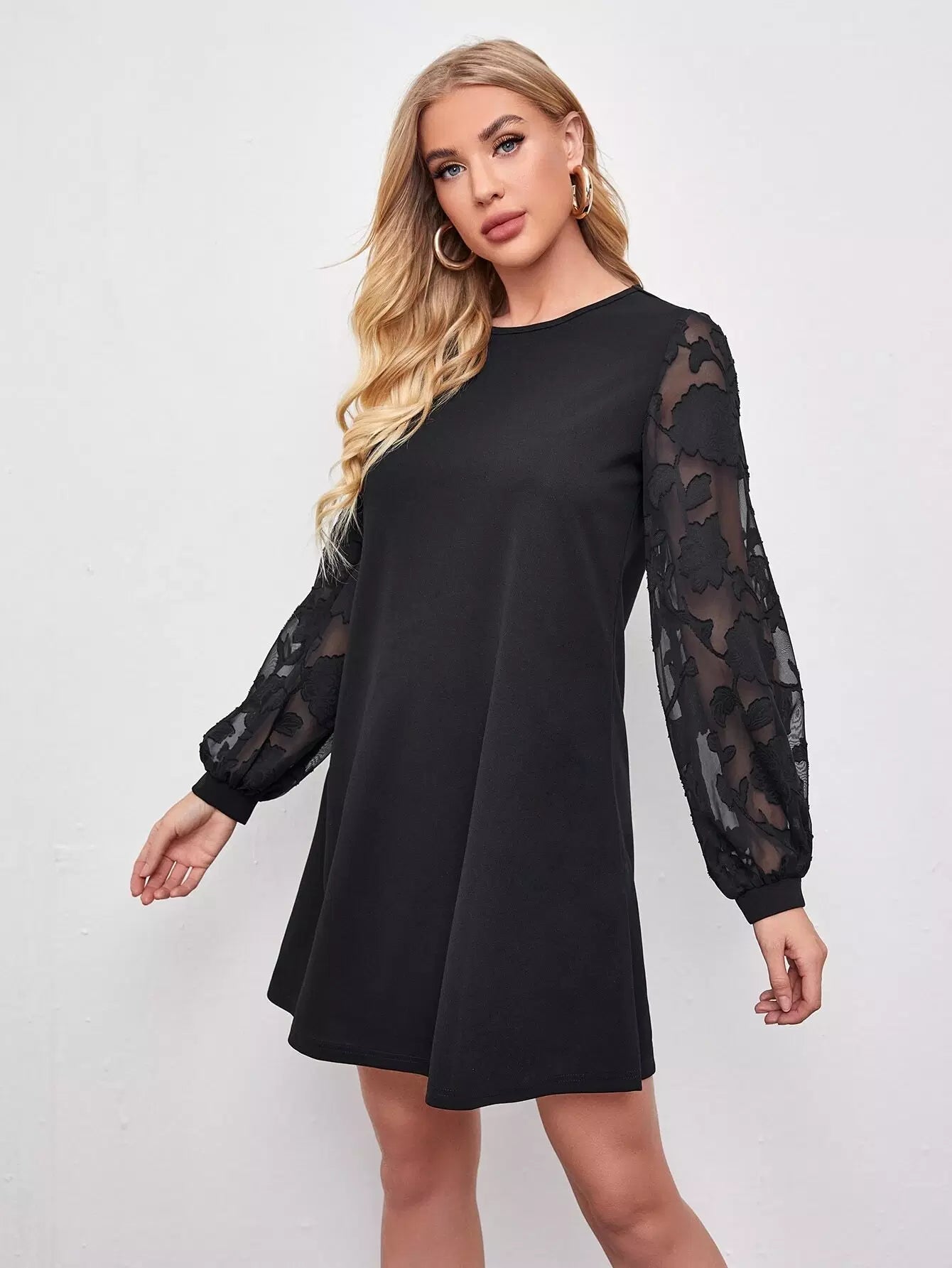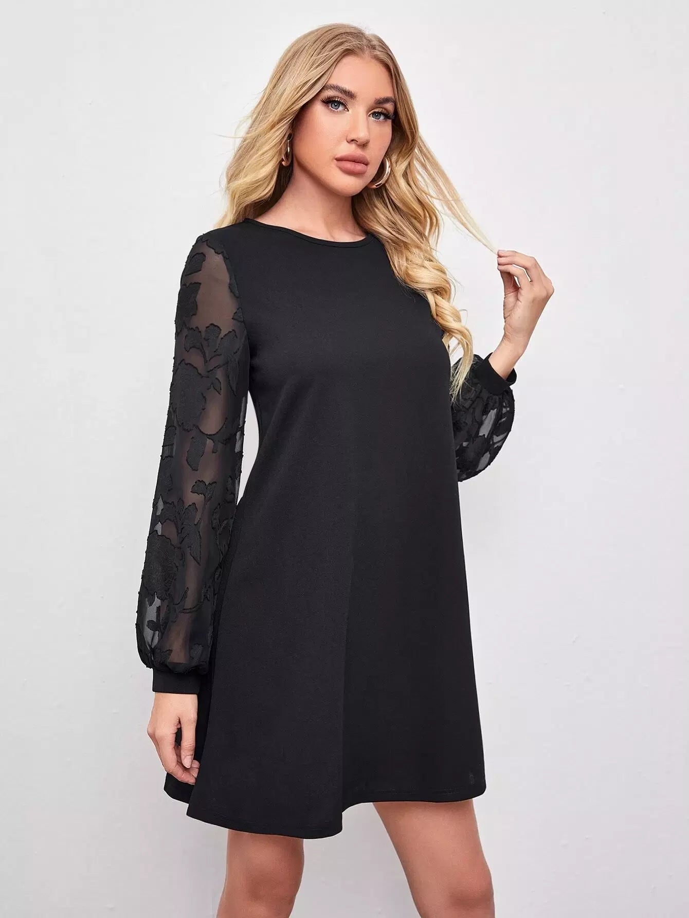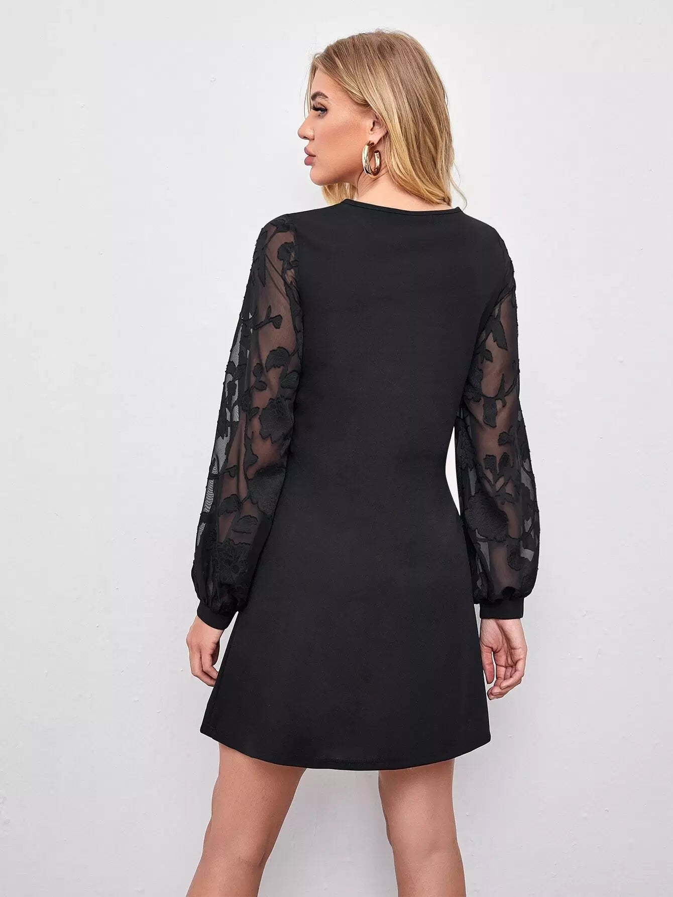 فستان بأكمام شفافة مزين بزخارف زهرية بأكمام شفافة