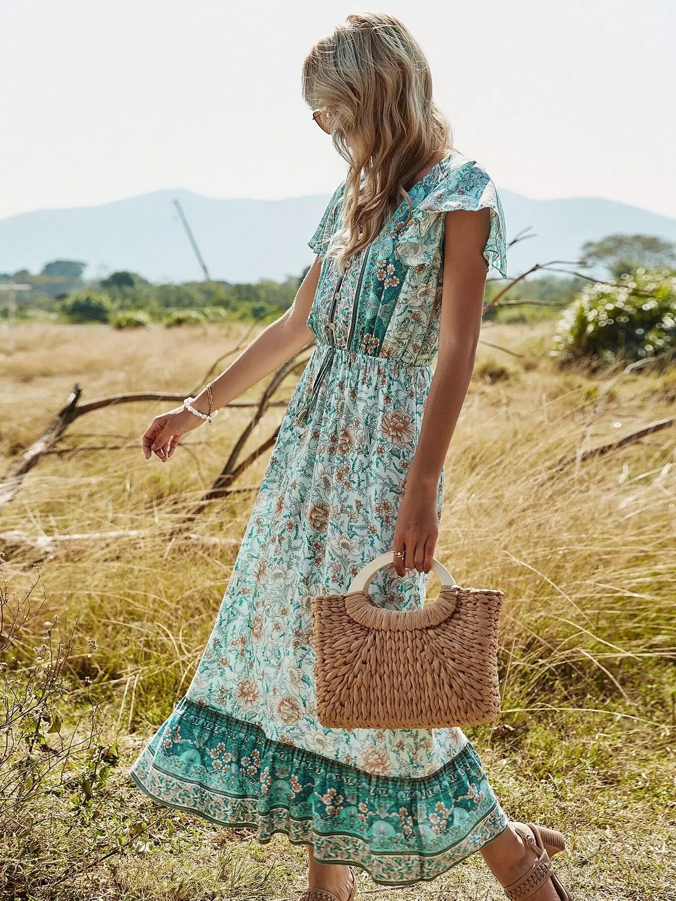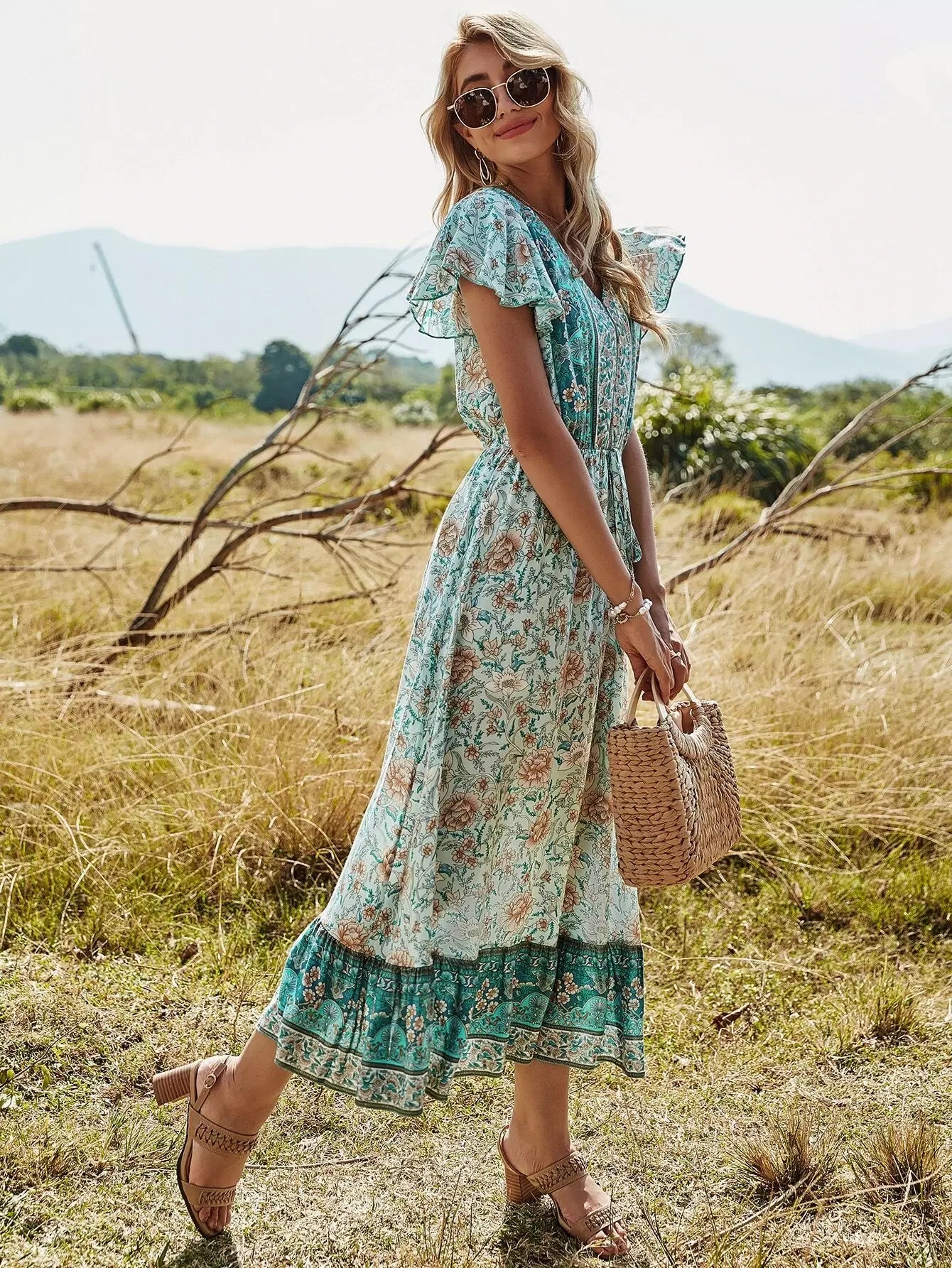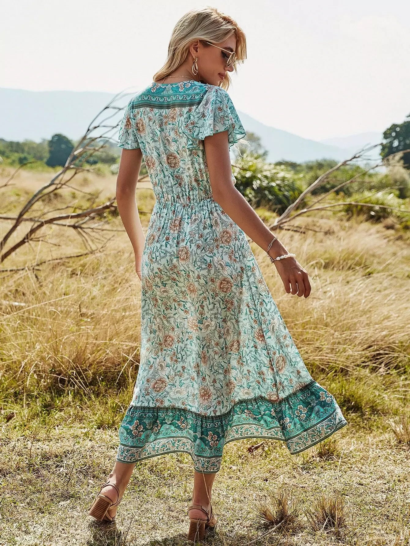 فستان مزين بالزهور وأكمام فراشة وحافة مكشكشة