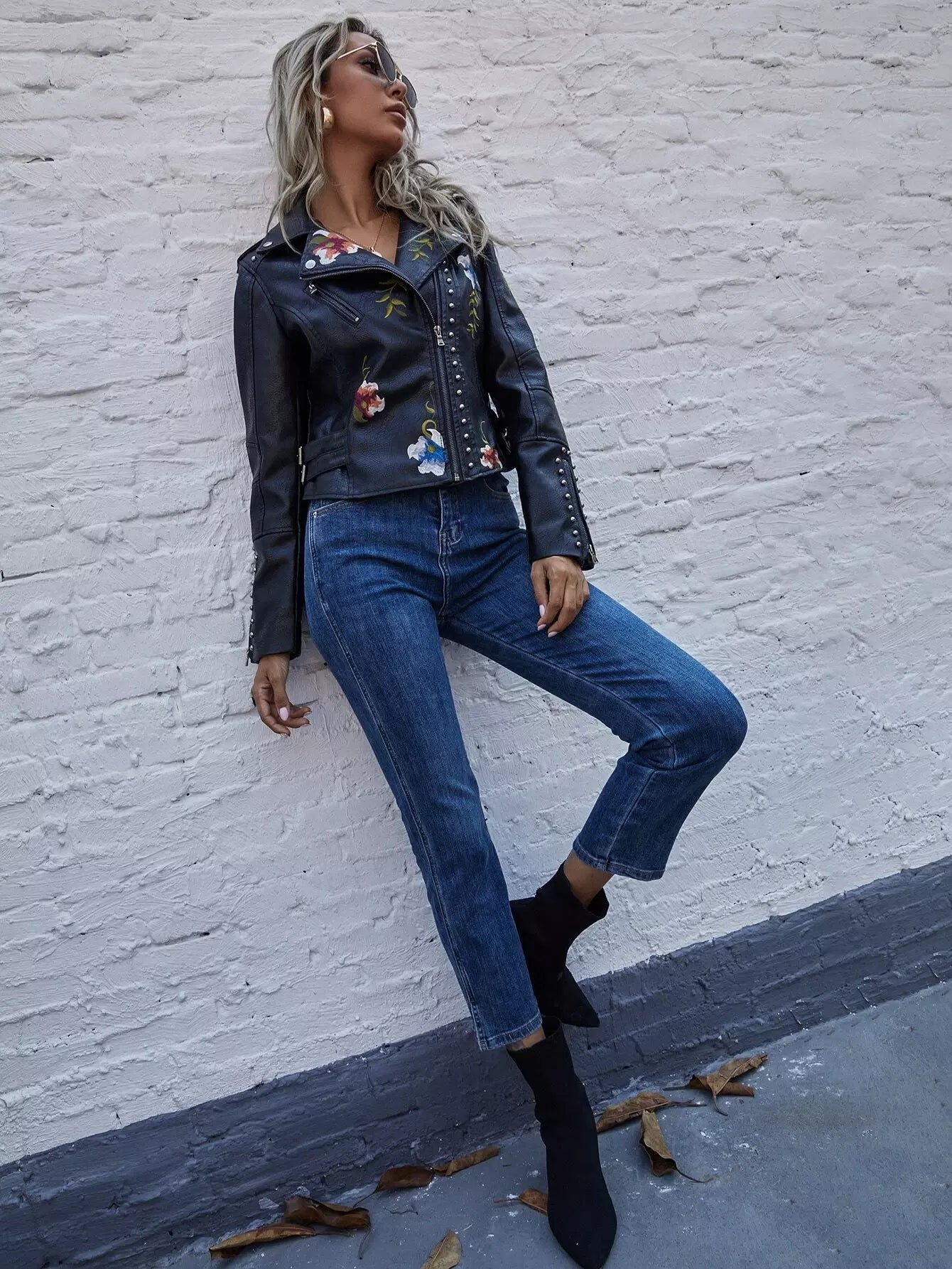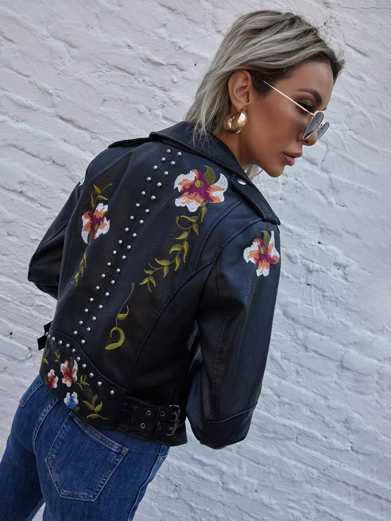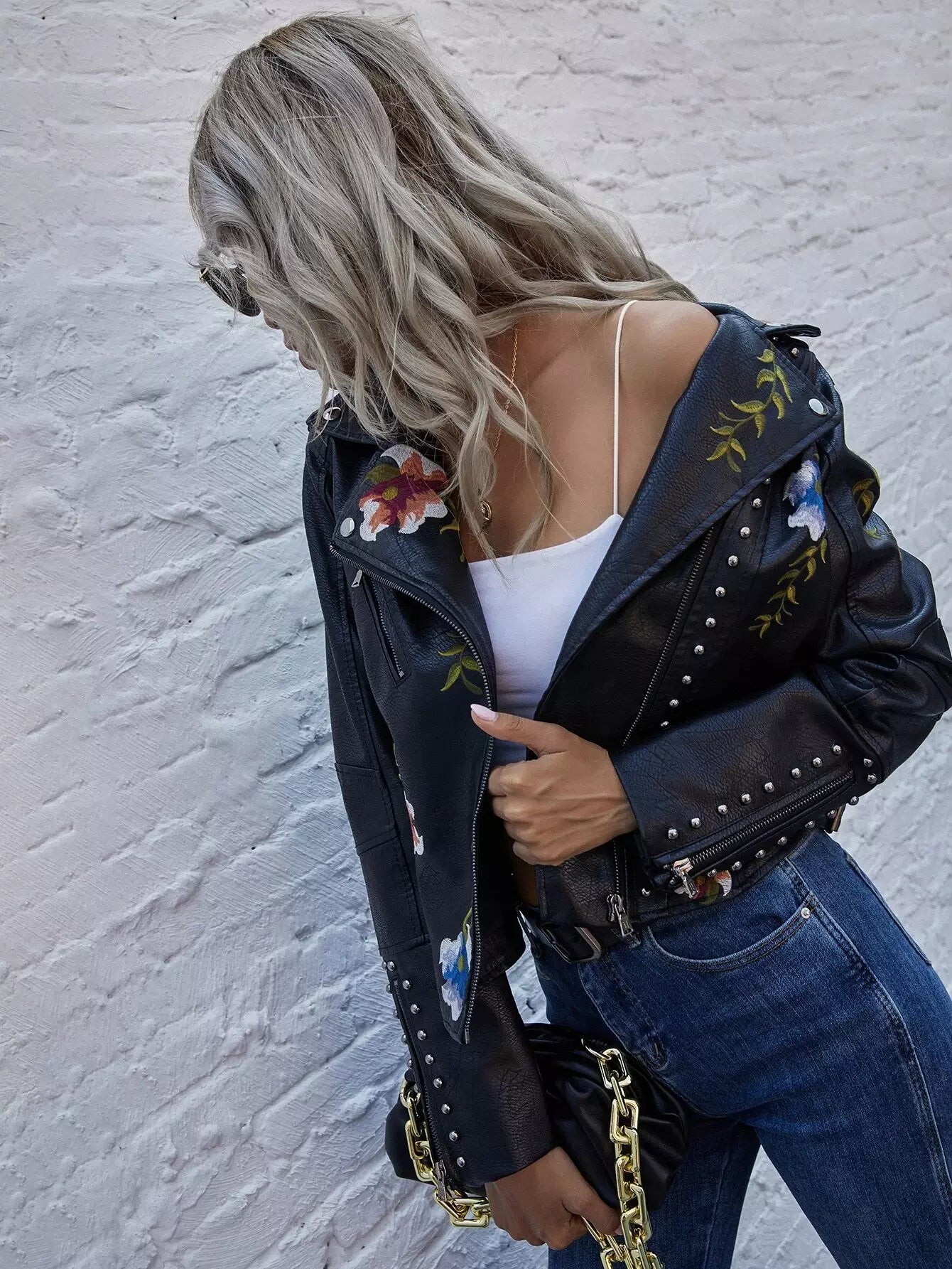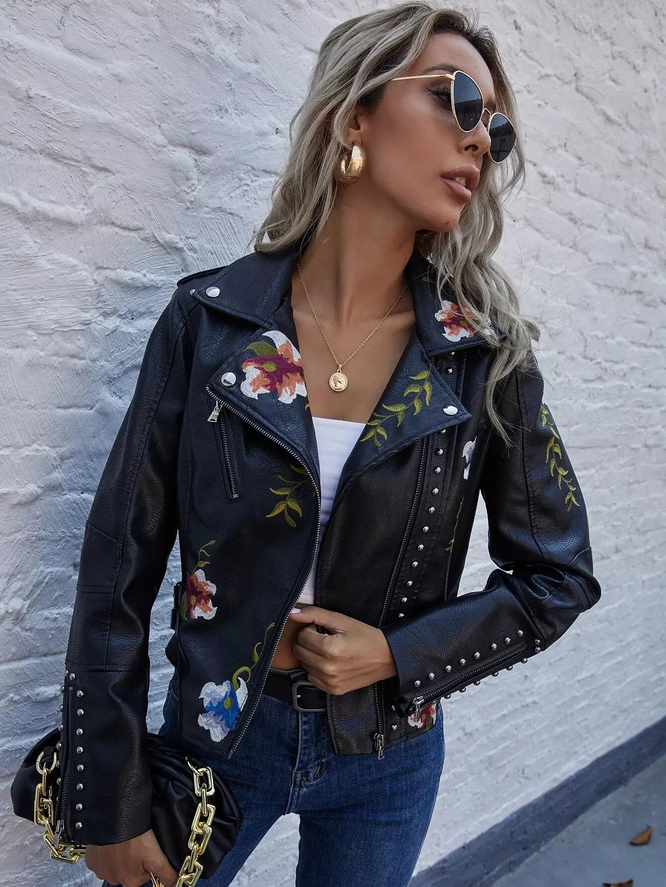 للنساء - سترة موتو من البولي يوريثان مطرزة بالزهور ومزودة بسحّاب