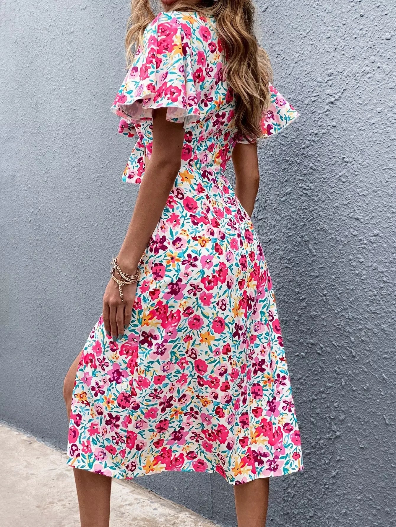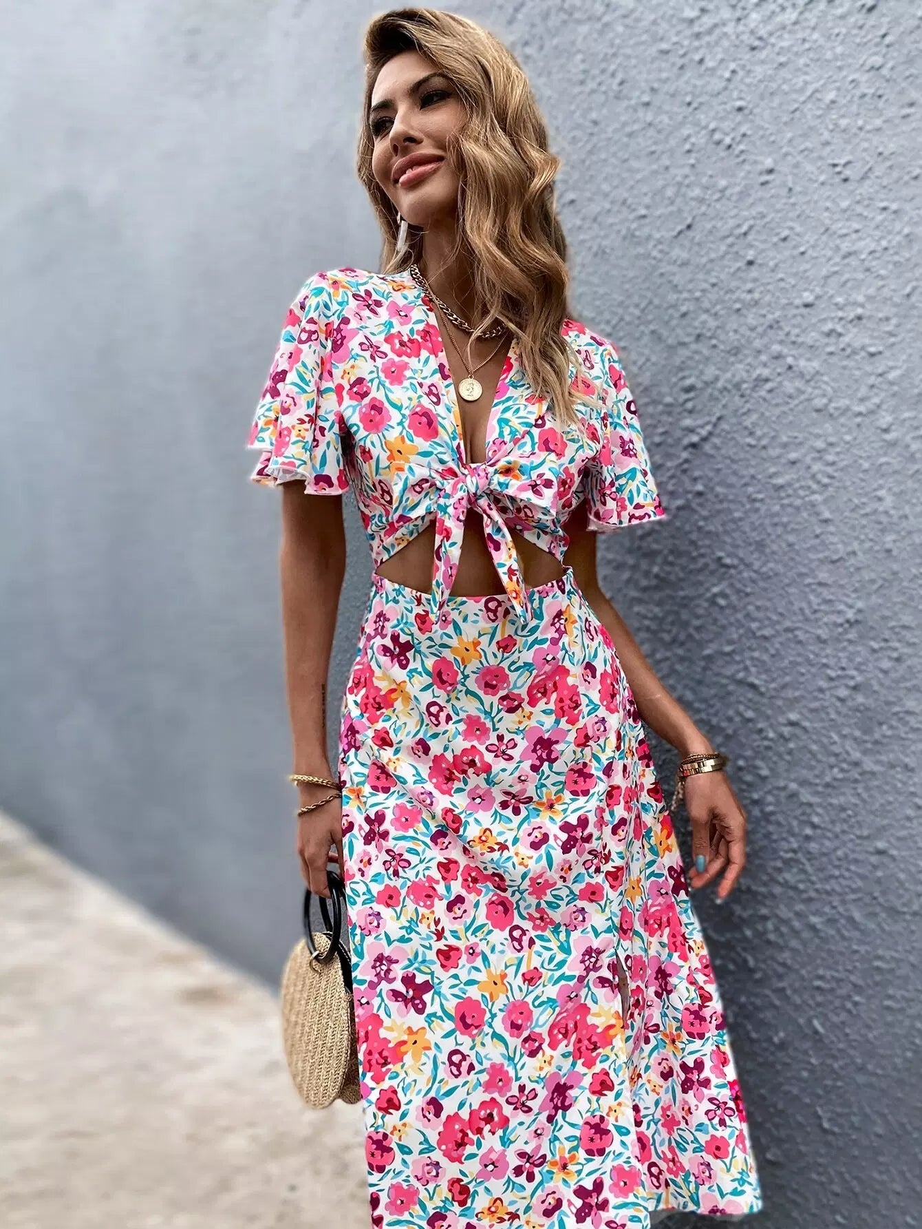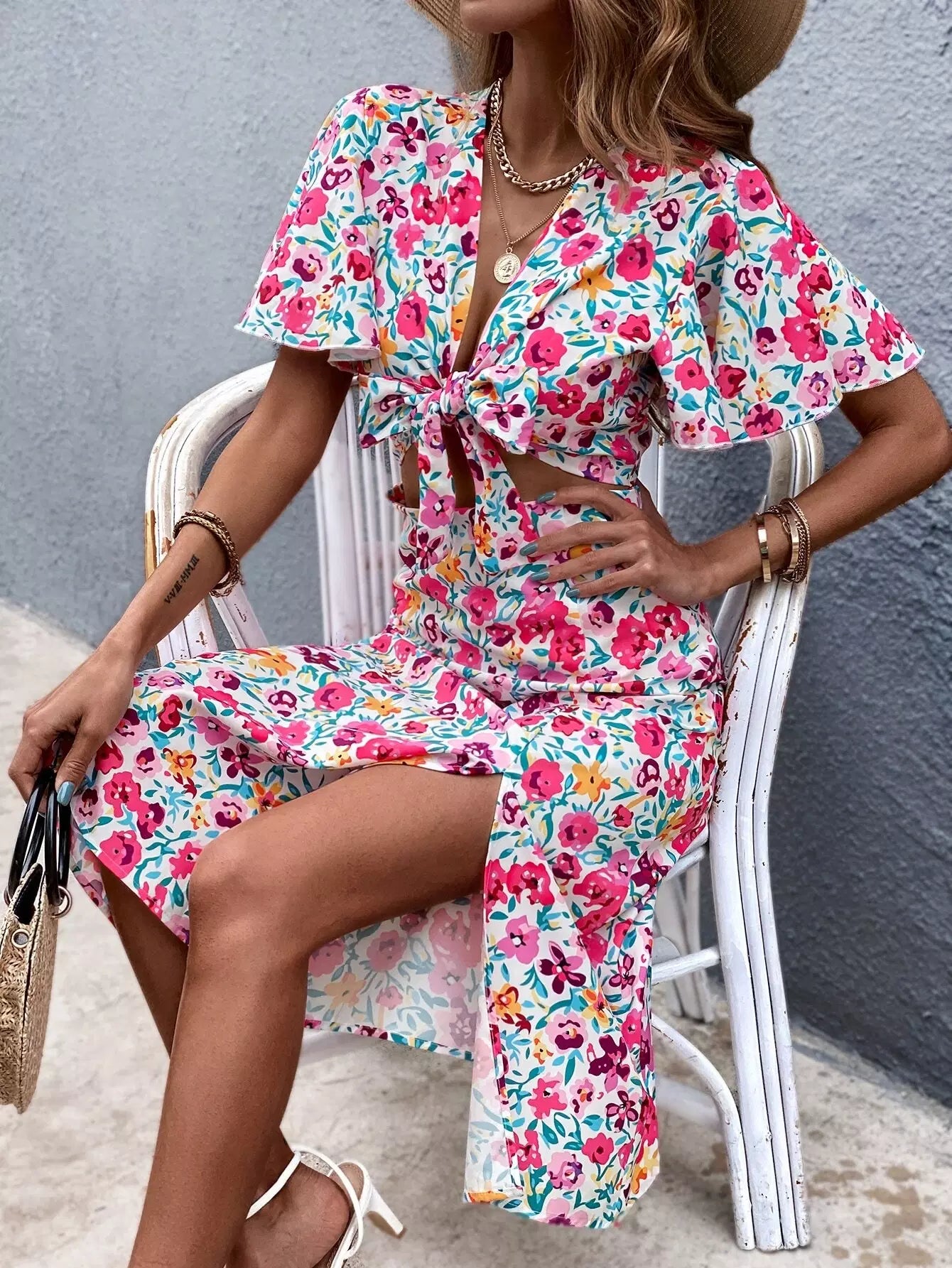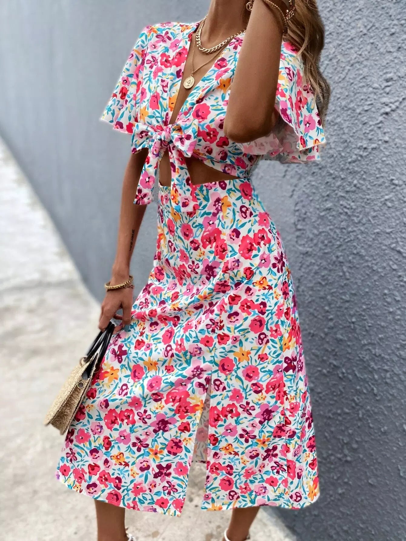 فستان مفتوح من الأمام بربطة عنق منسدلة من الفخذين مزين بالزهور