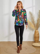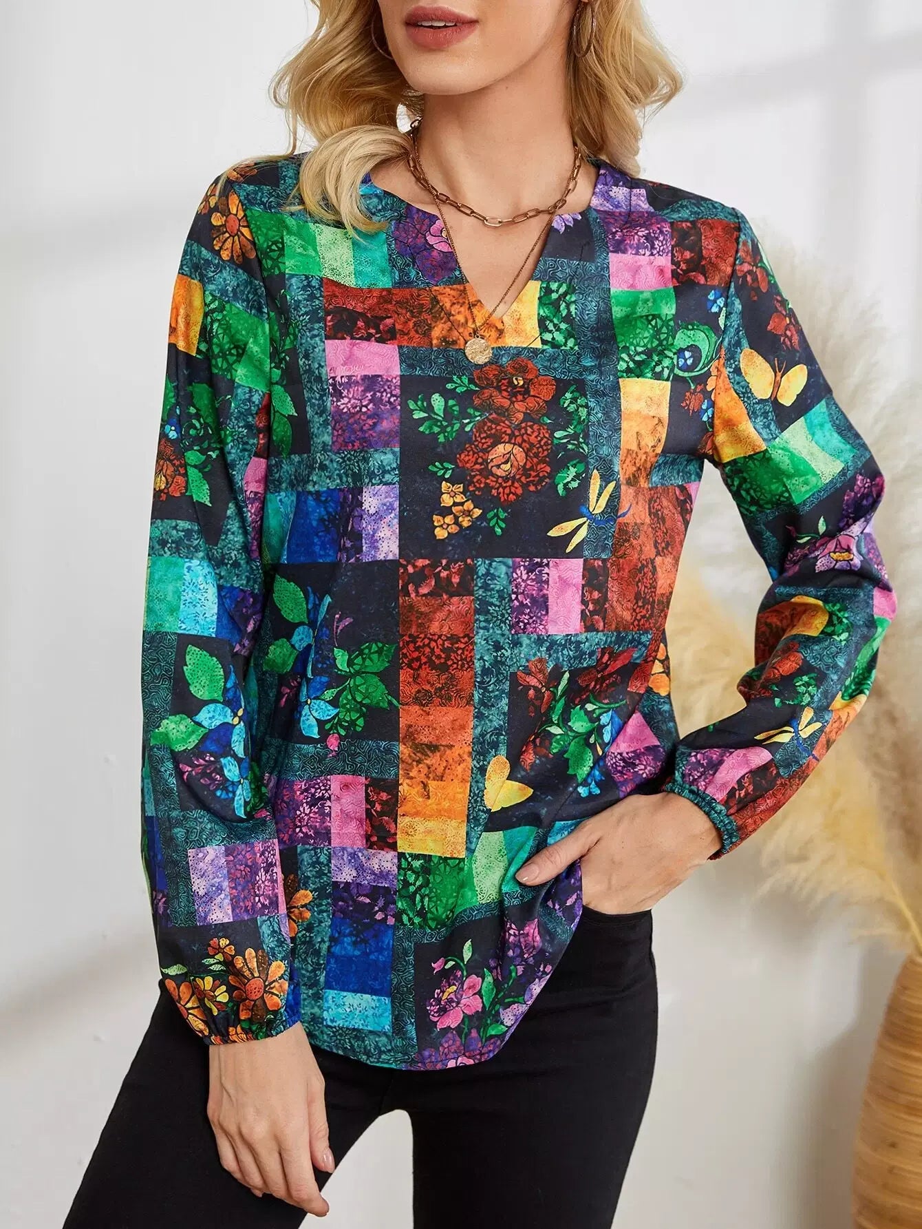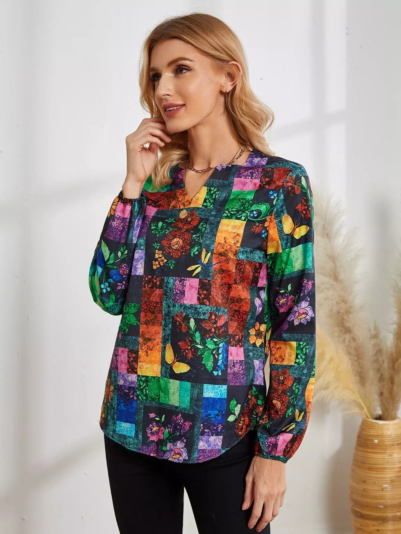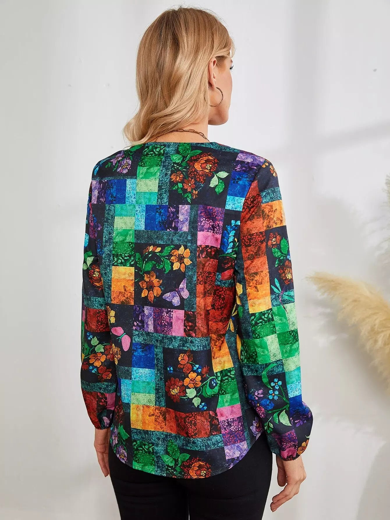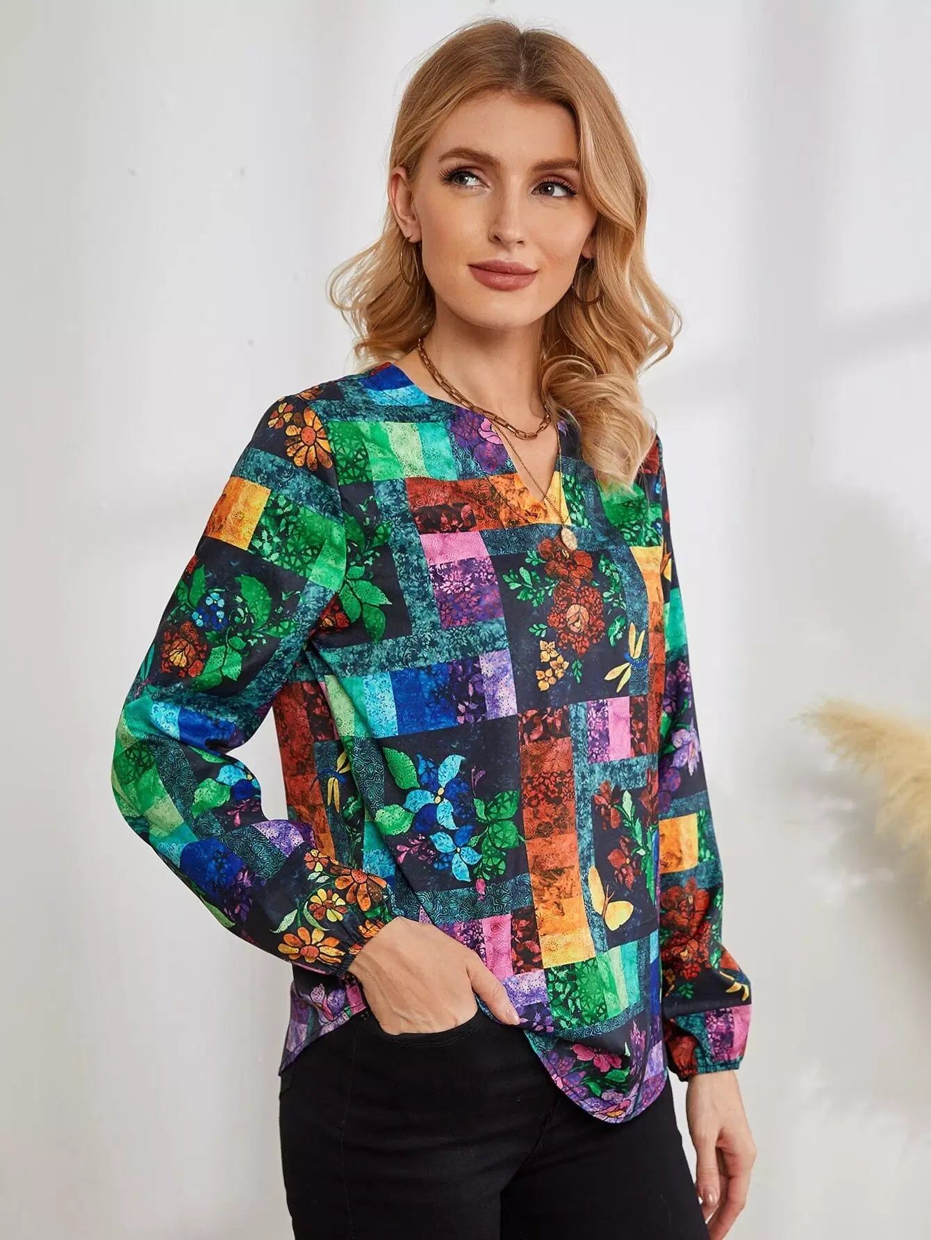 بلوزة بطبعة زهور بطبعة زهور ملونة بحافة منحنية