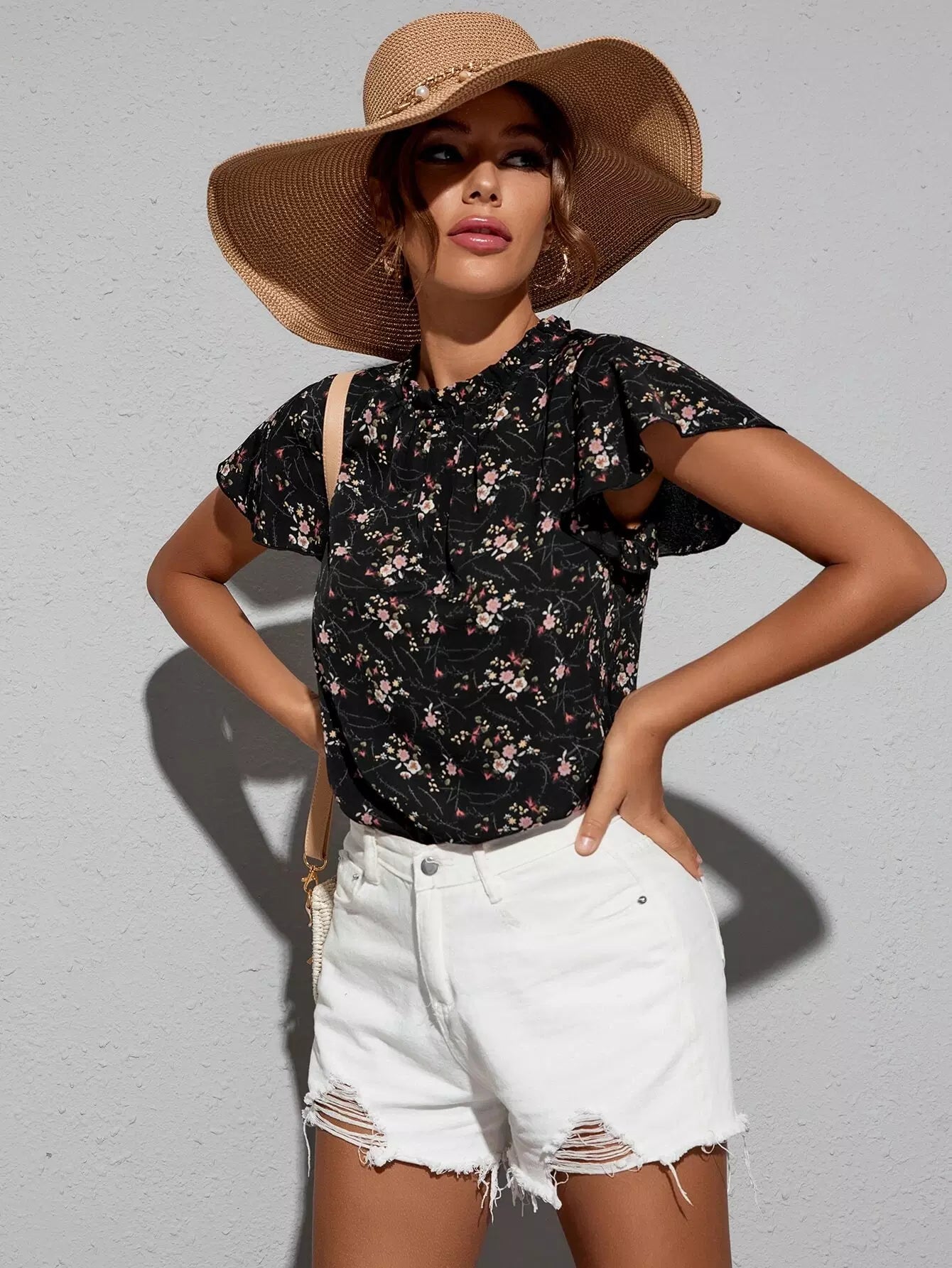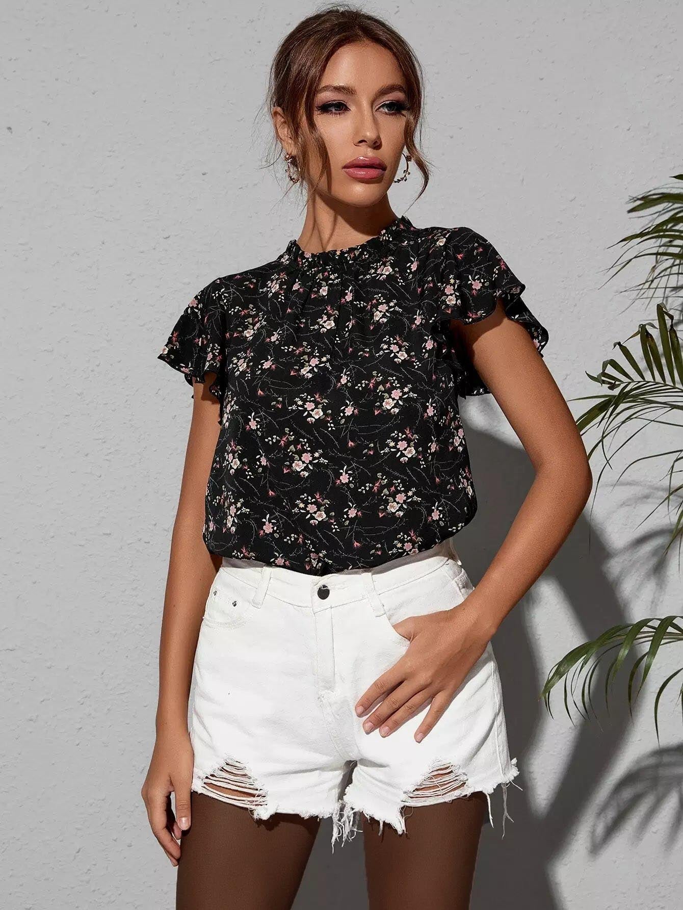 بلوزة بطبعة زهور مع كشكشة على الرقبة