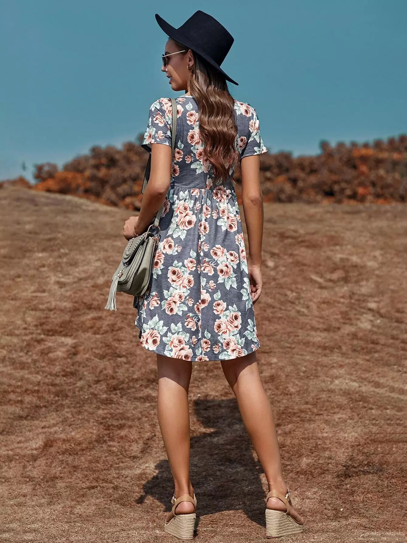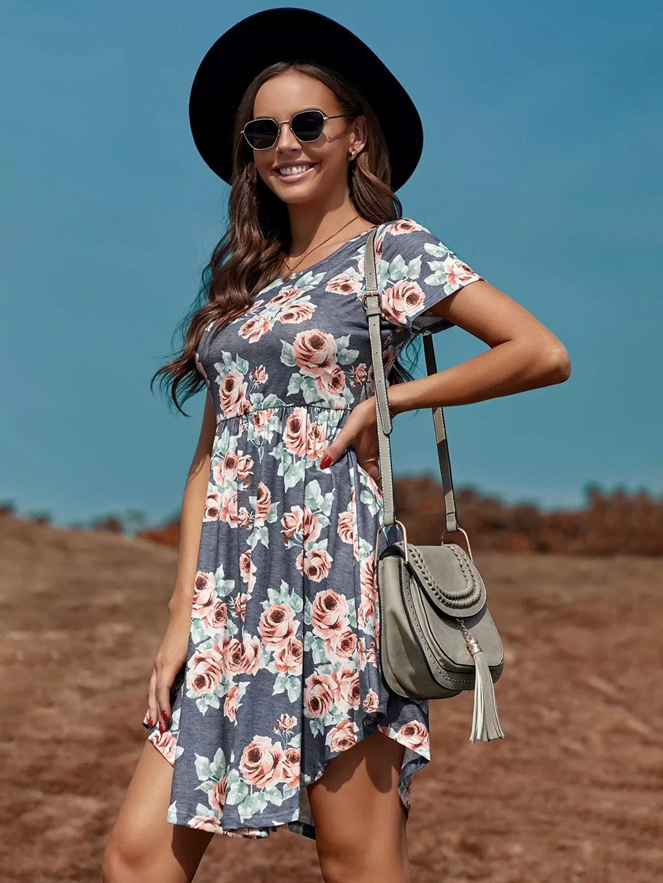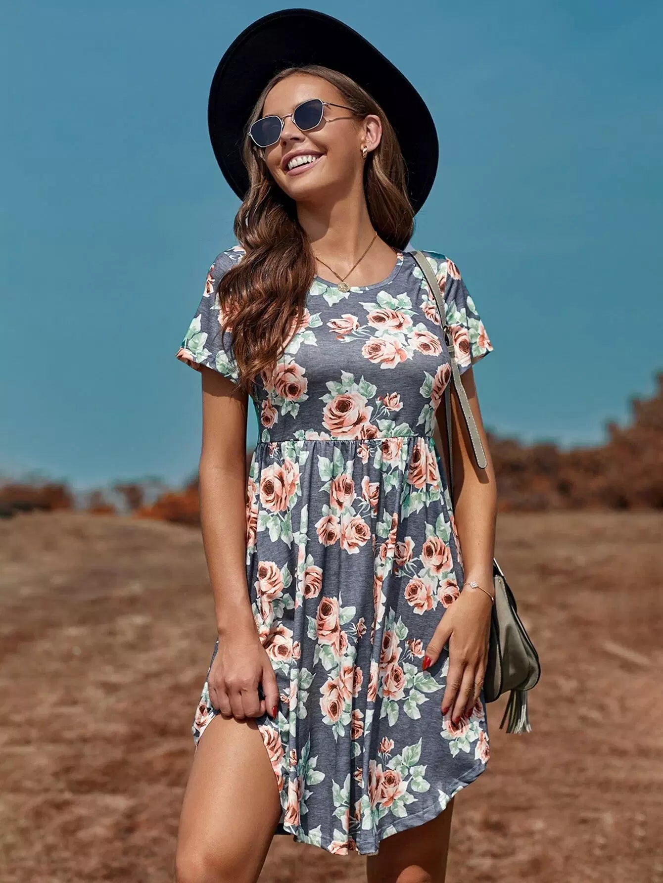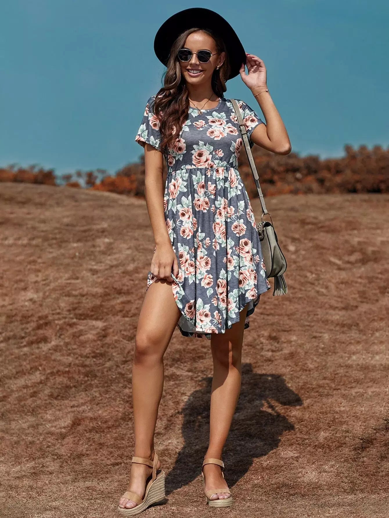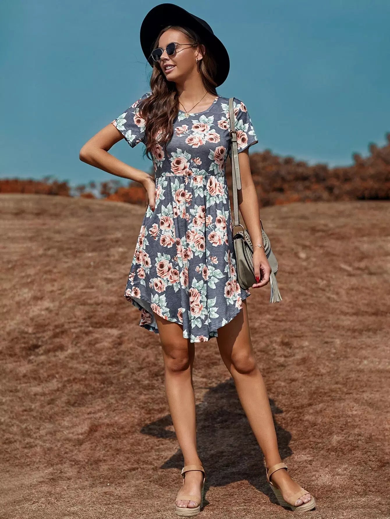 فستان بطبعة زهور مطبوع بخصر عالٍ على شكل حرف A