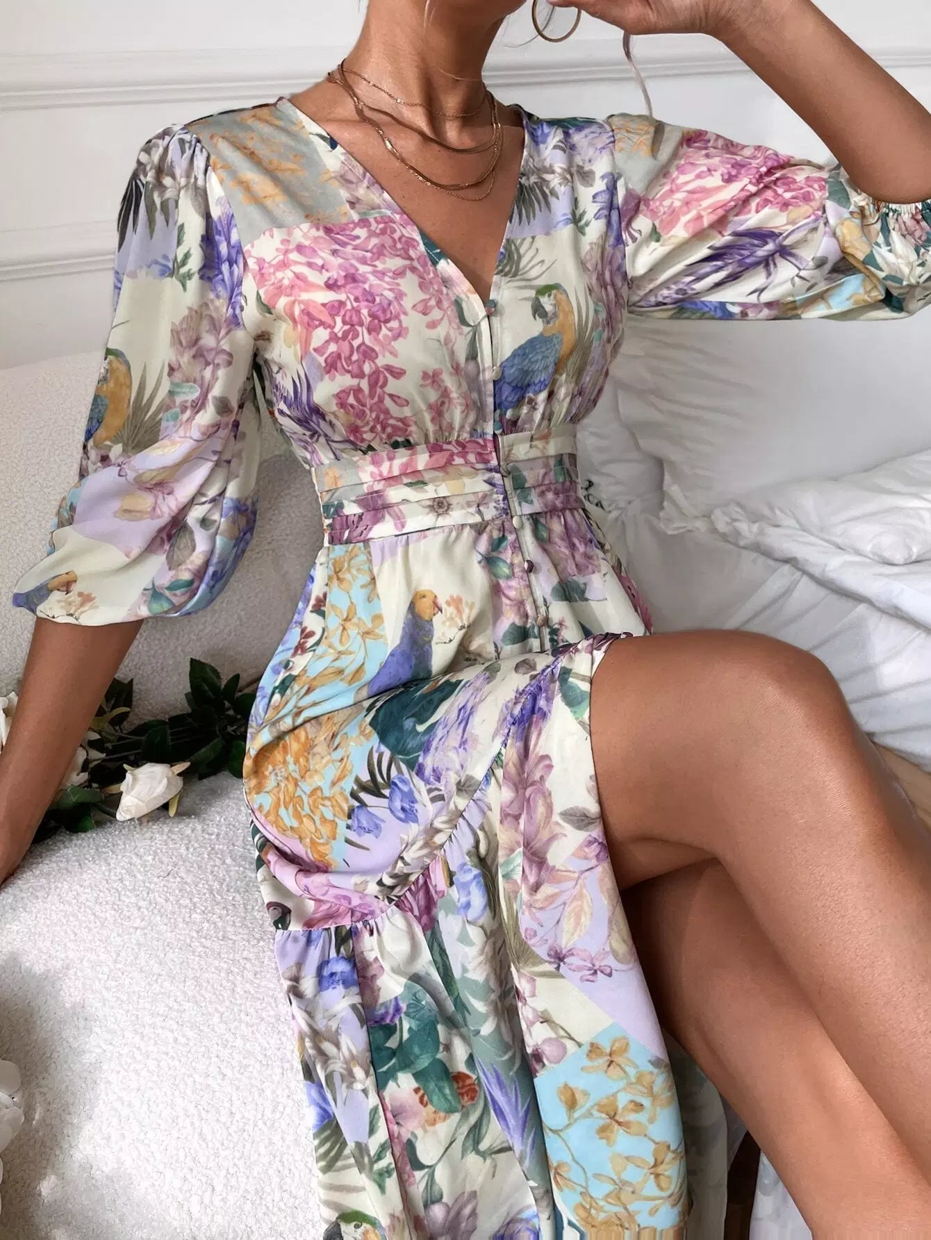 فستان كشكش بحواف مكشكشة بطبعة زهور منقسمة على الفخذين