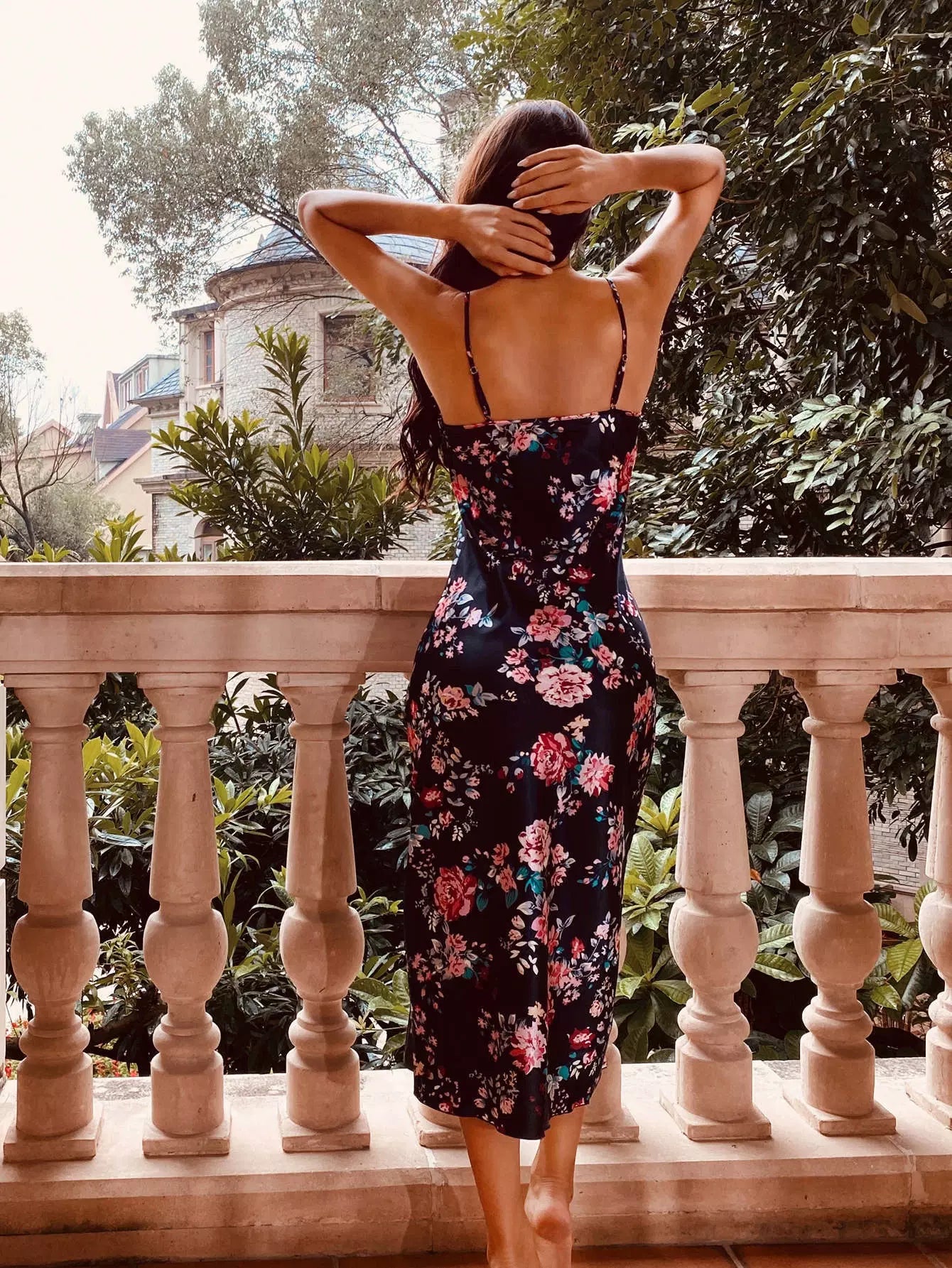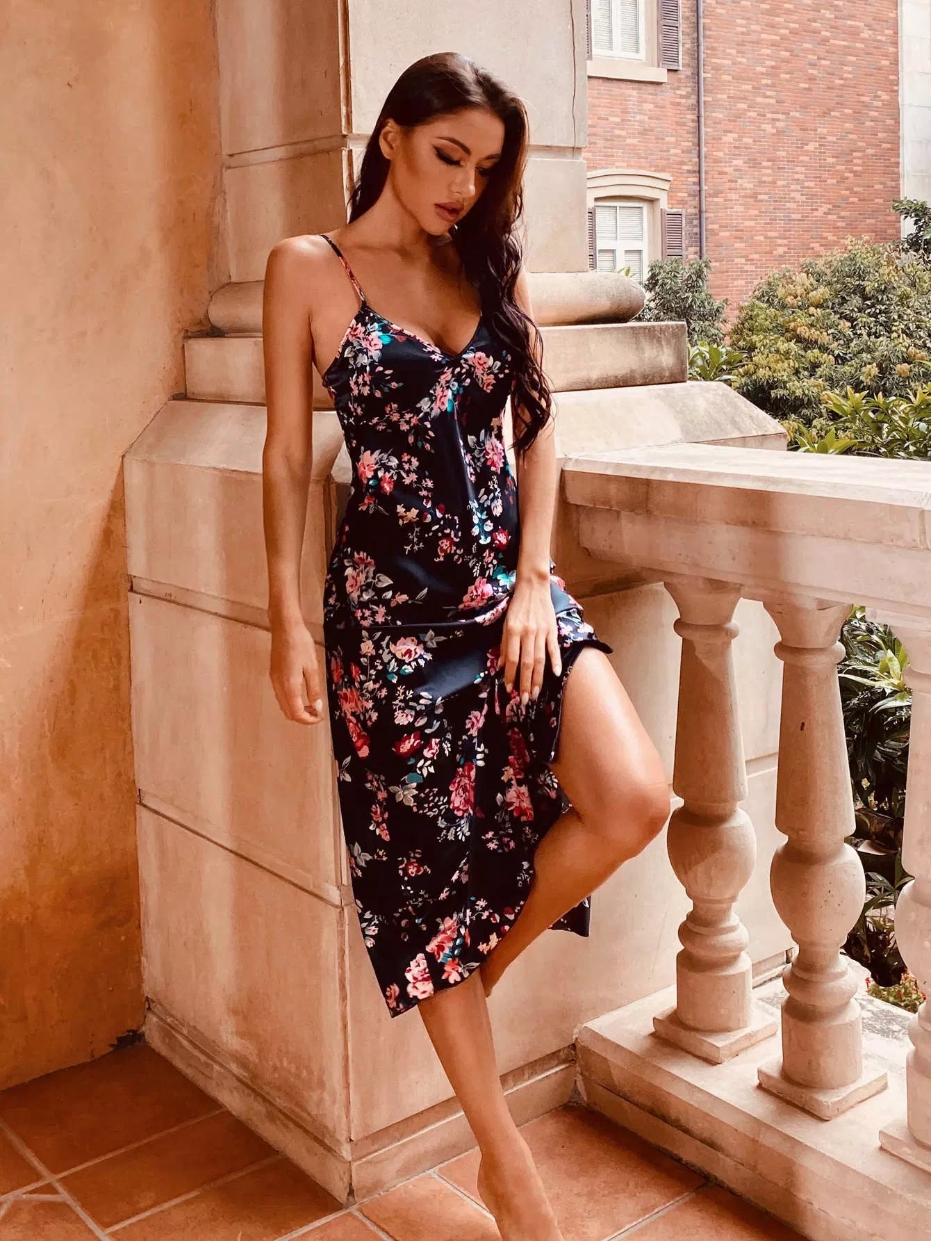 فستان سهرة ساتان كامي ساتان بطبعة زهور منقسمة على الفخذين