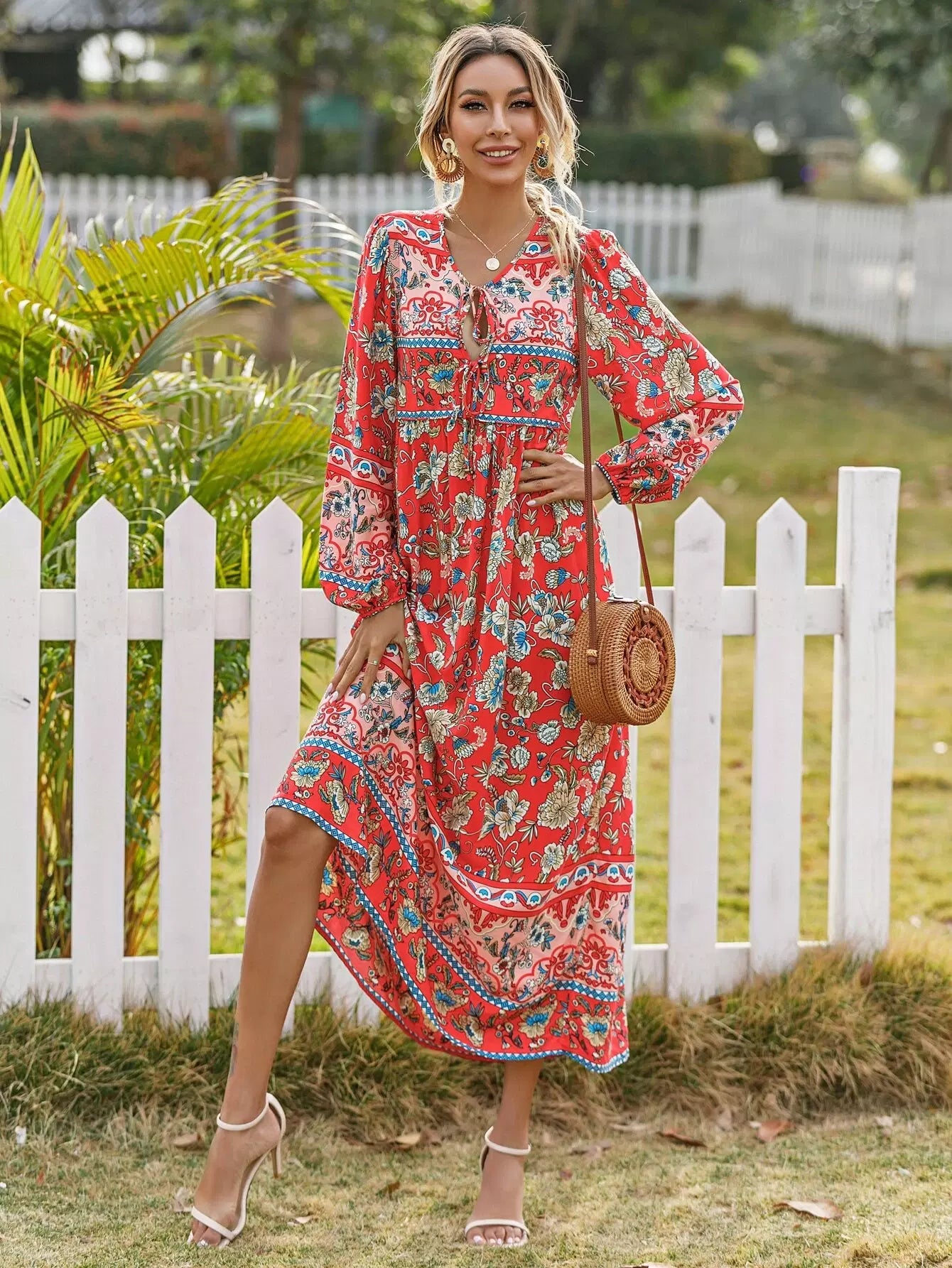 فستان سموك برقبة عنق ربطة عنق مطبوع بالزهور