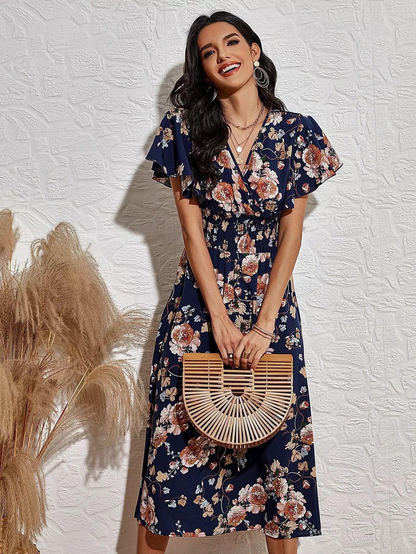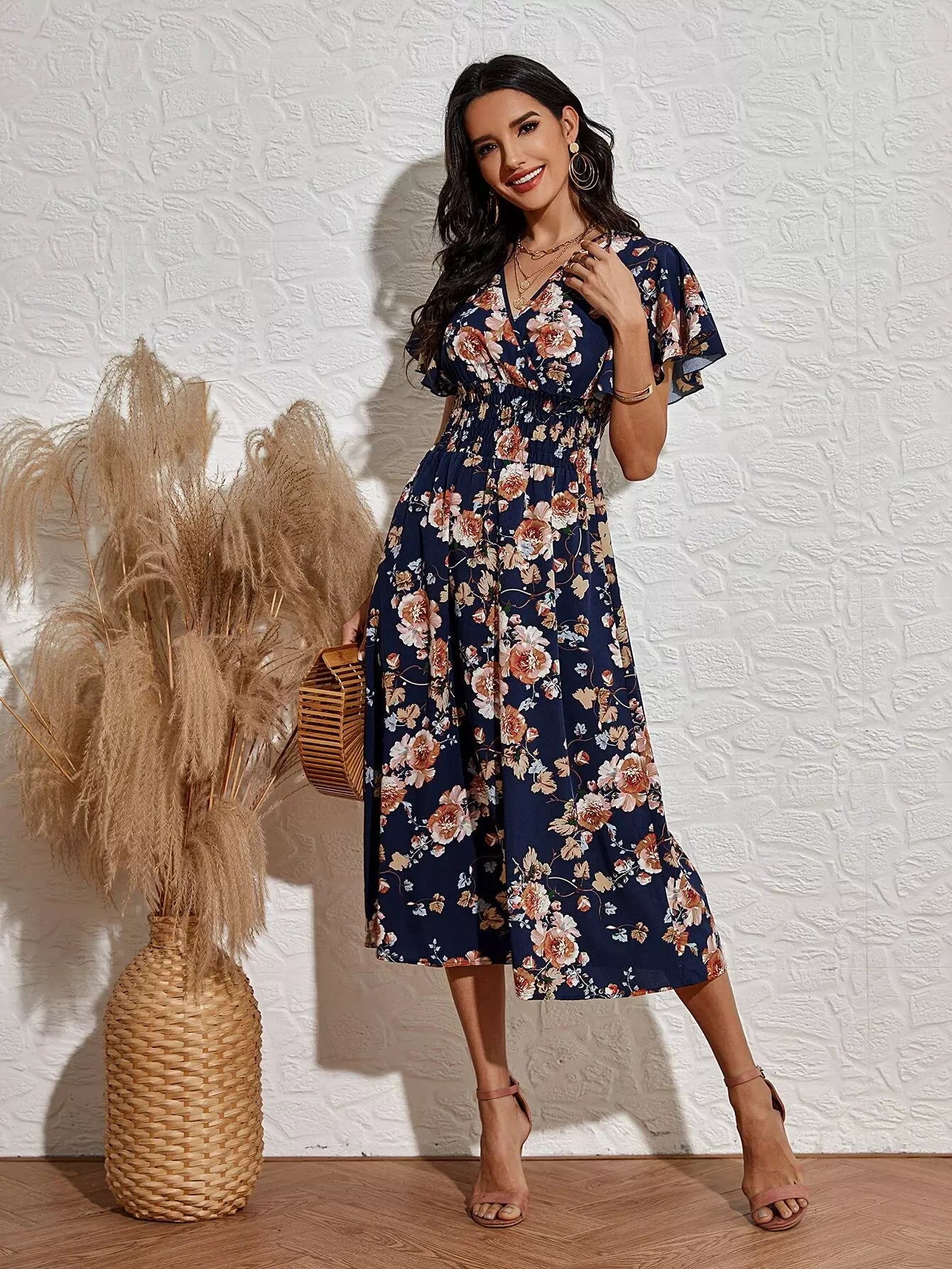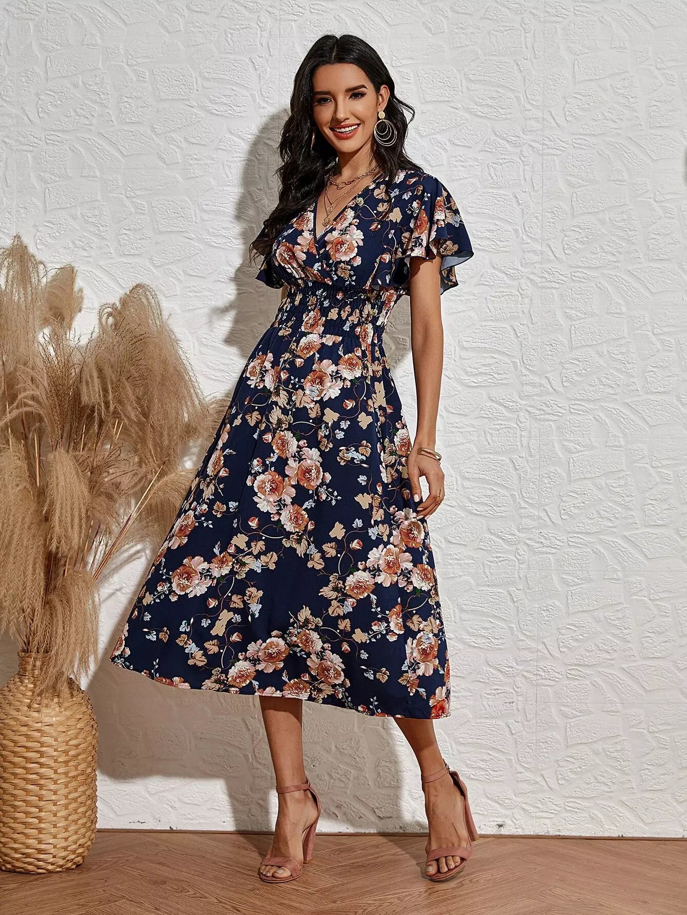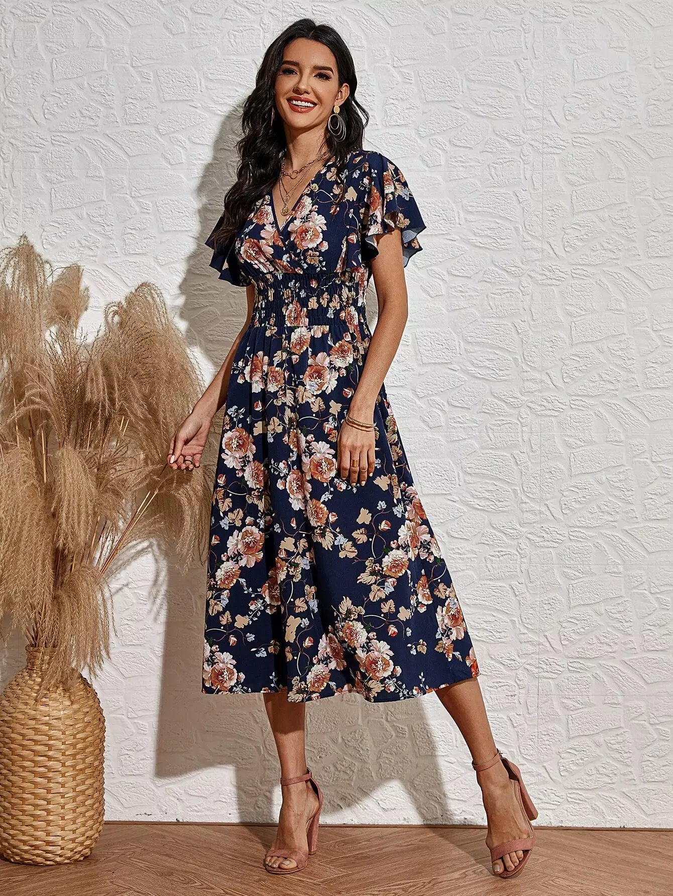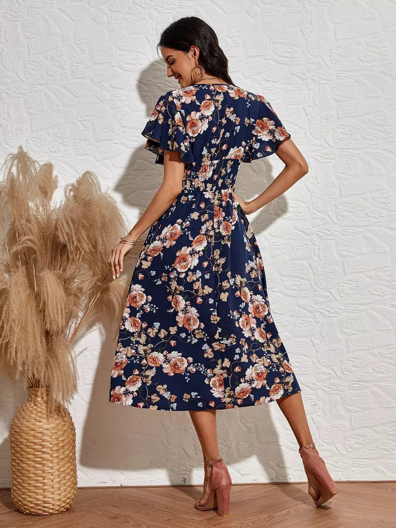 فستان بأكمام زهرية بأكمام أمامية بأكمام رفرفة على شكل حرف A