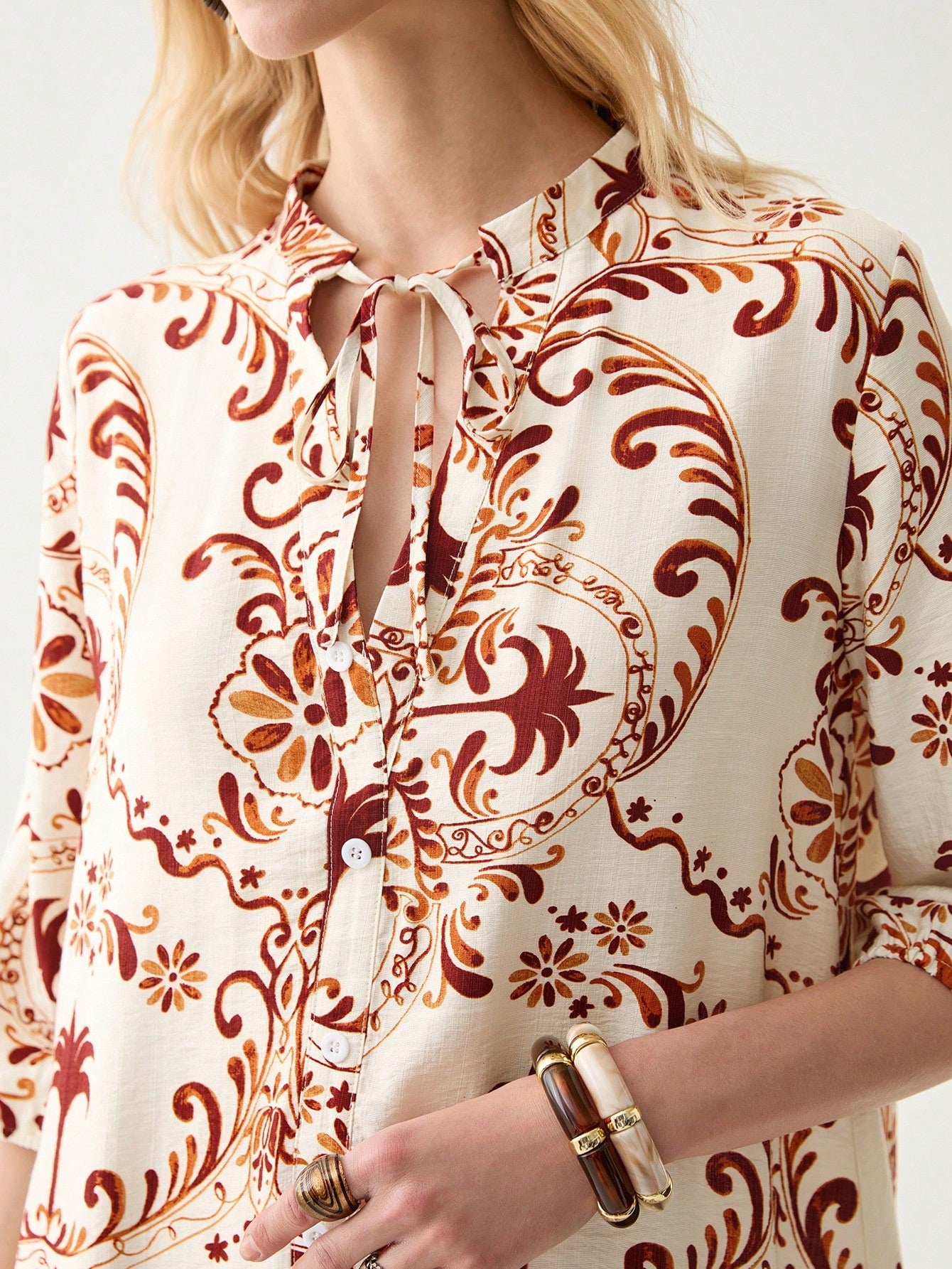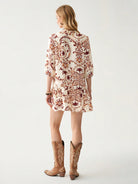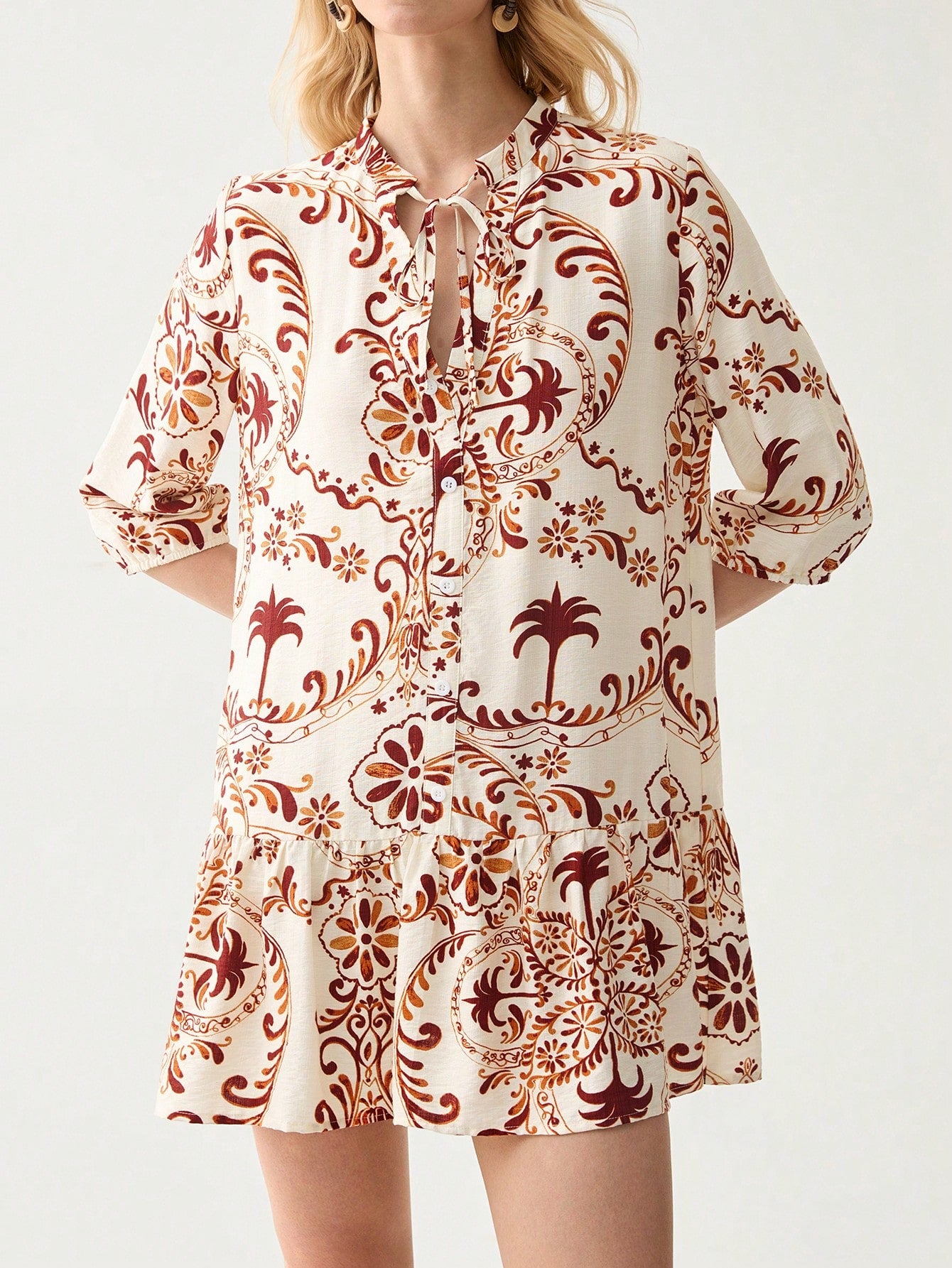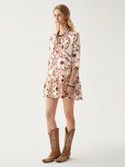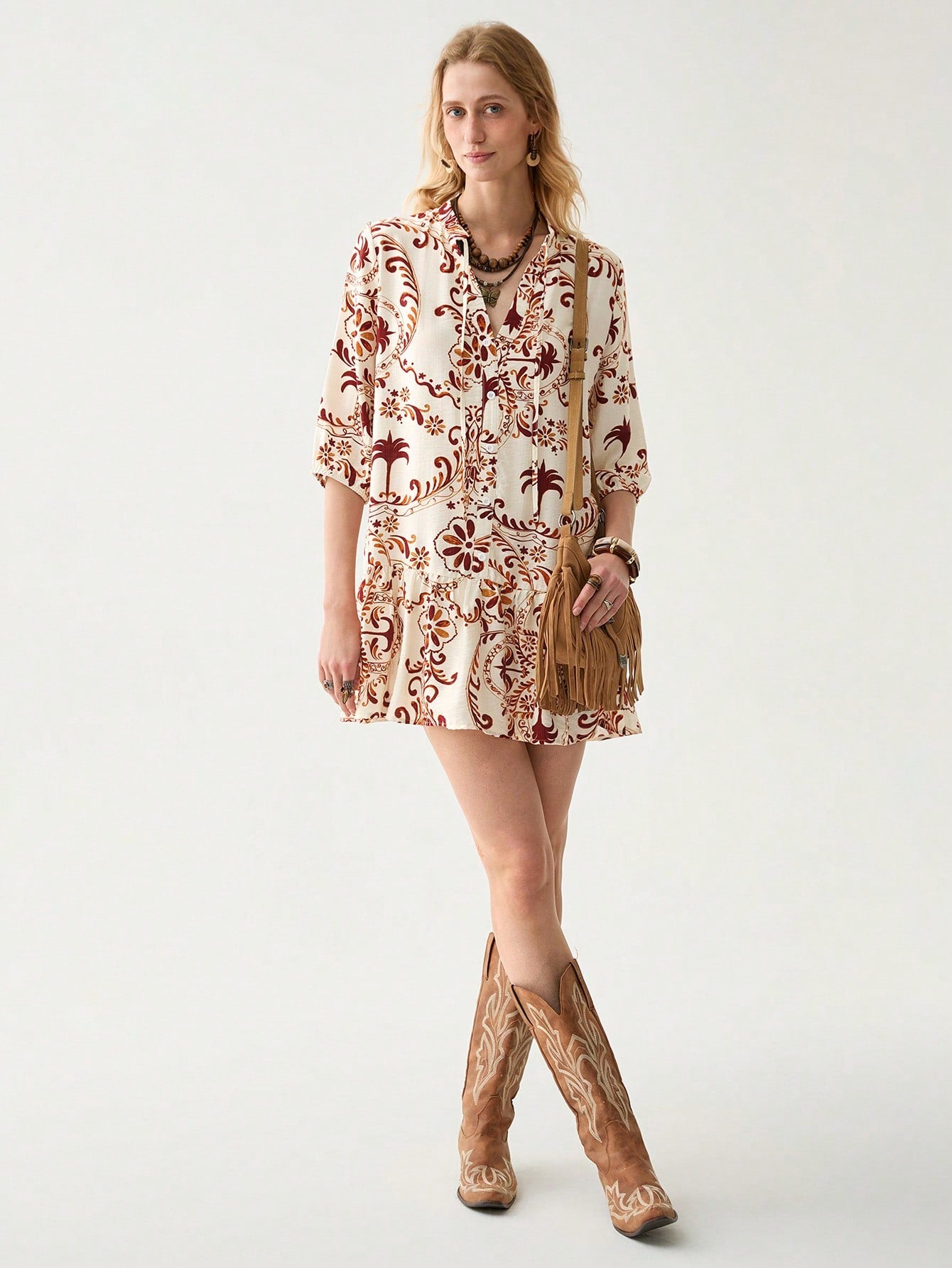 فستان فلوريسول نسائي قصير بتصميم بوهو بأكمام ثلاثة أرباع وحاشية مكشكشة