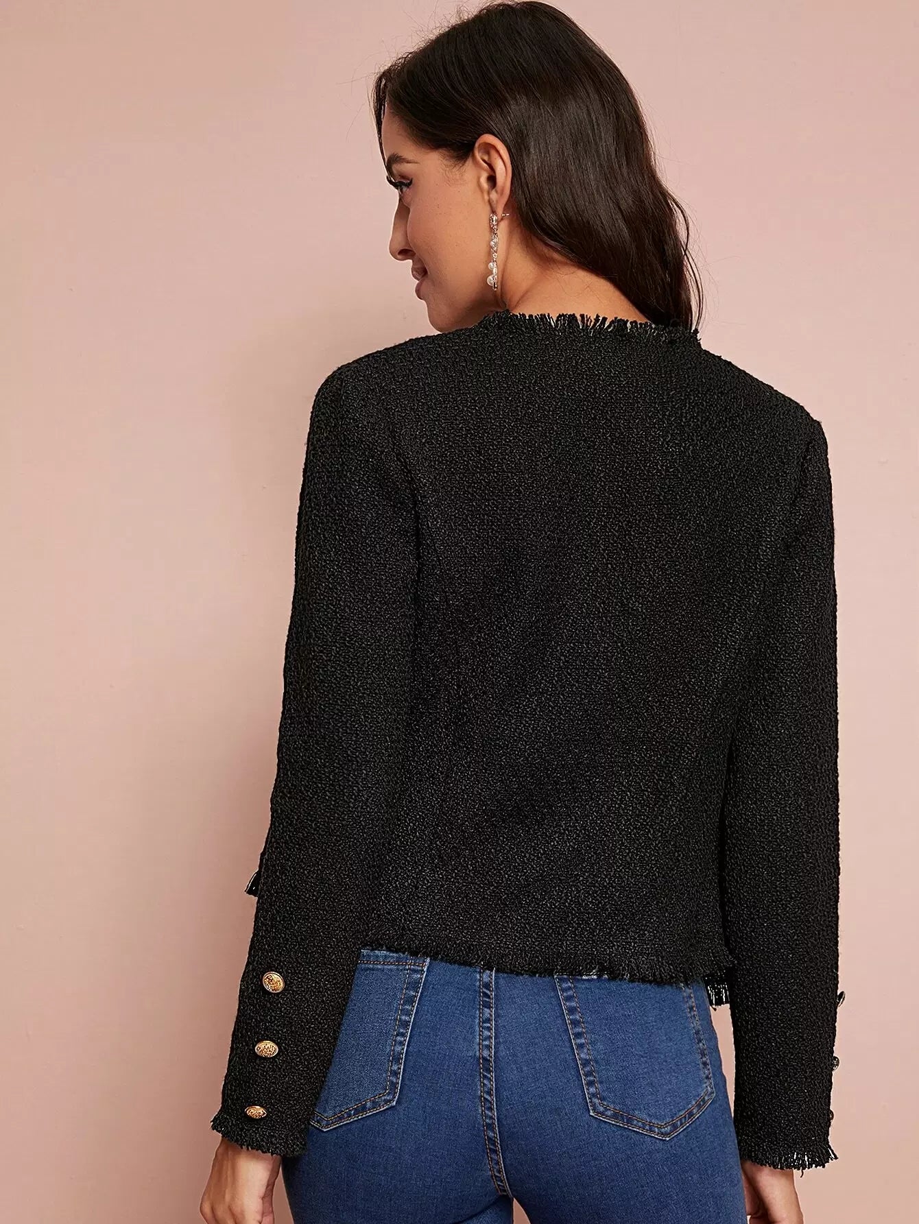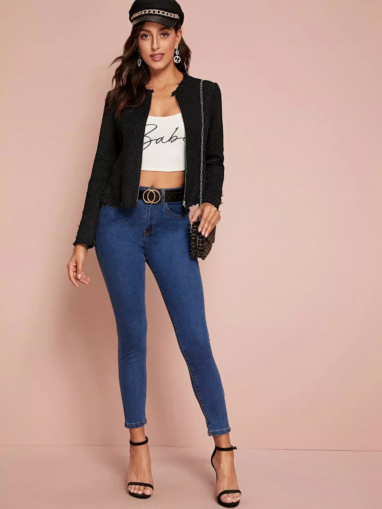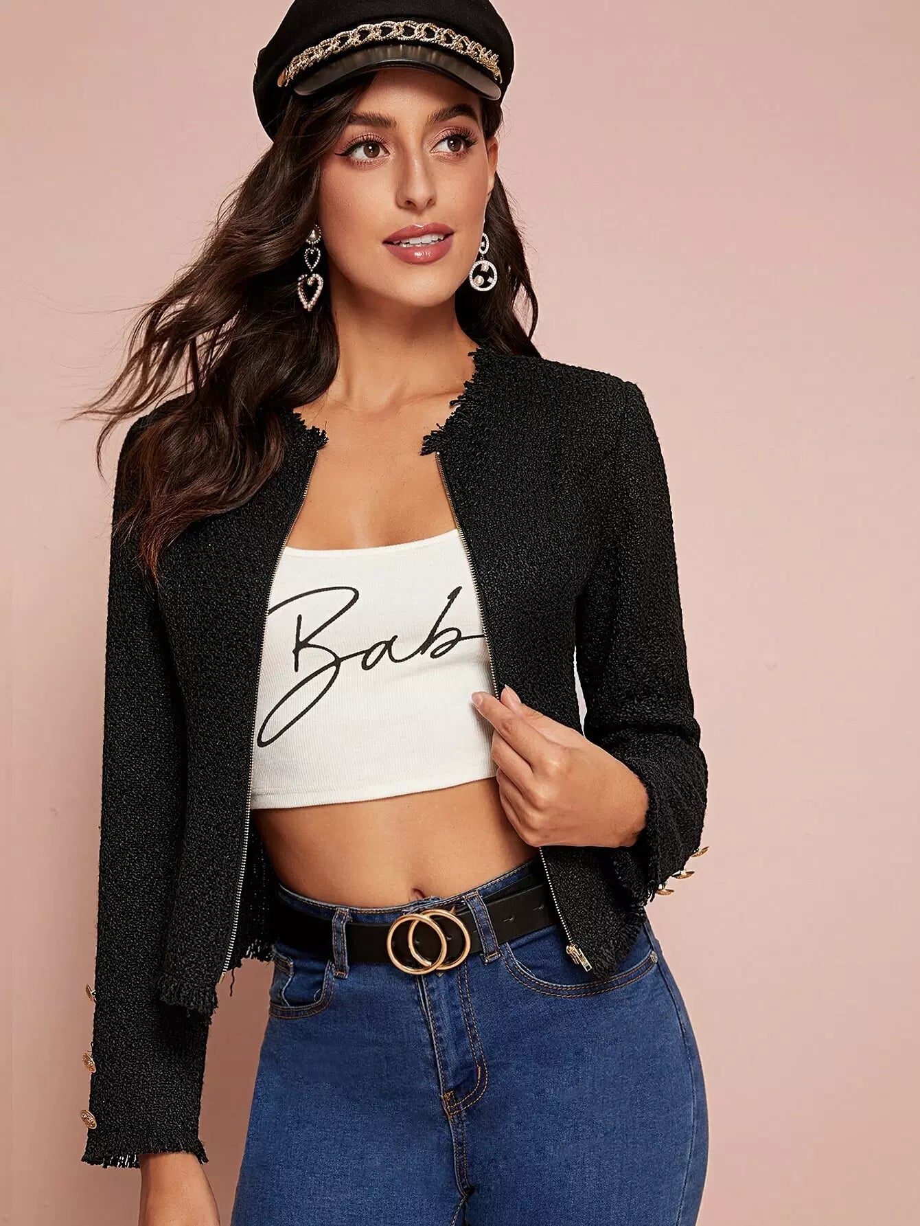 جاكيت تويد بحافة مهترئة بسحاب للأعلى