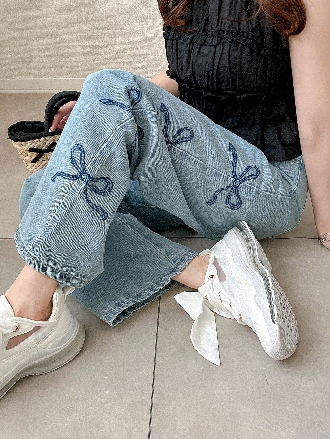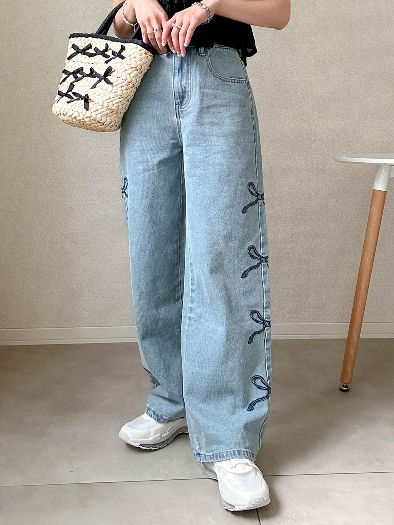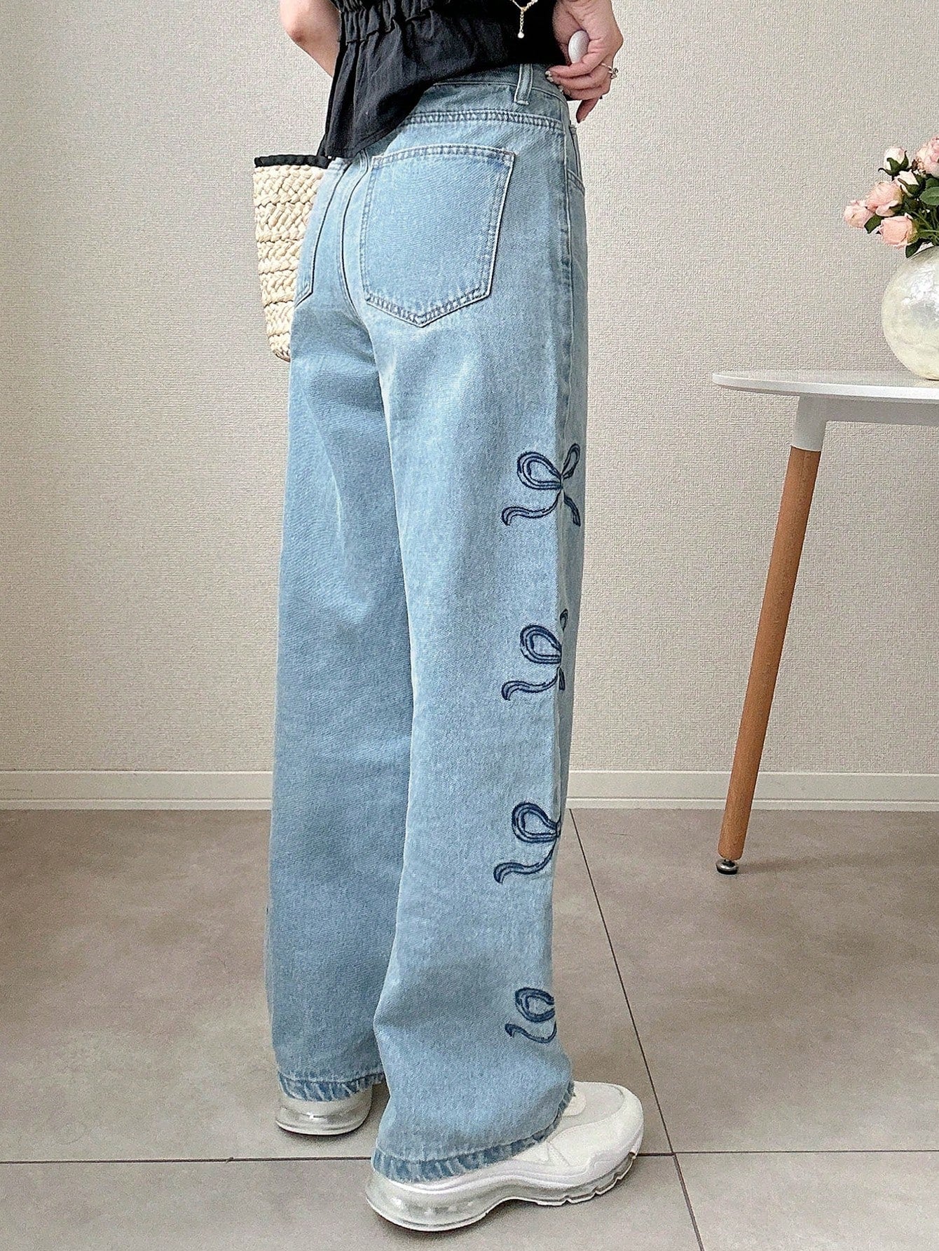 بنطلون جينز نسائي أزرق مستقيم الساق بخصر مرتفع من FRIFUL مع تطريز على شكل فراشة