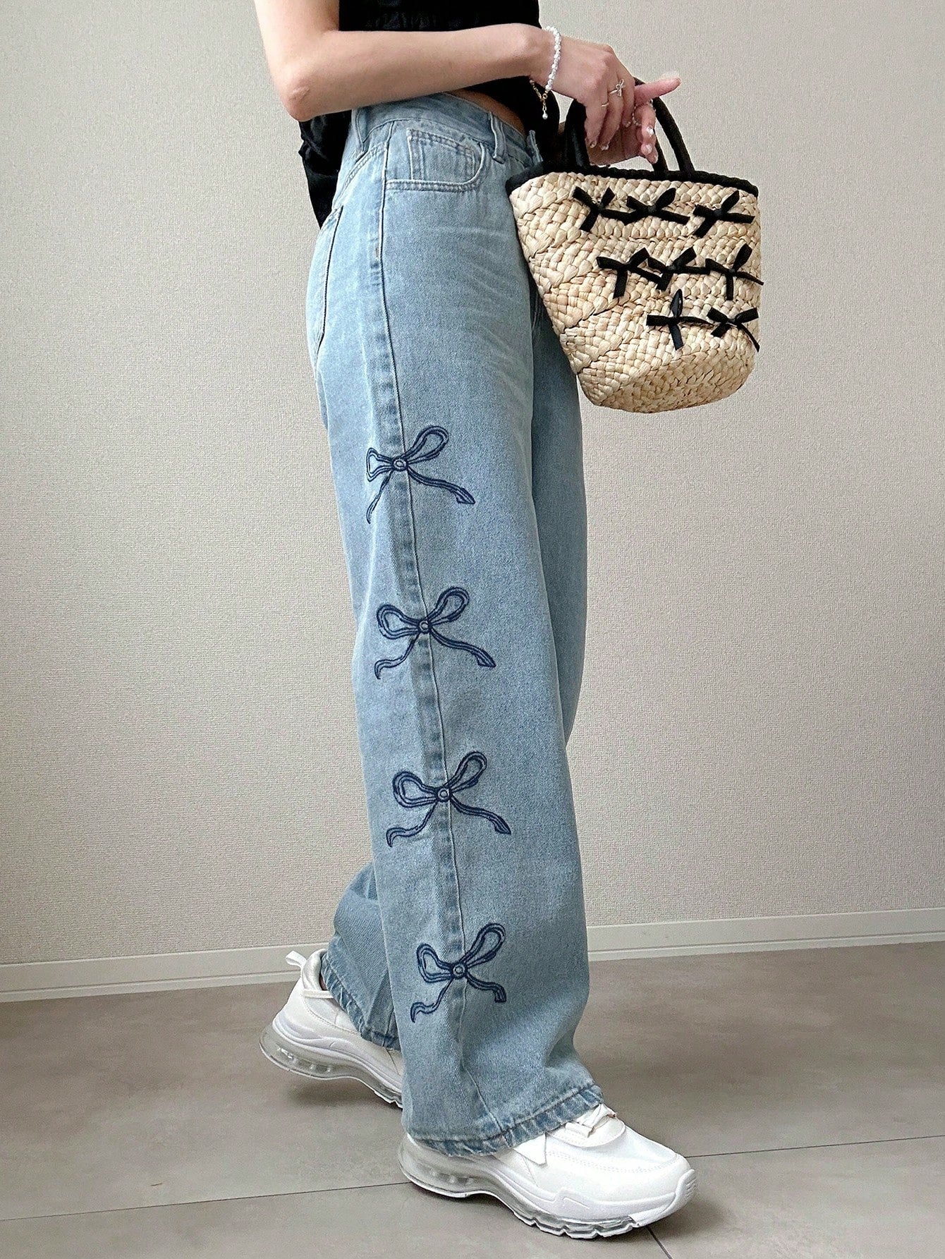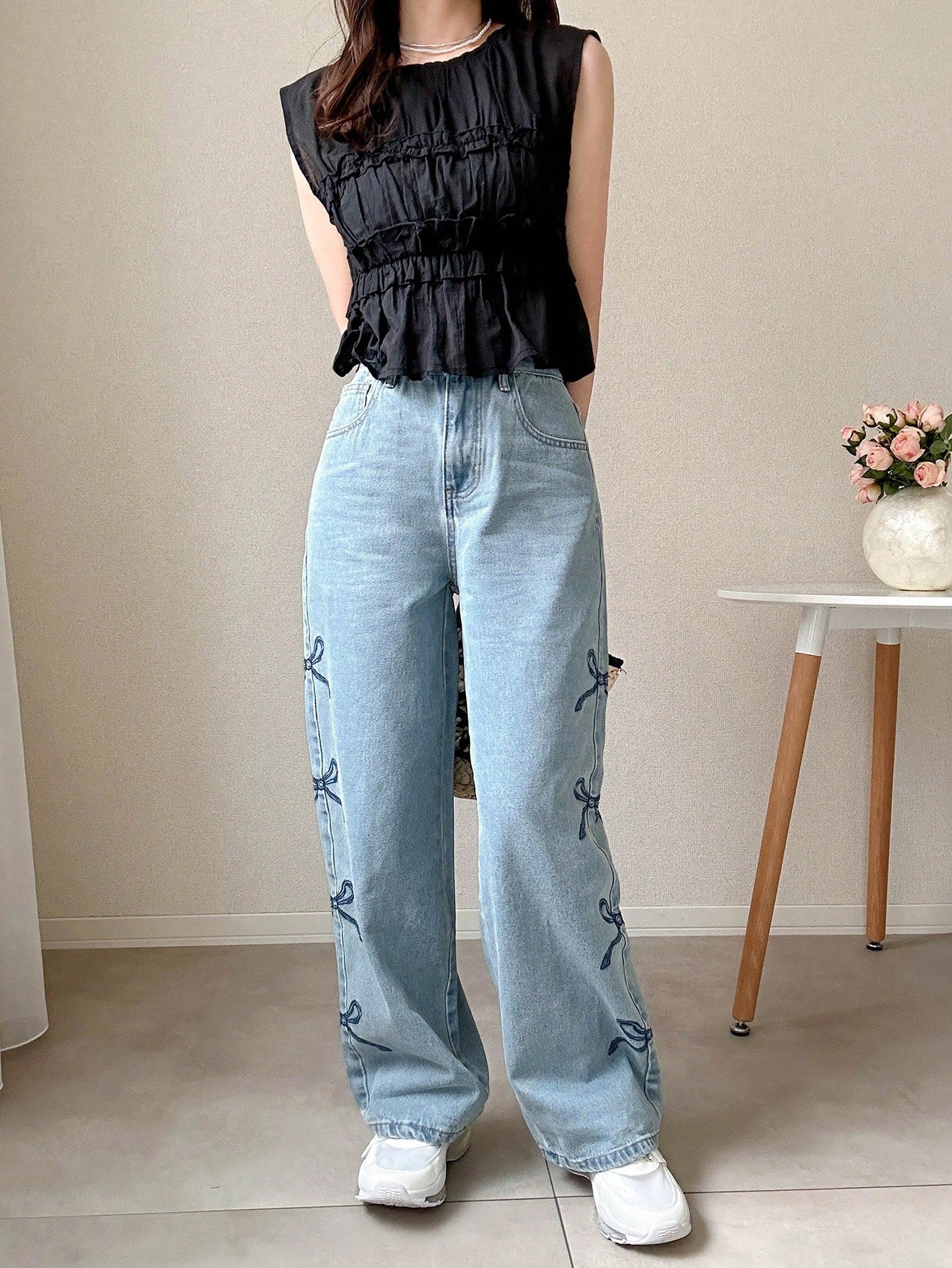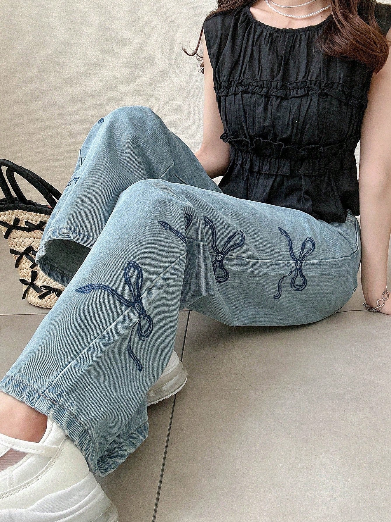 بنطلون جينز نسائي أزرق مستقيم الساق بخصر مرتفع من FRIFUL مع تطريز على شكل فراشة