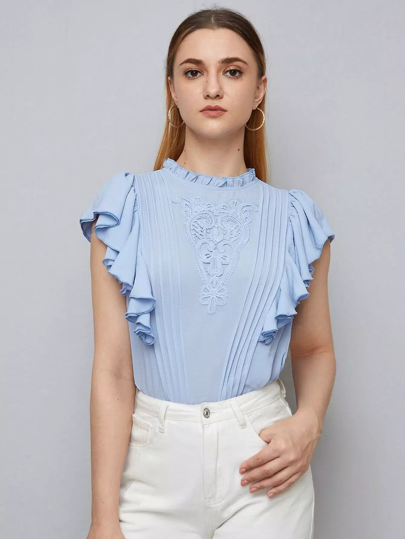 بلوزة بياقة كشكش بأكمام فراشة بأكمام دانتيل مفصلة