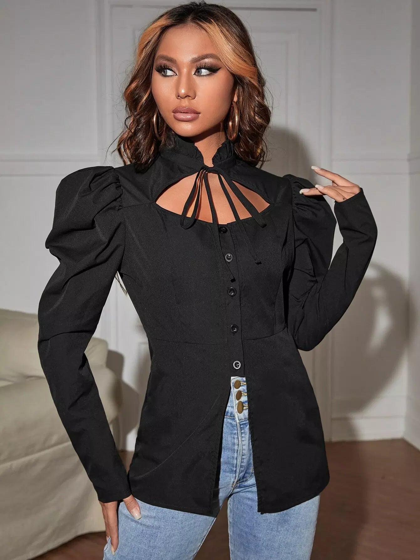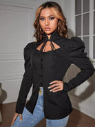 بلوزة بياقة كشكش بربطة عنق مقصوصة بفتحة أكمام غير متناظرة