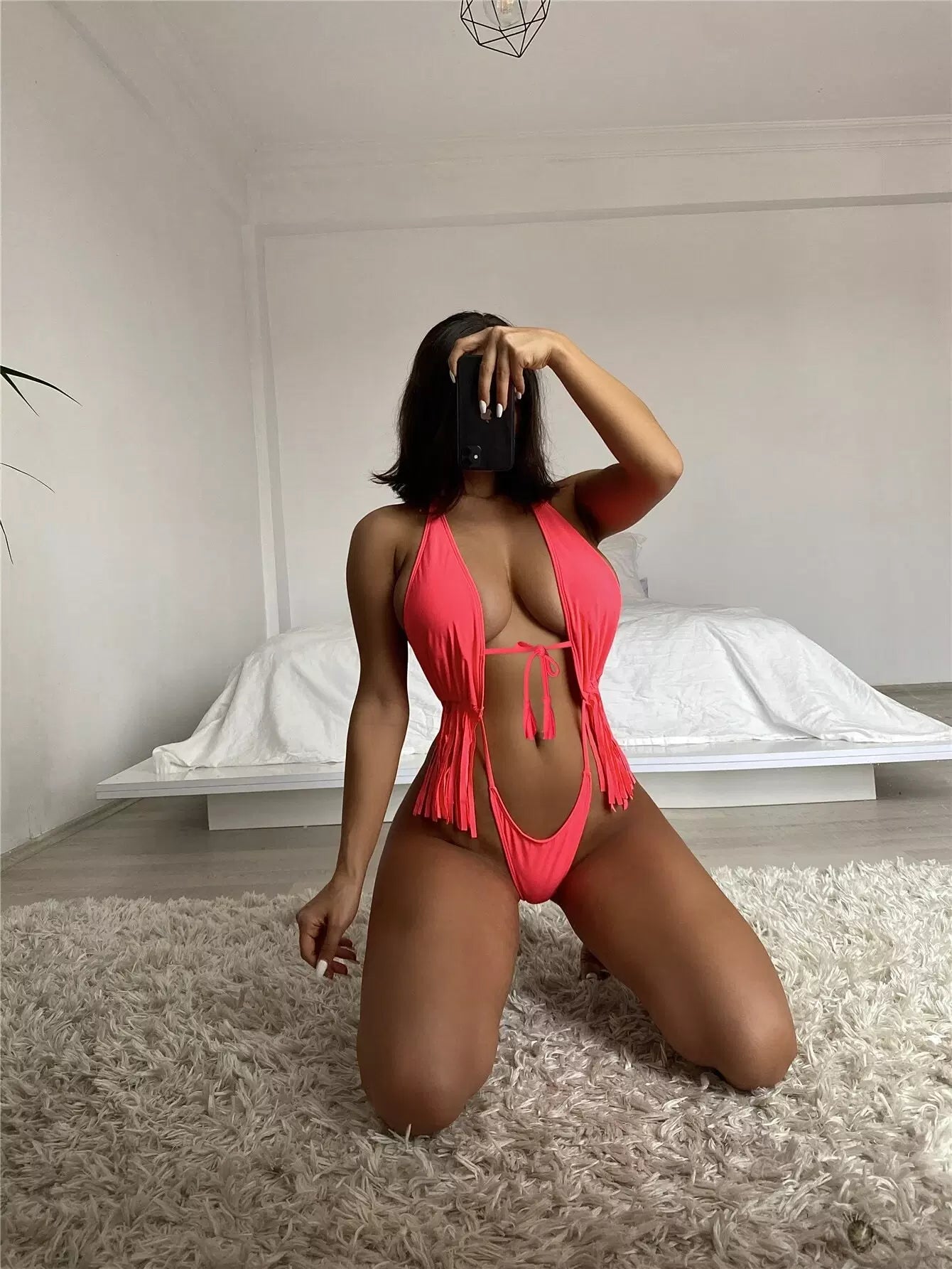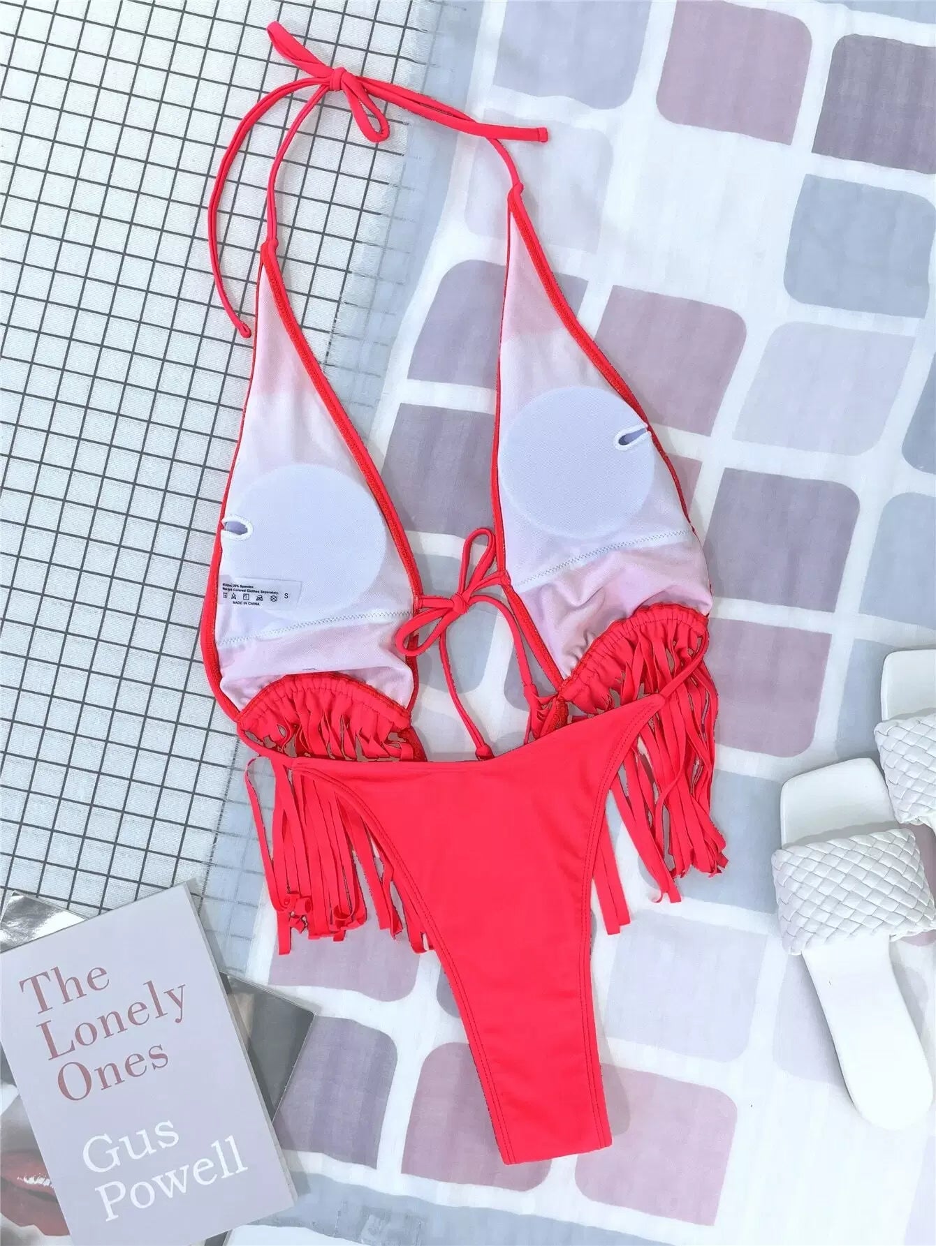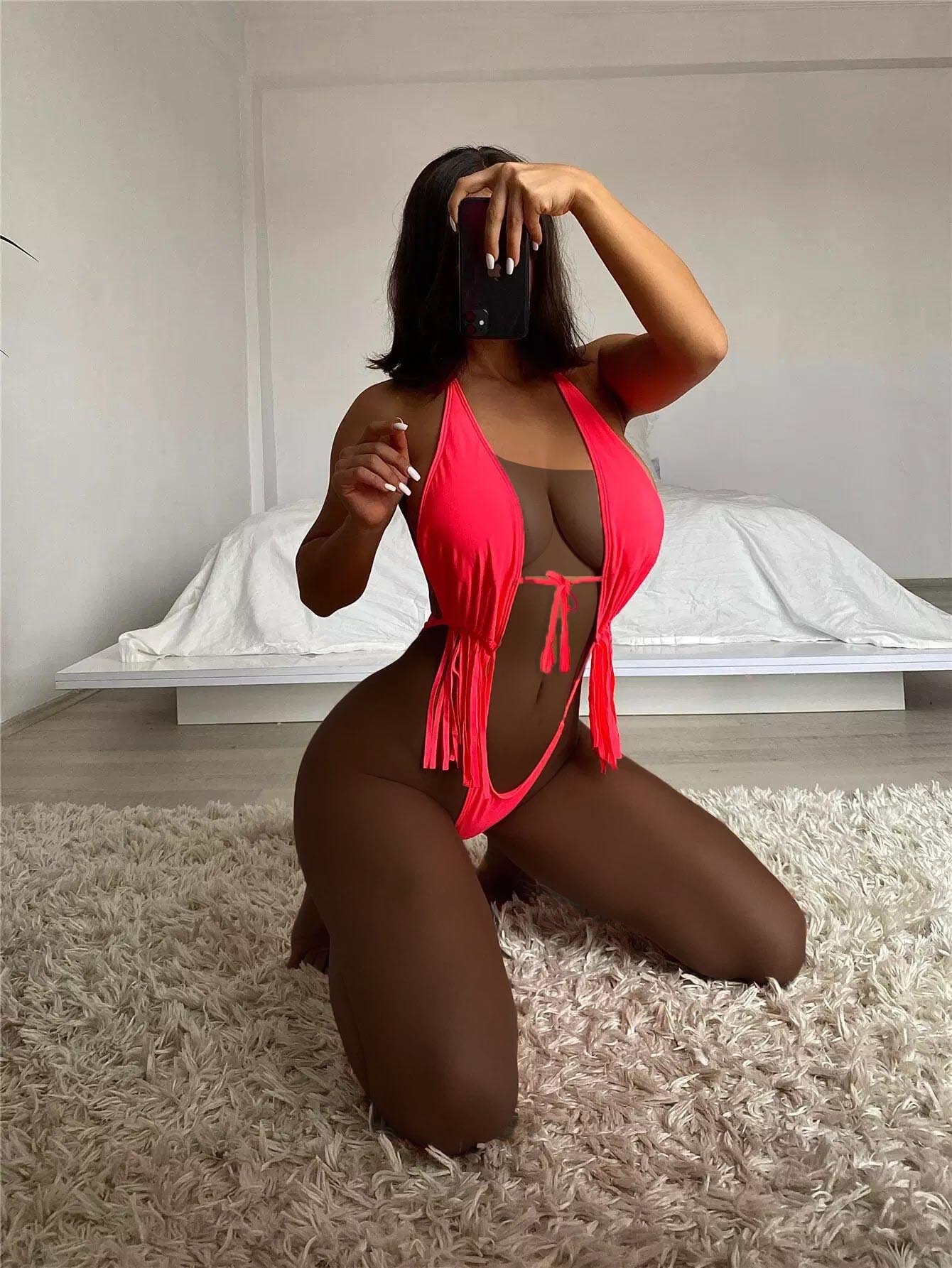 بدلة سباحة بقطعة واحدة من قطعة واحدة ذات حافة رباط بحافة هدب متدلية