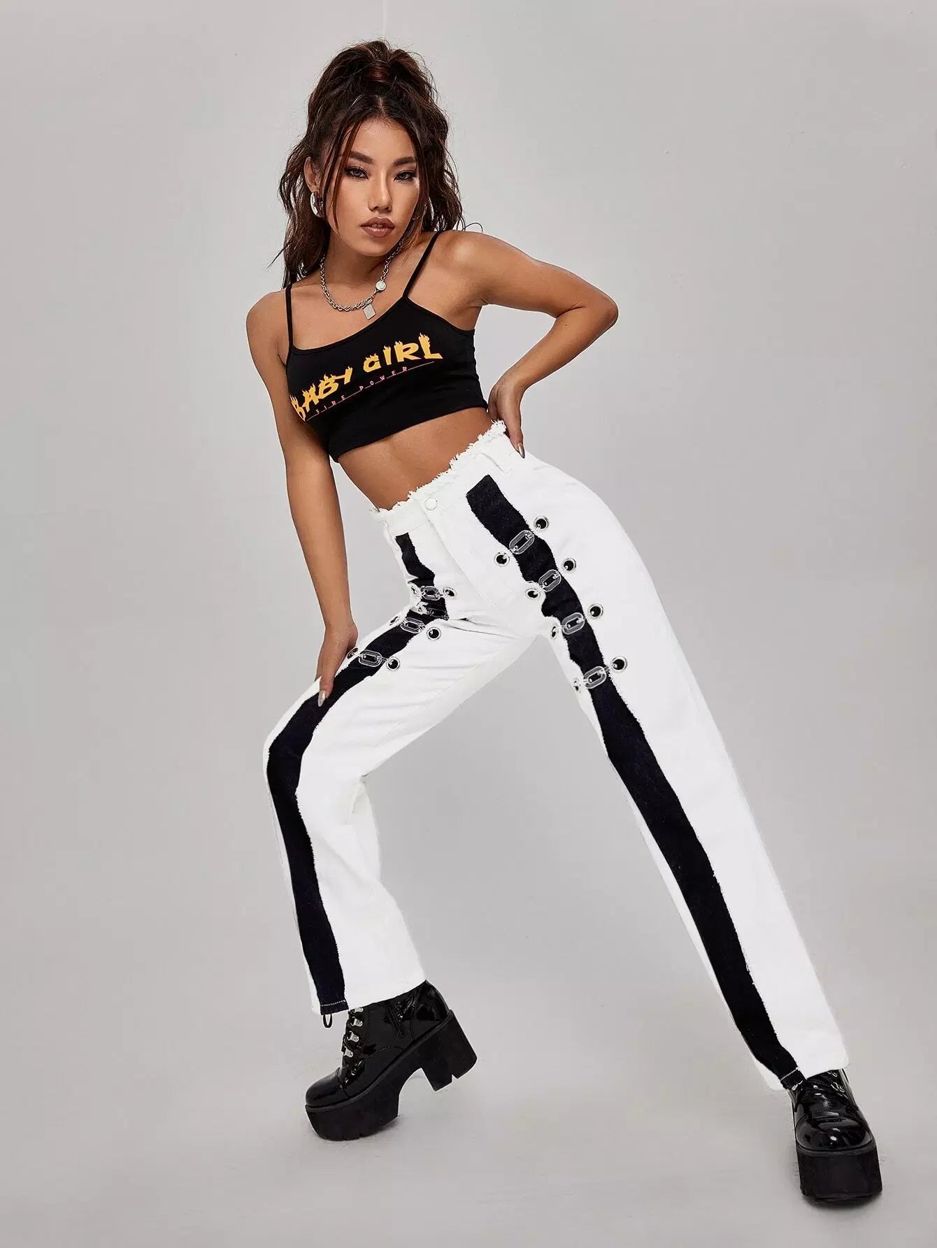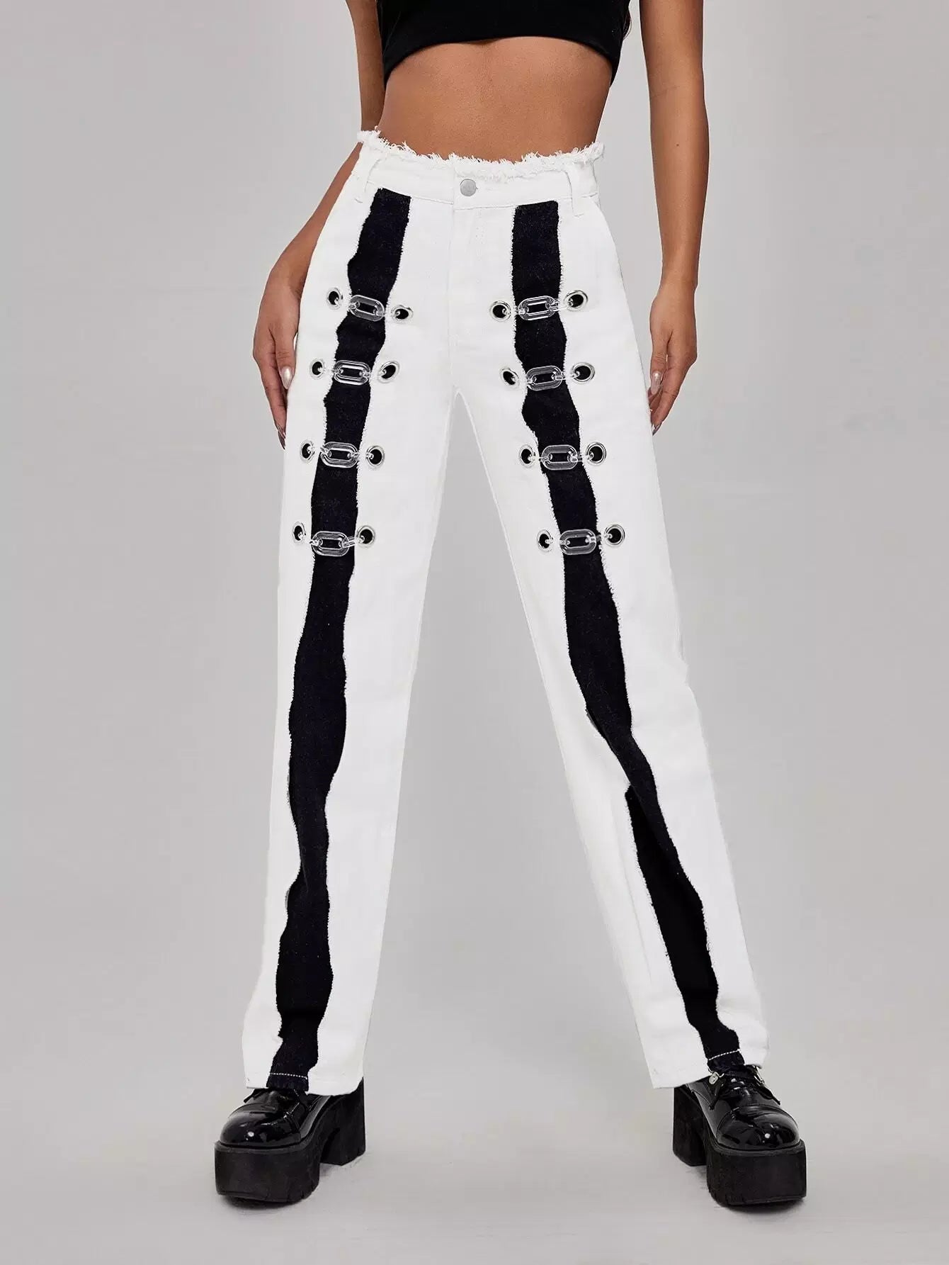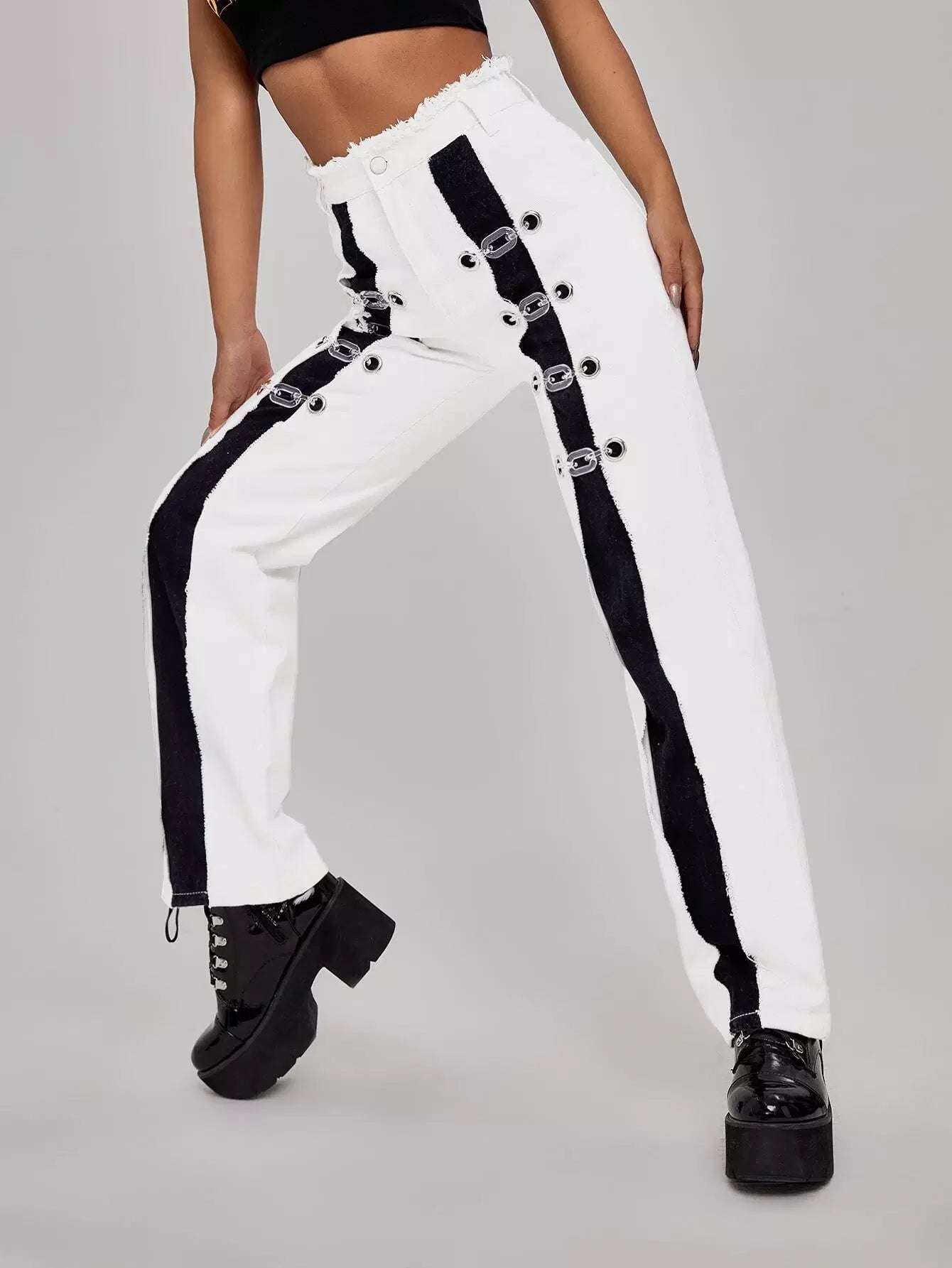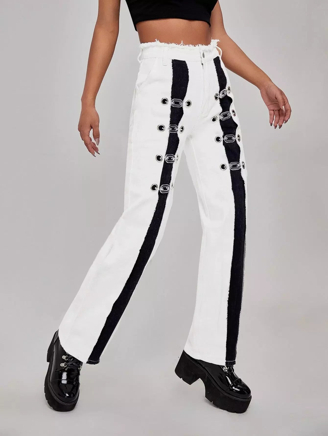 بنطلون جينز جينز ملون مزين بفتحات على شكل ثقوب في الملابس