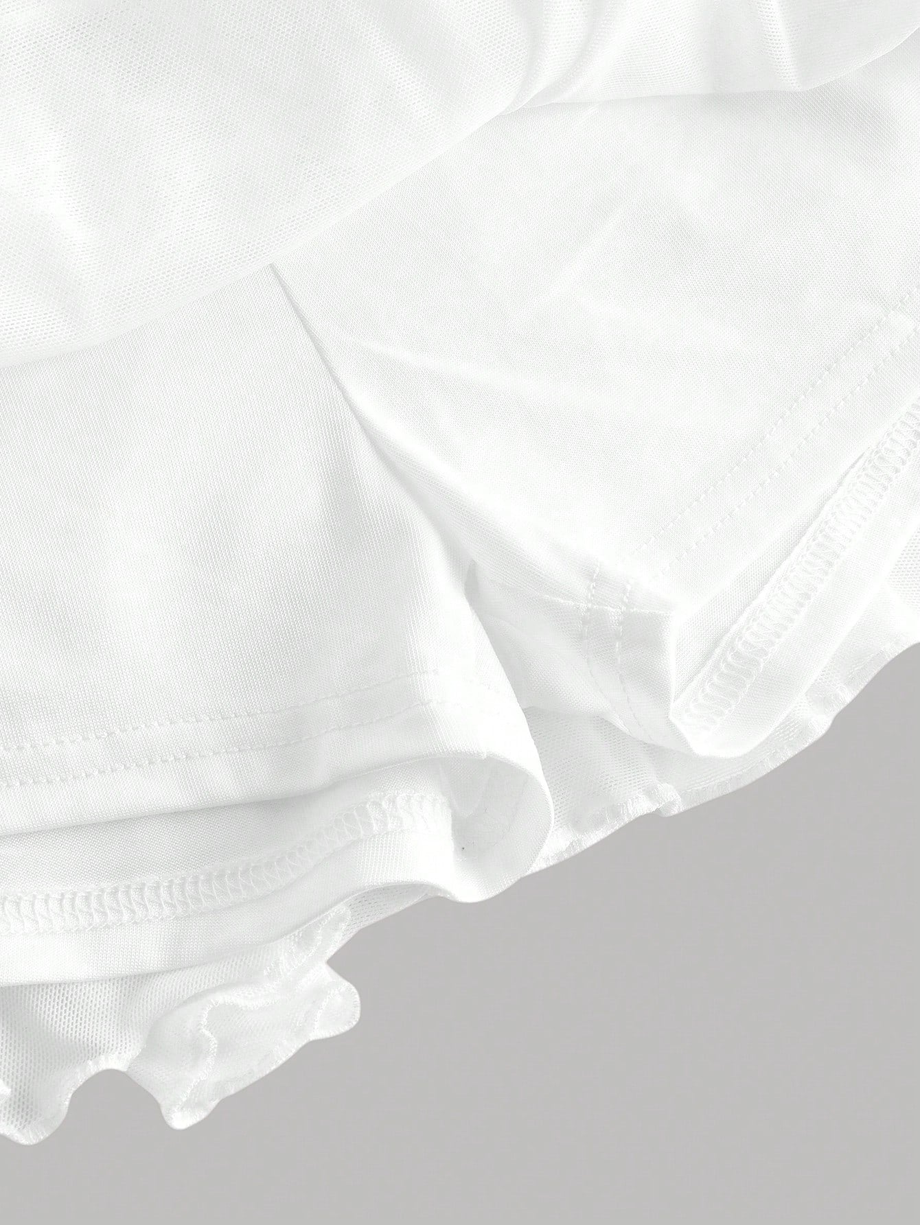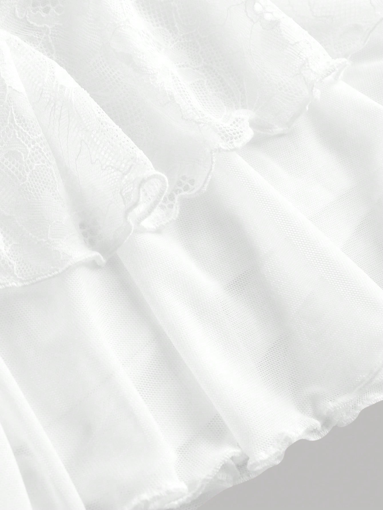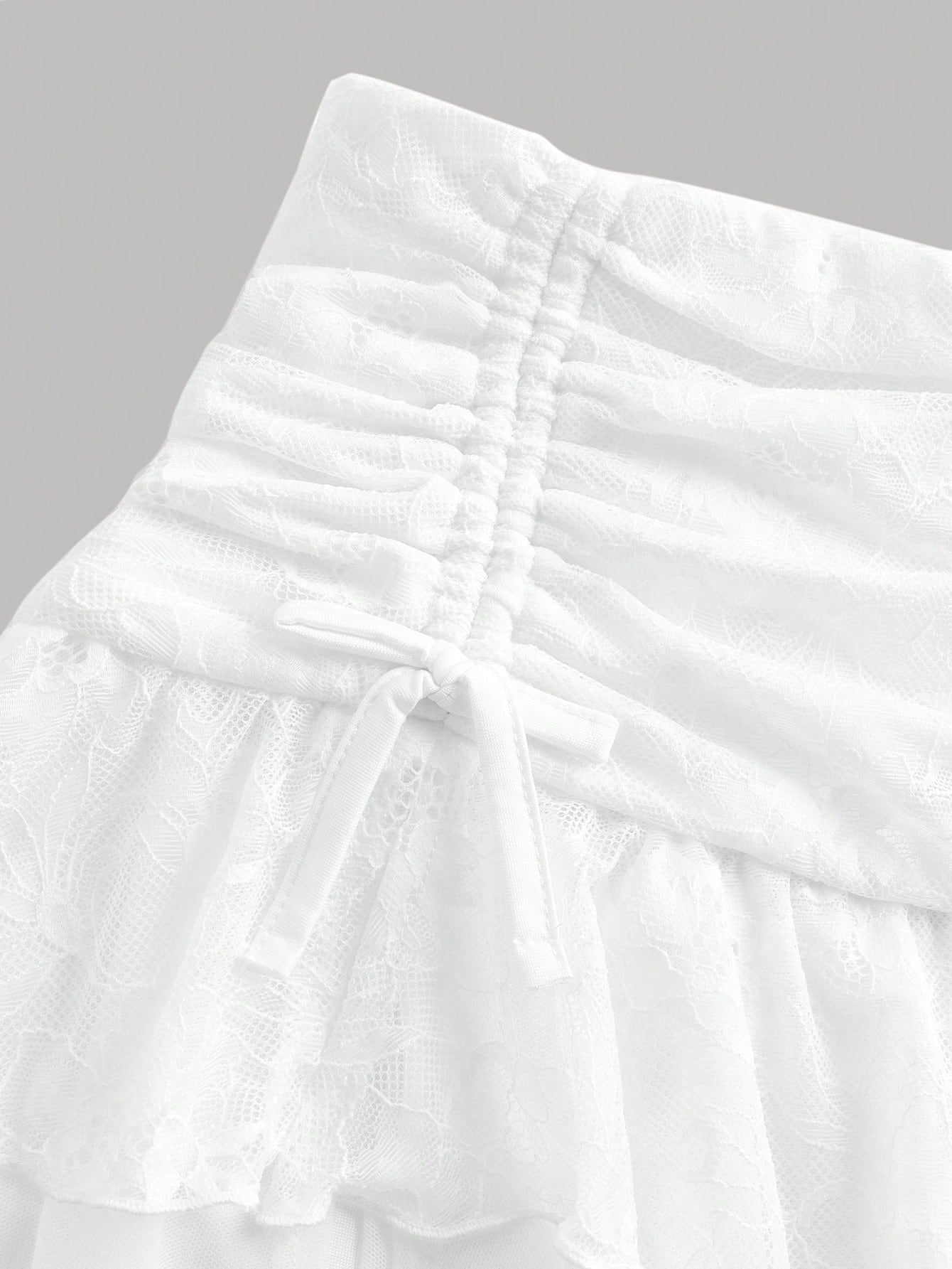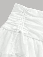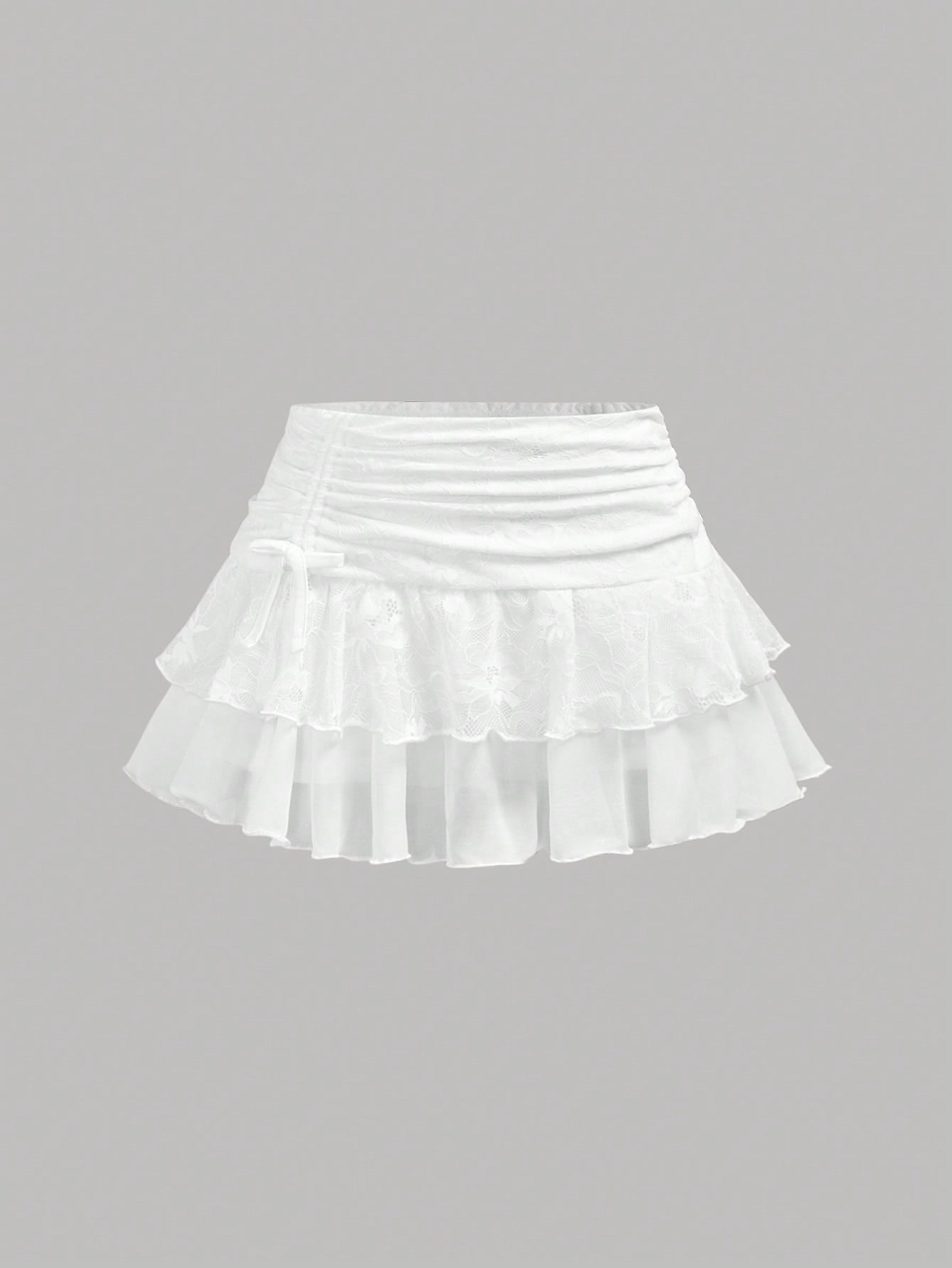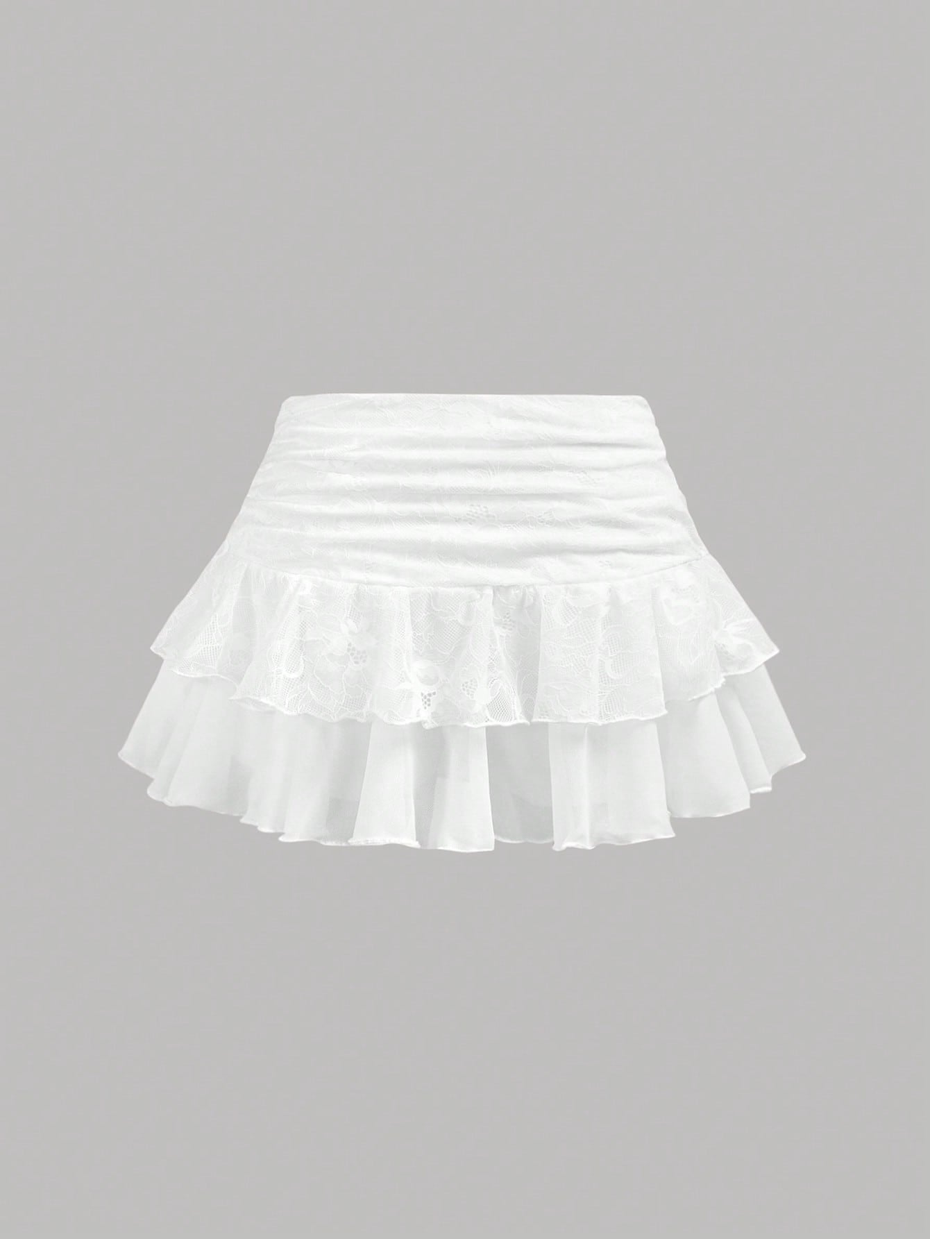 تنورة قصيرة من الدانتيل الشبكي بطبقتين من Girlism Teen Girl، مناسبة لفصلي الربيع والصيف، بتصميم مستوحى من موضة الألفية الجديدة. تتميز بقصة منخفضة الخصر، وتفاصيل مكشكشة، ورباط جانبي.