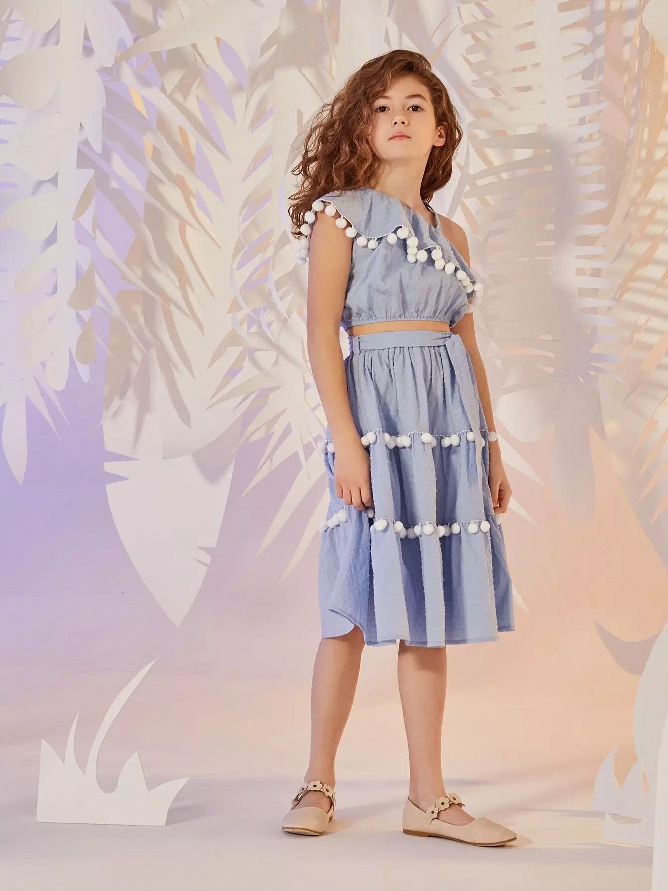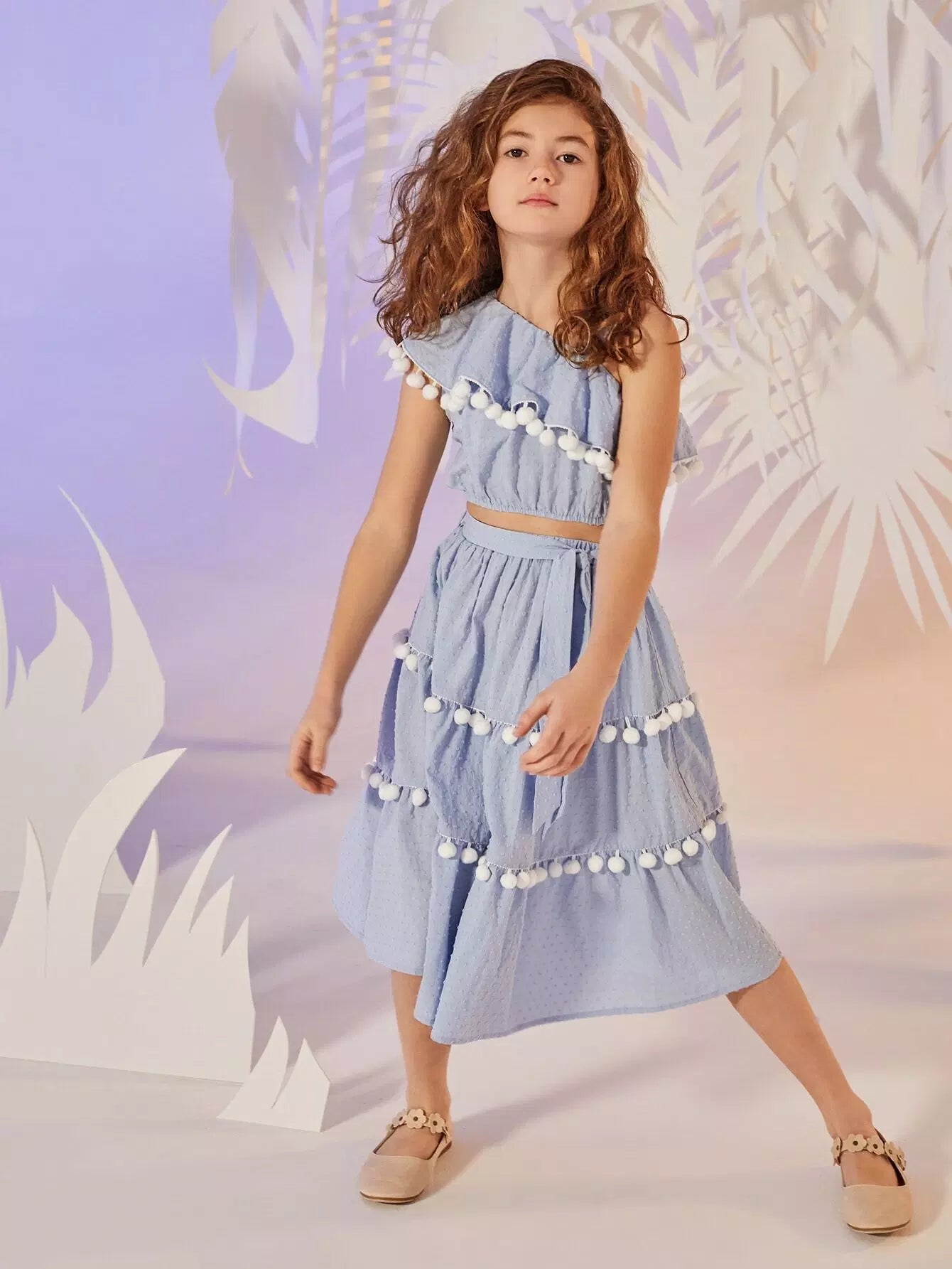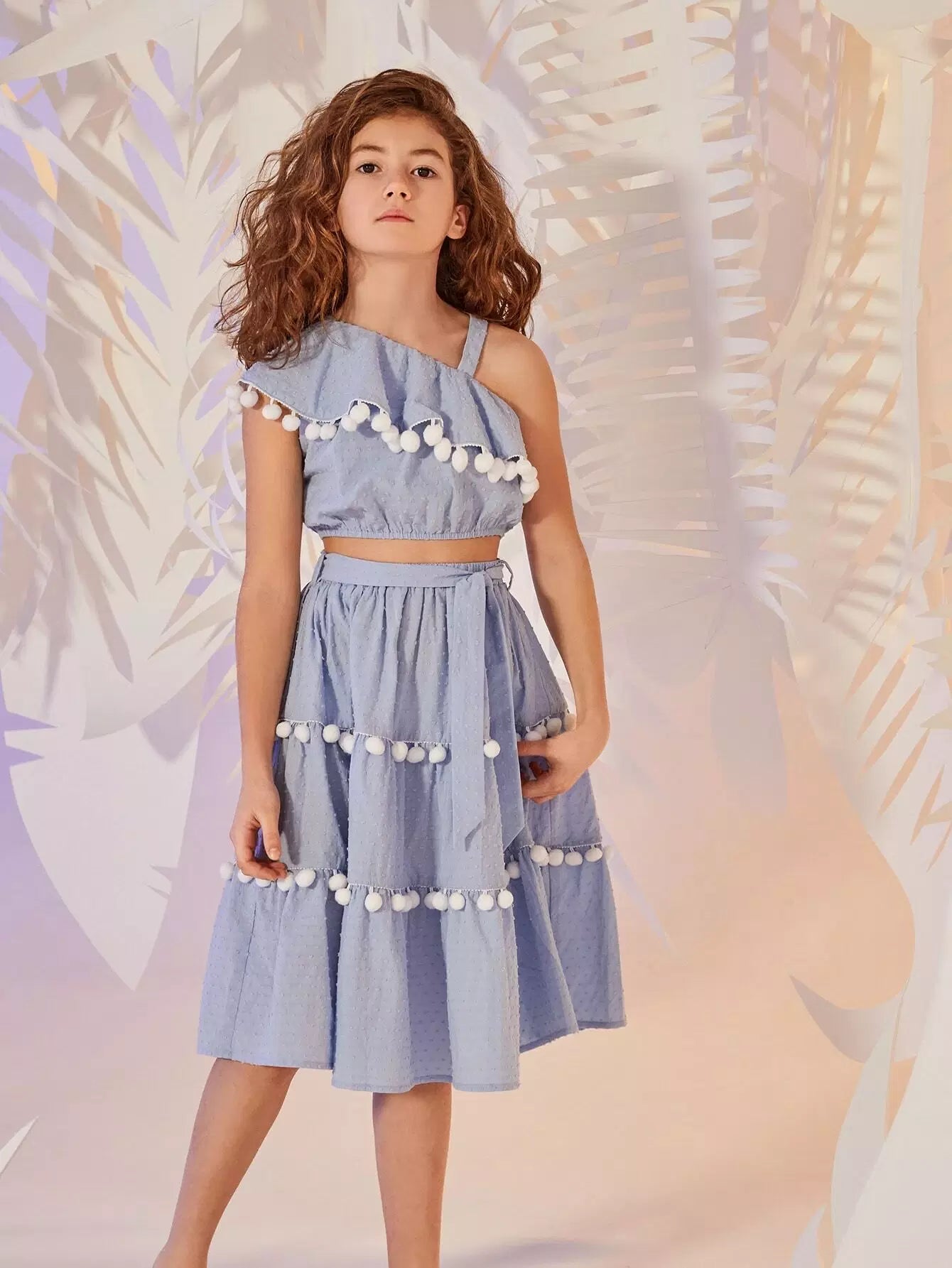 طقم تنورة وقميص من الكشكشة مع حافة كروية برقبة غير متماثلة للفتيات