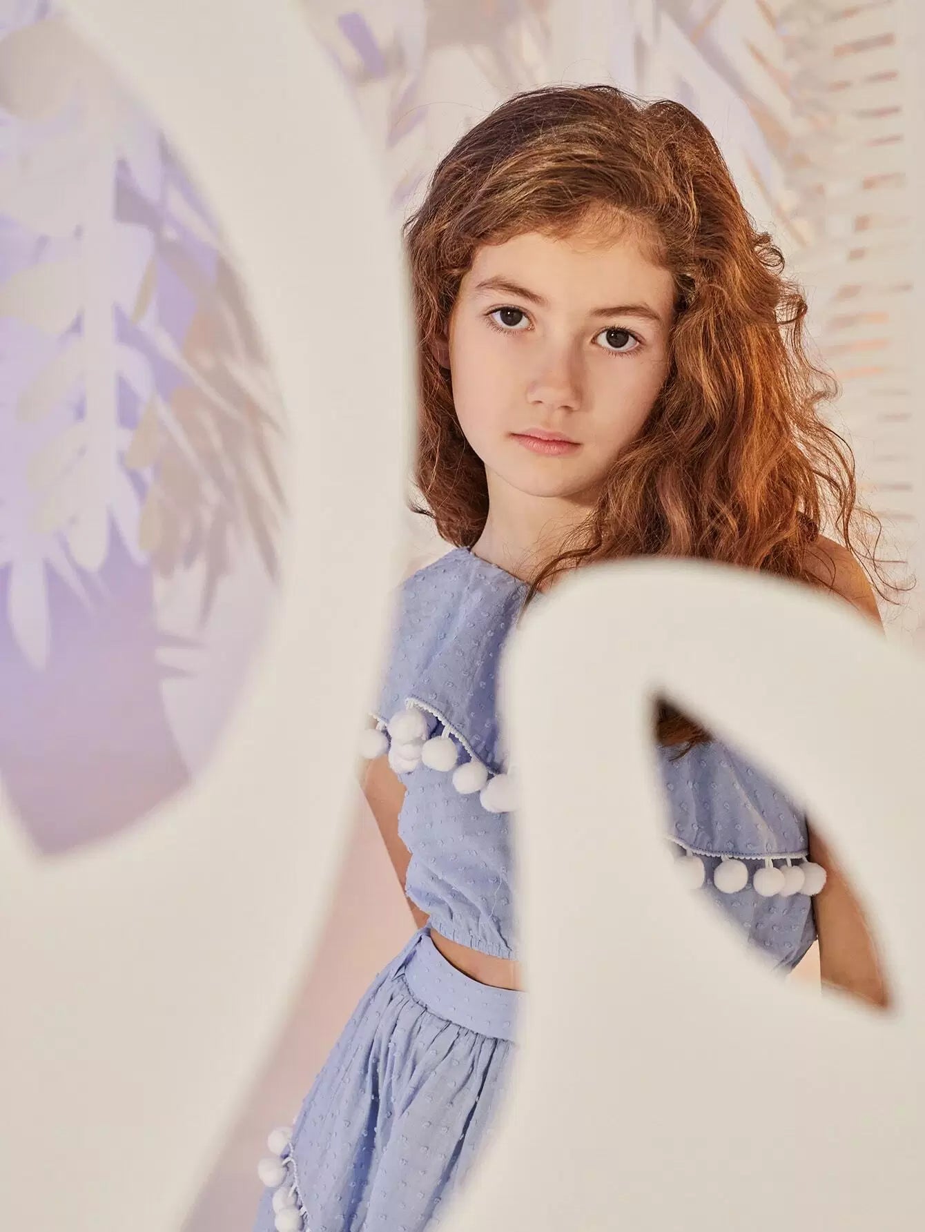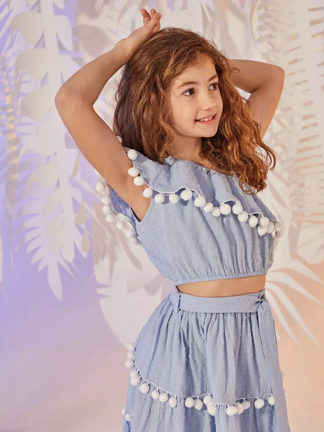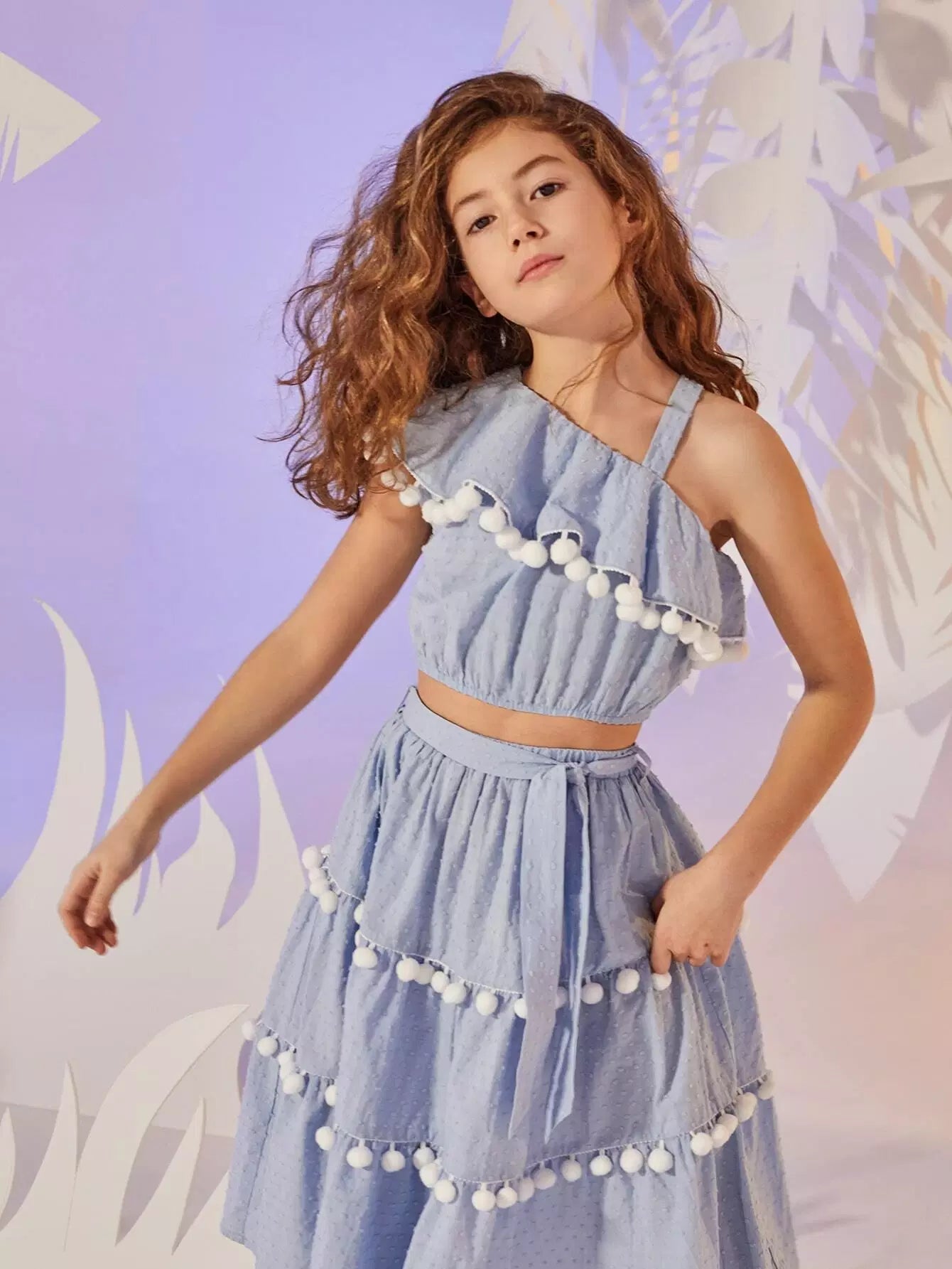 طقم تنورة وقميص من الكشكشة مع حافة كروية برقبة غير متماثلة للفتيات