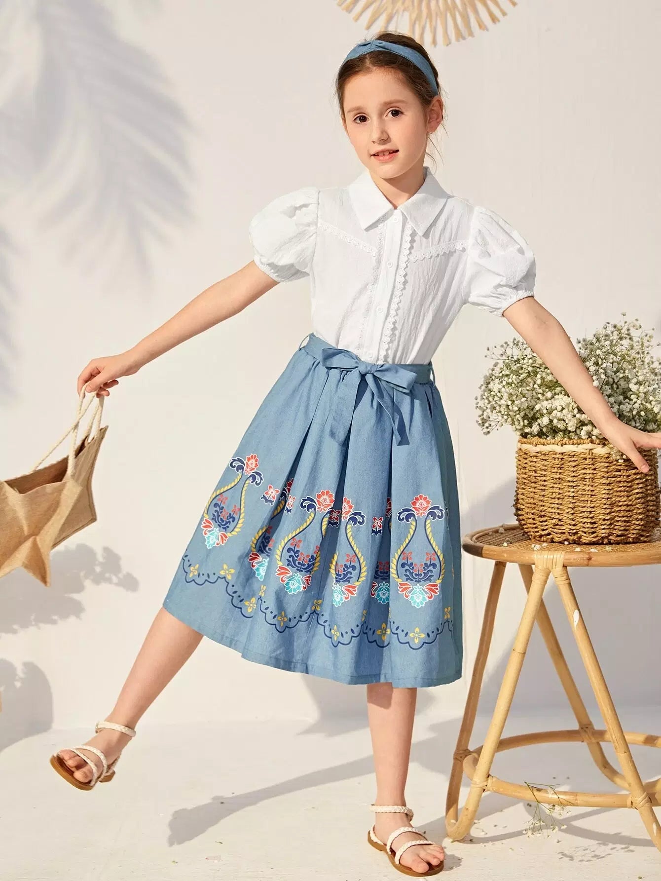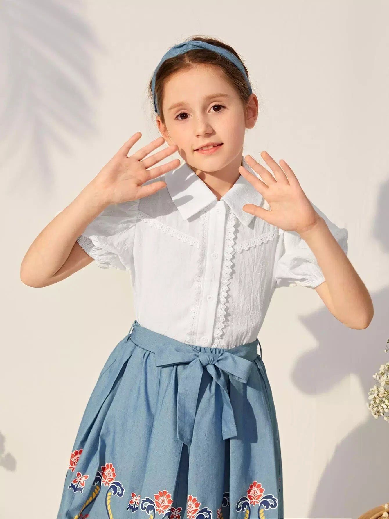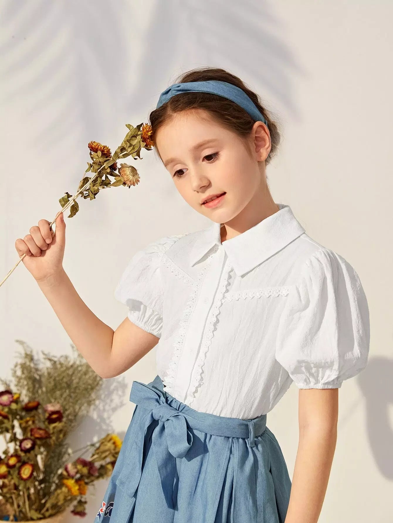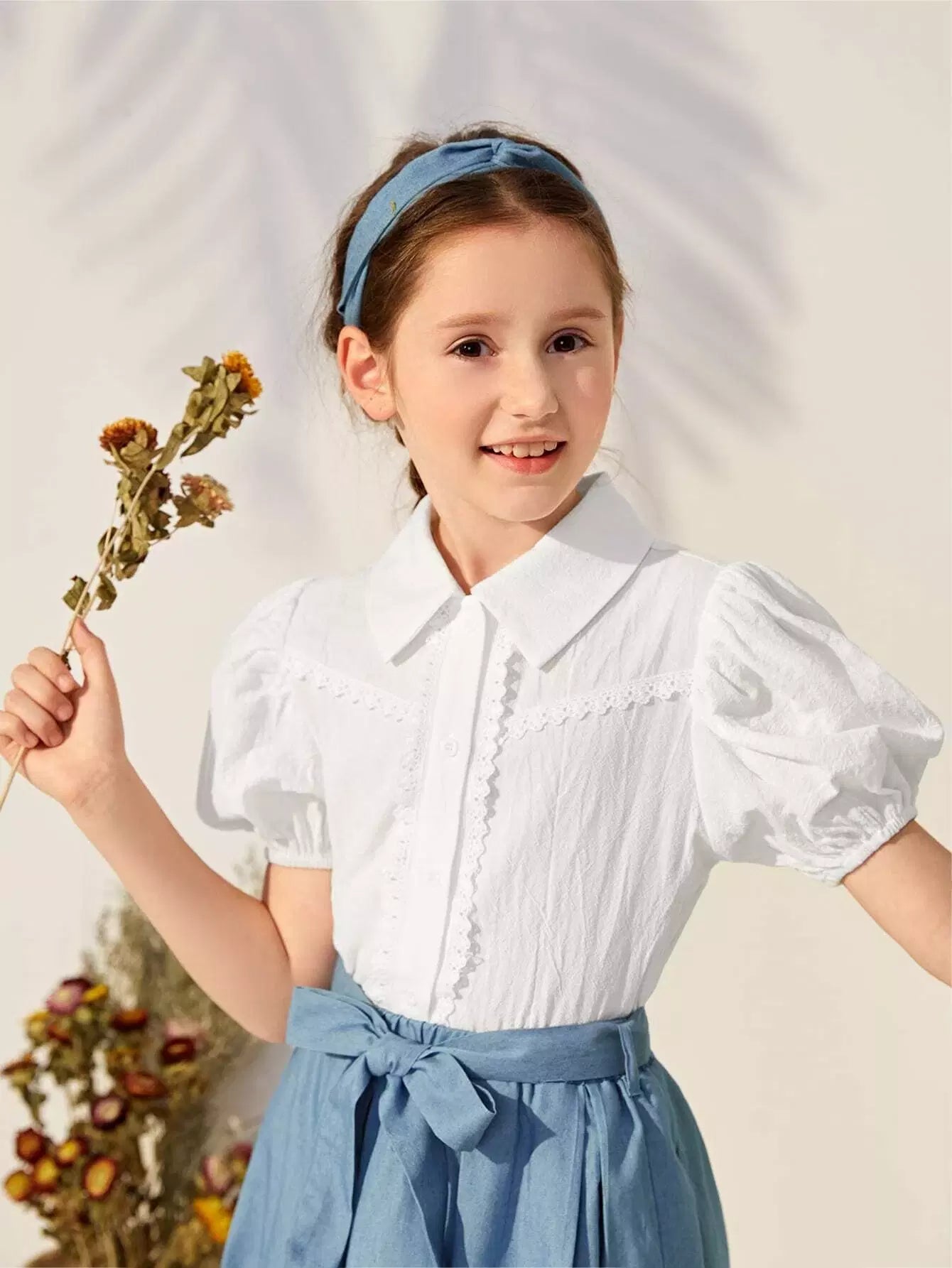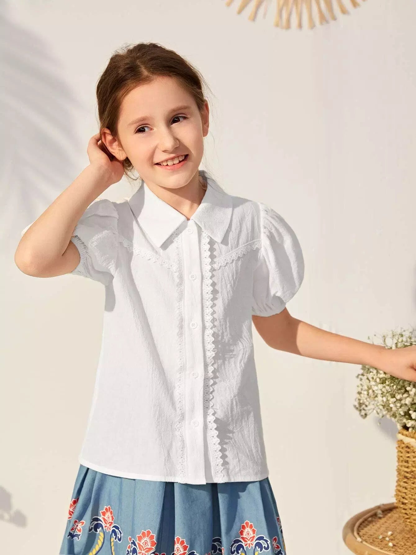 بلوزة بناتية بأكمام منفوخة وأزرار أمامية وتفاصيل دانتيل