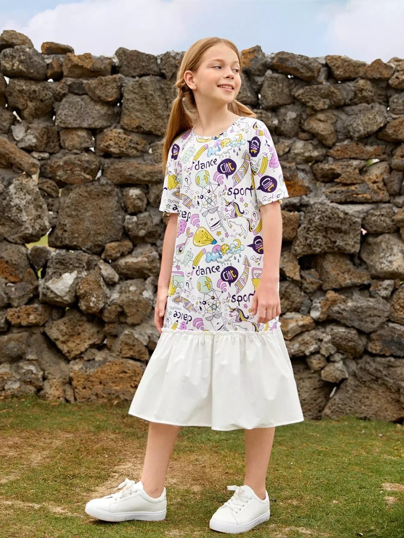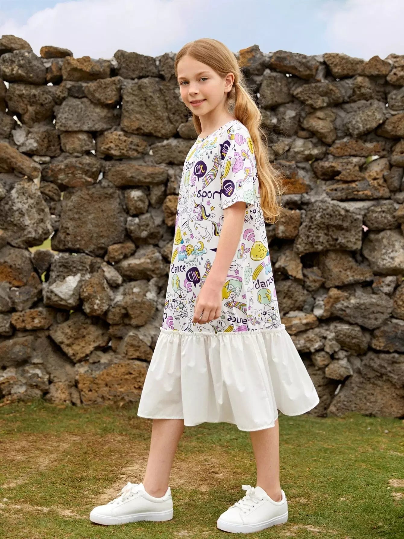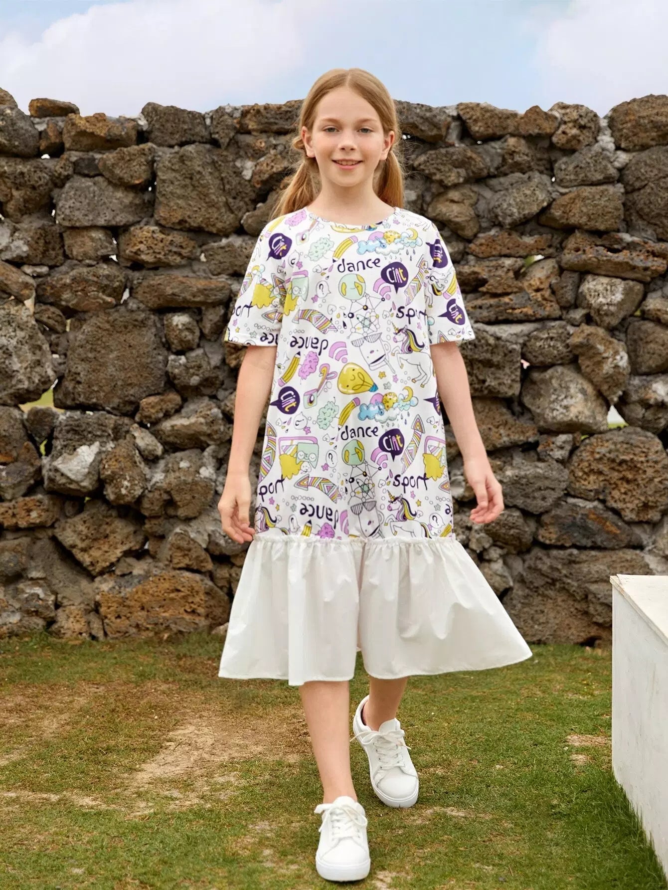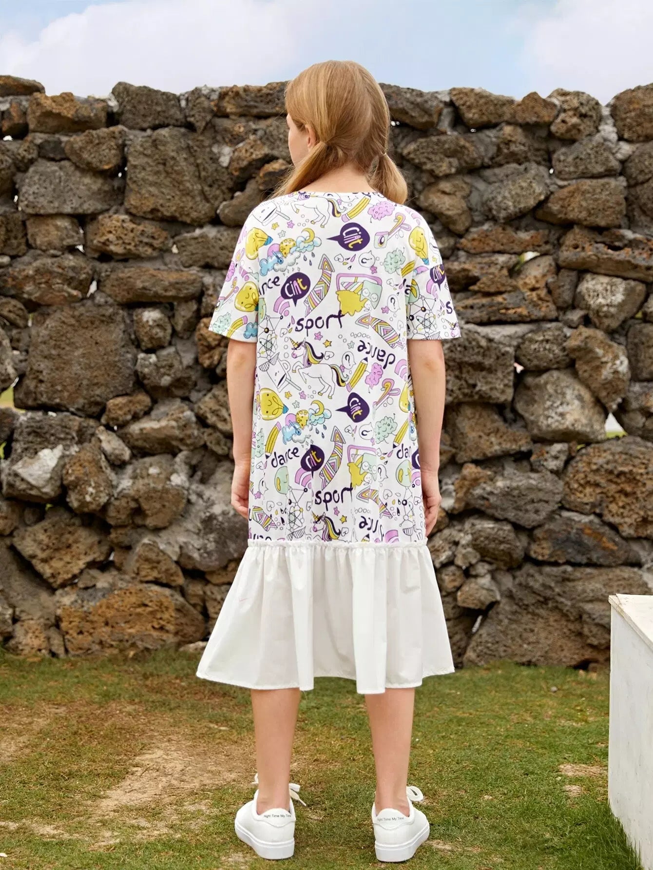 فستان بناتي بطبعة رسوم متحركة مع حافة مكشكشة
