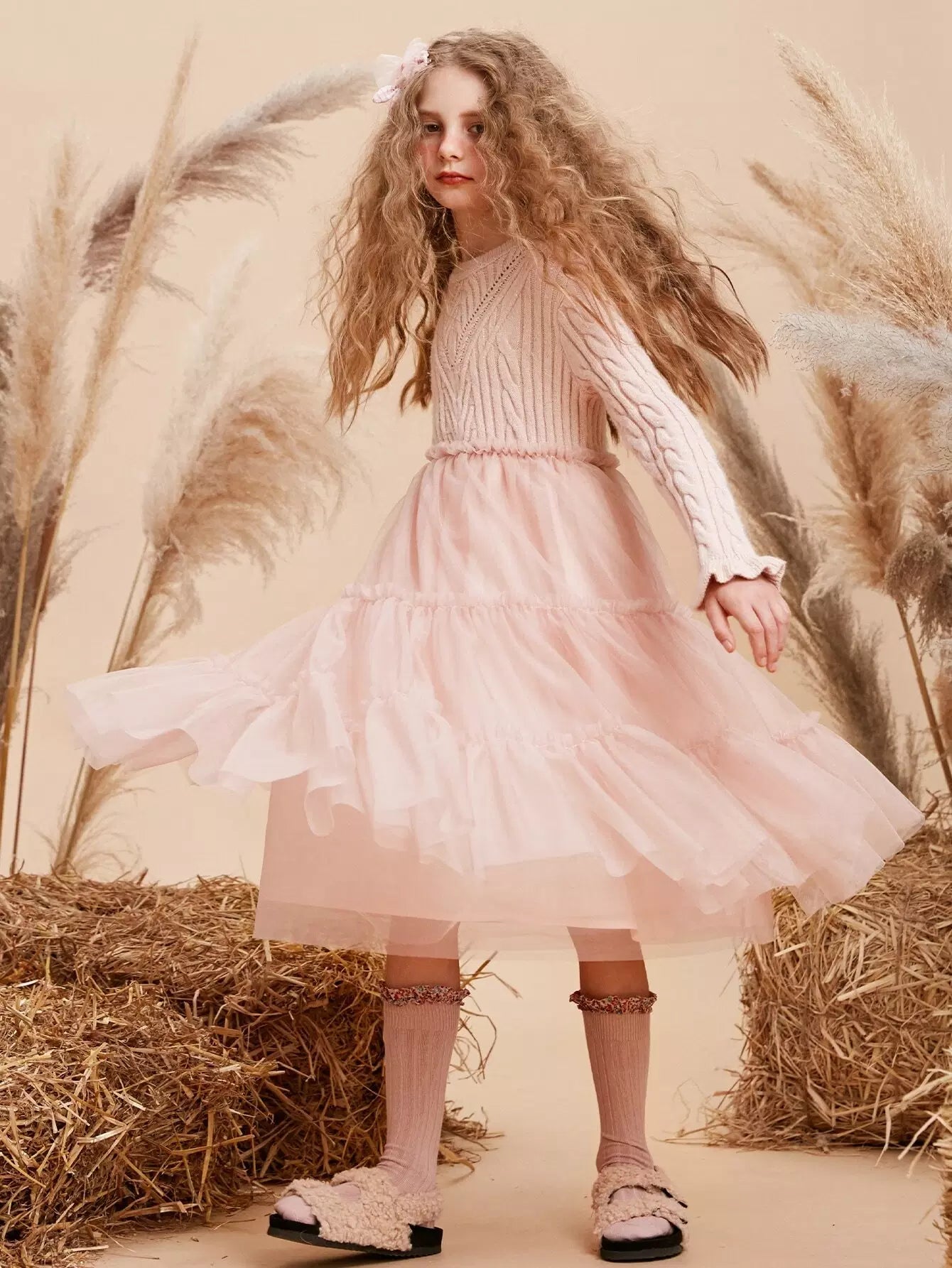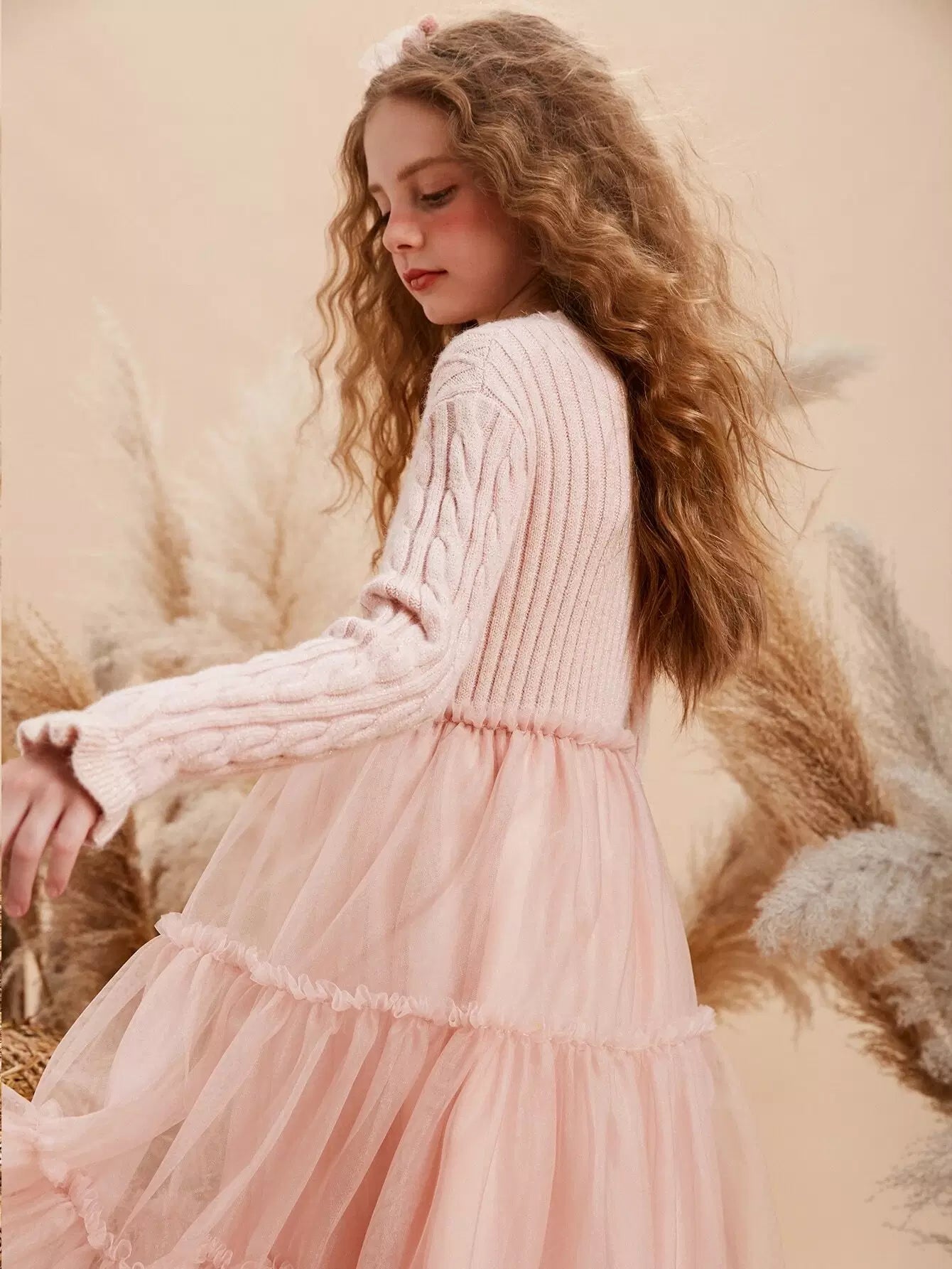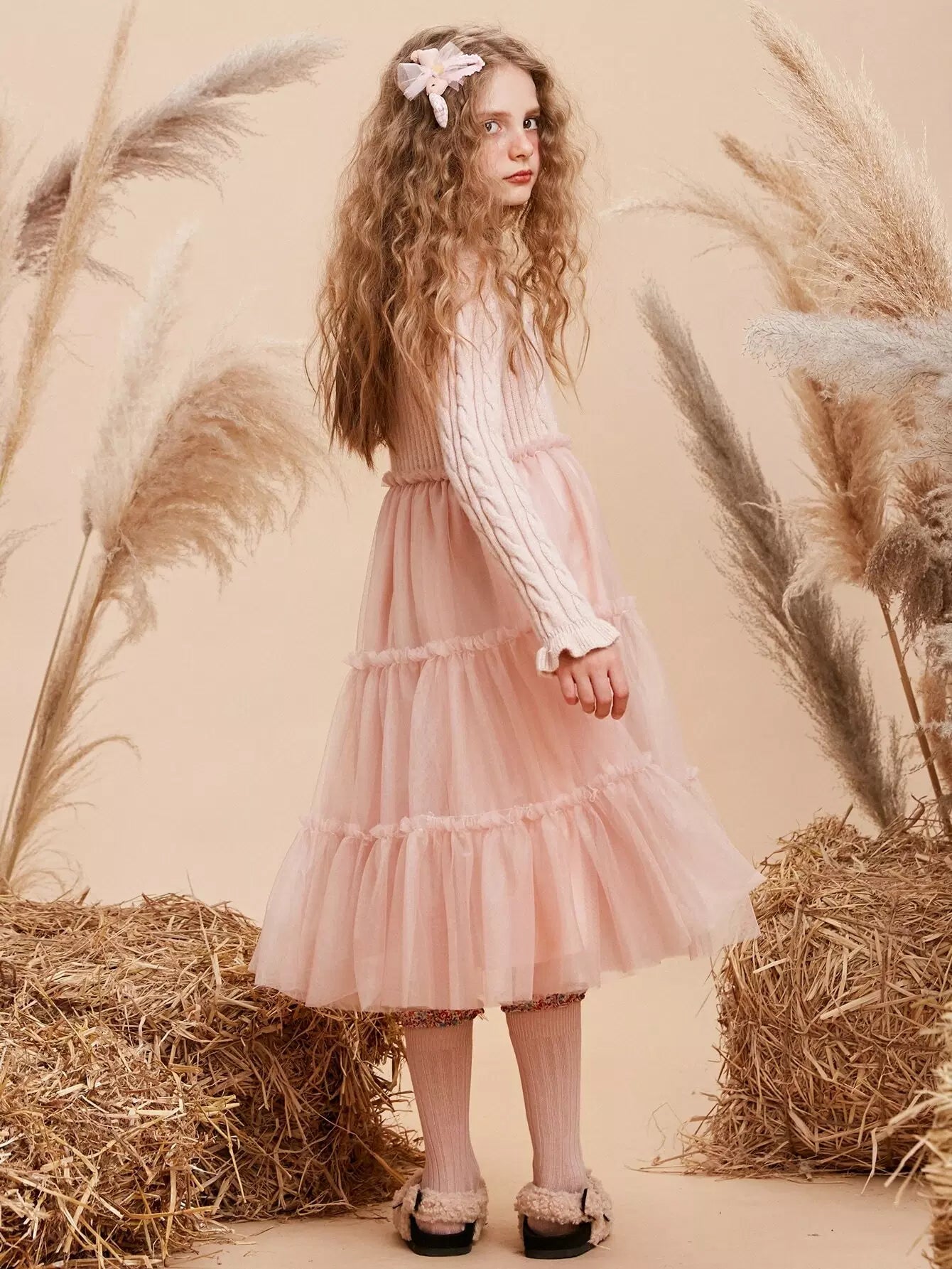 فستان بناتي بأكمام مكشكشة ذات حواف مكشكشة بلون مغاير بأكمام كبلية محبوكة