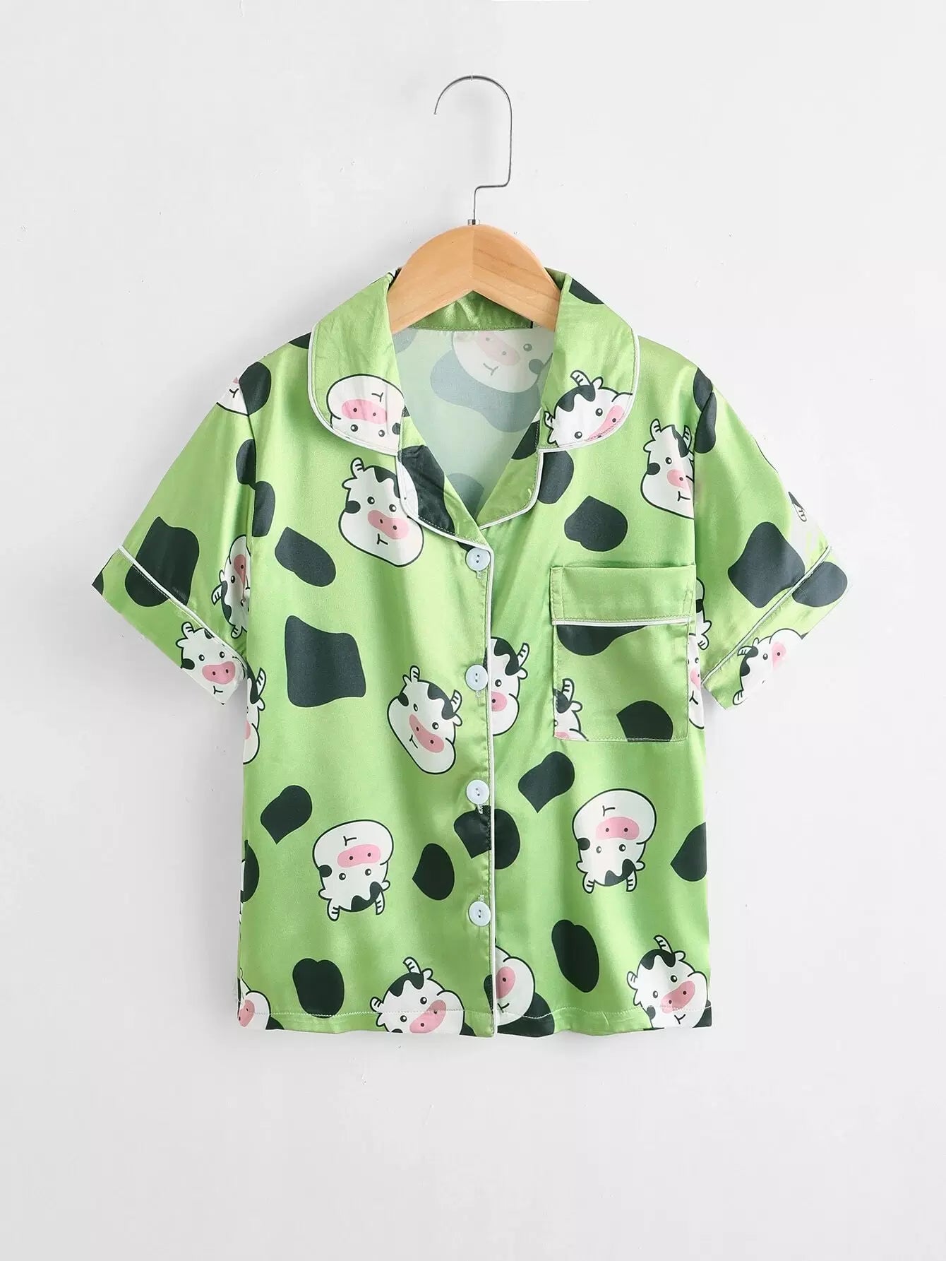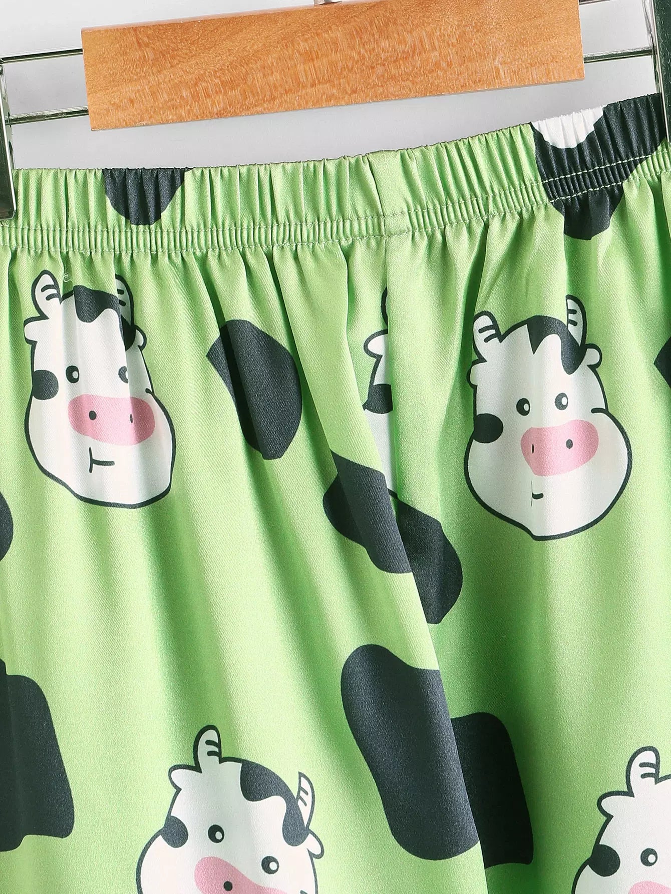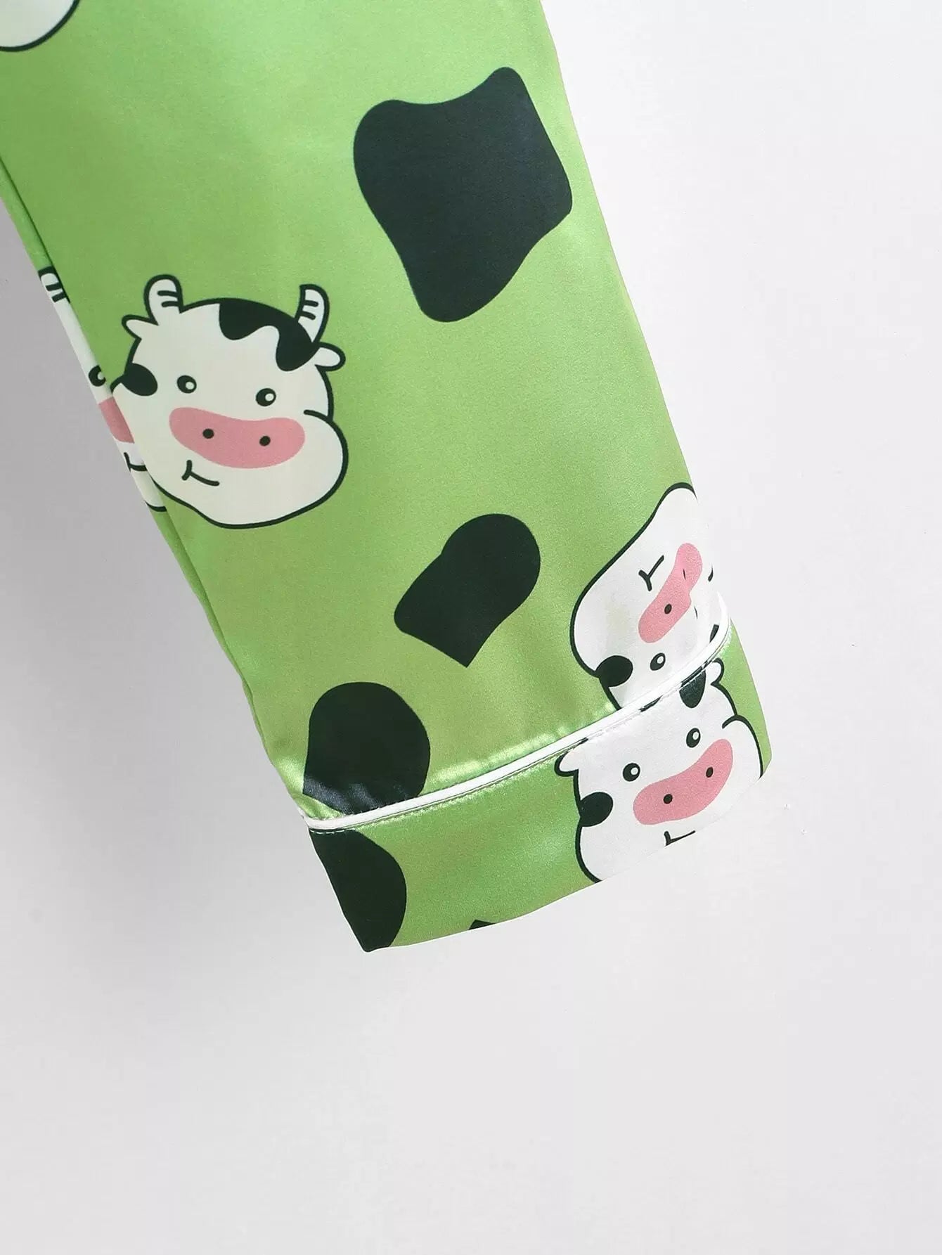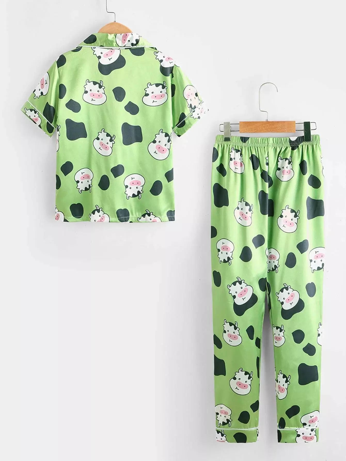 طقم بيجامة ساتان بطبعة بقرة برقبة رقبة بقرة للبنات