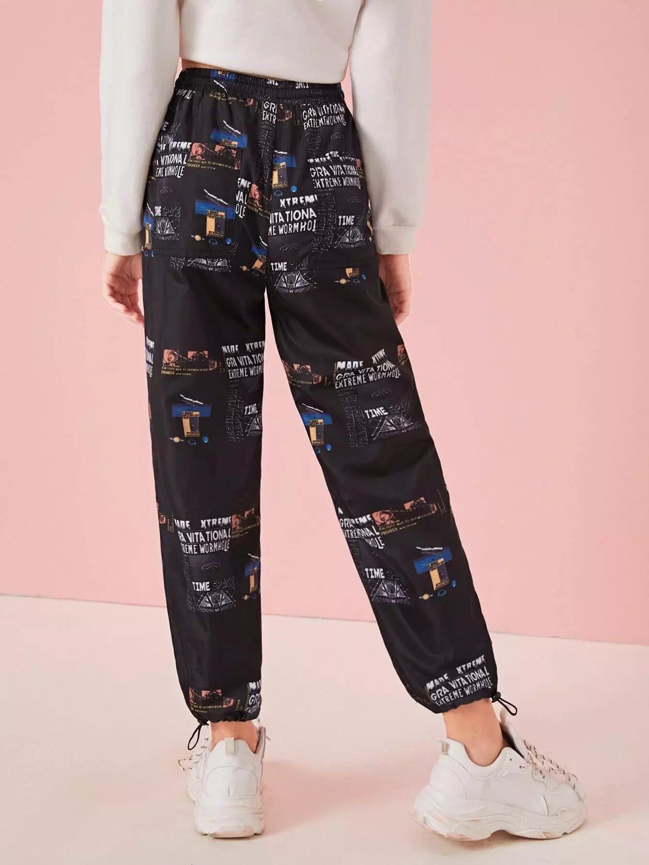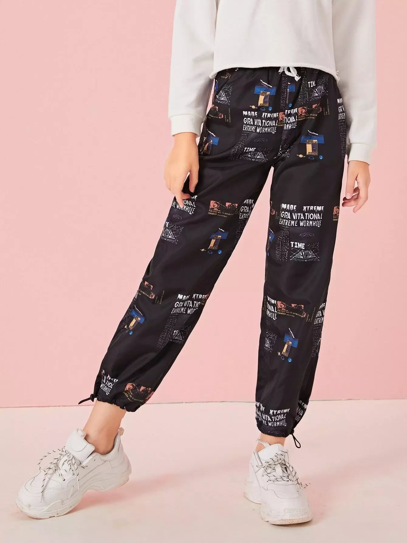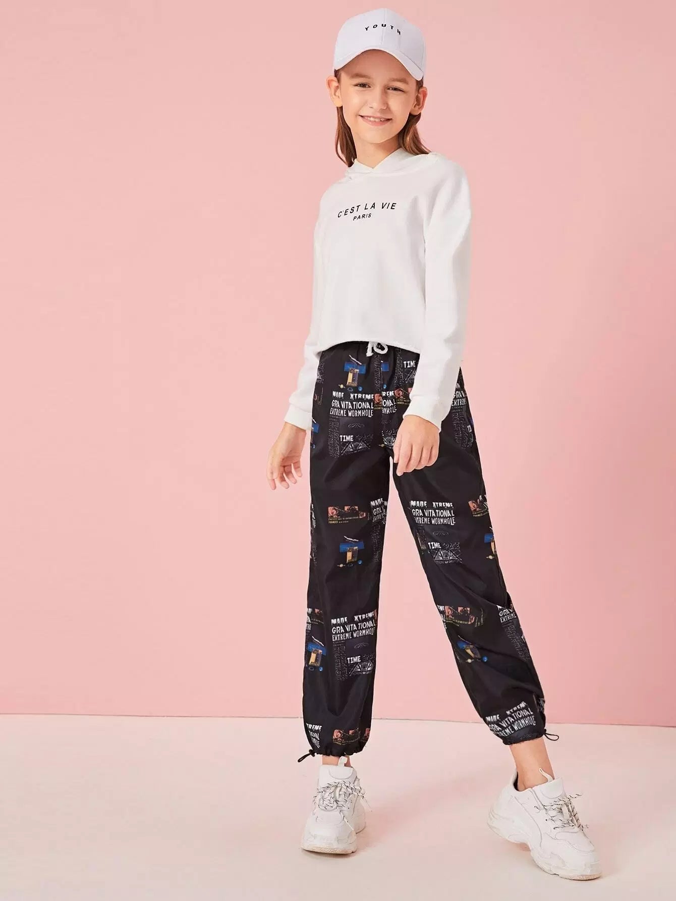 بنطلون بناتي بطبعات مختلطة مع جيب مائل وحاشية برباط