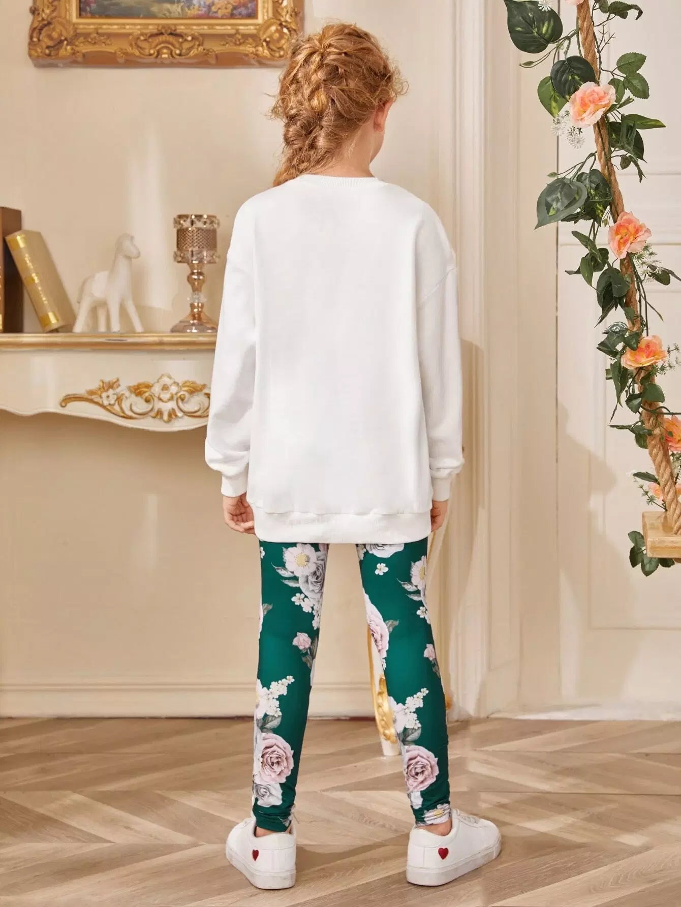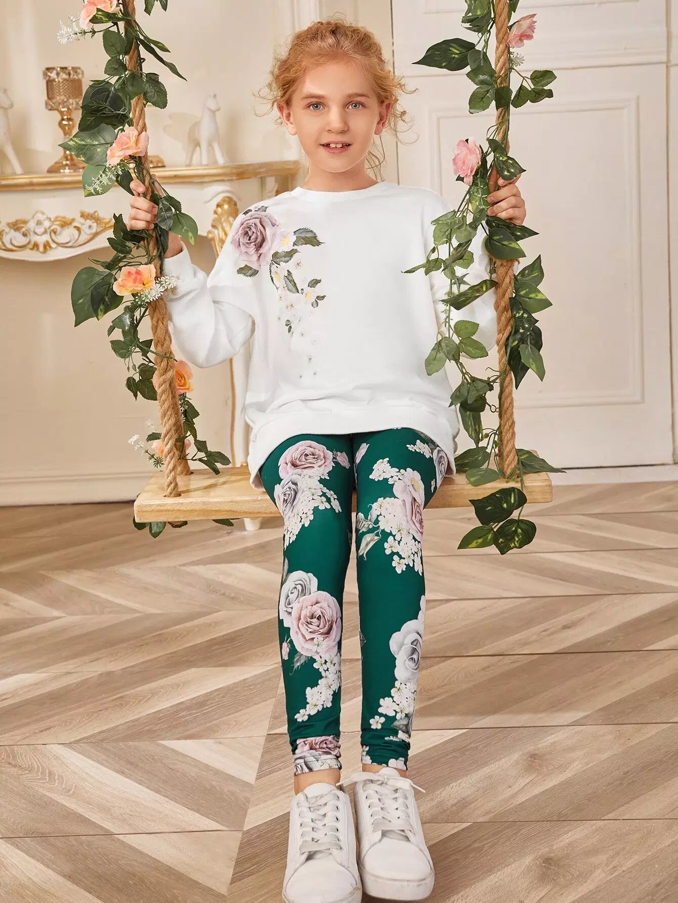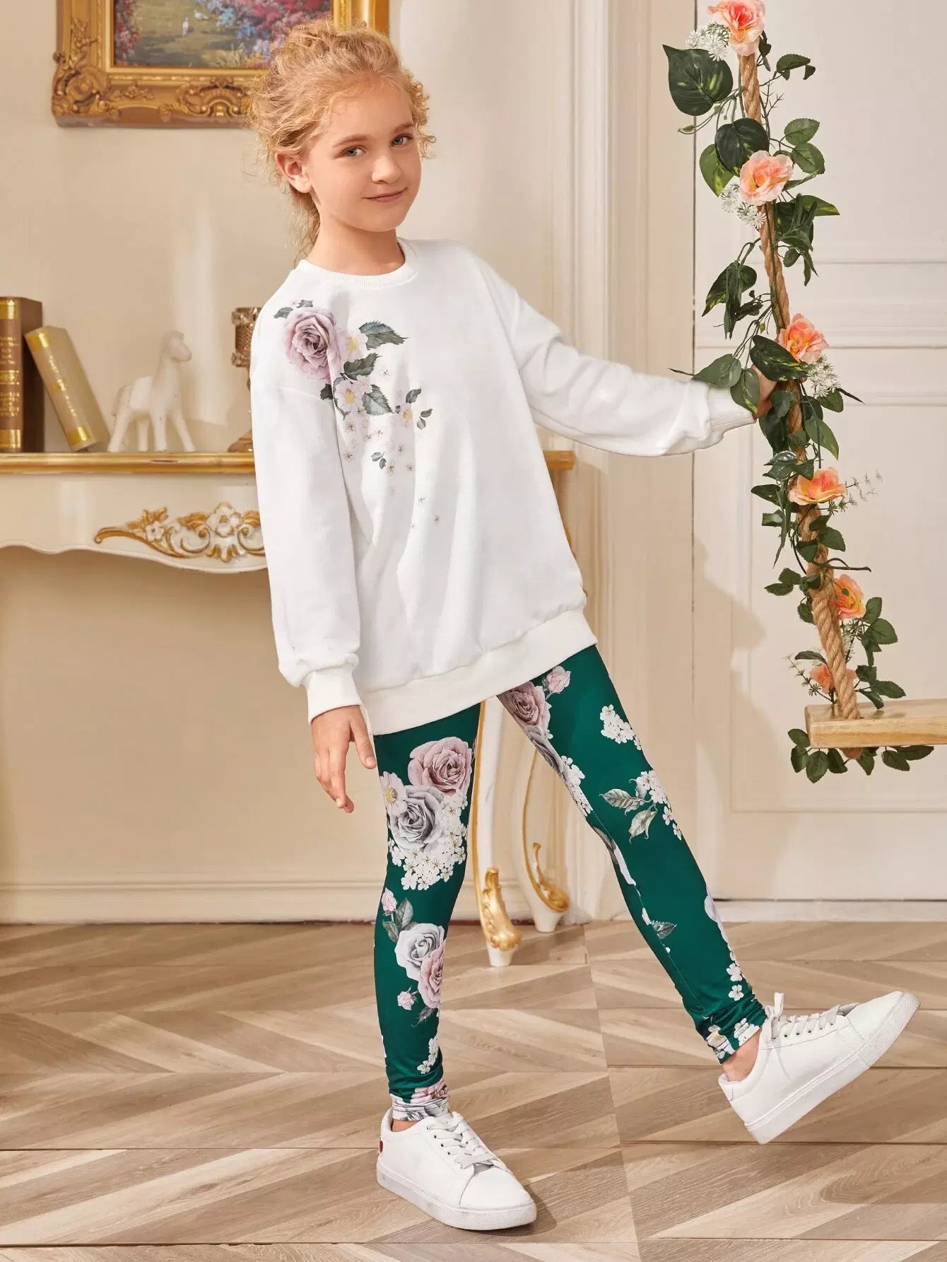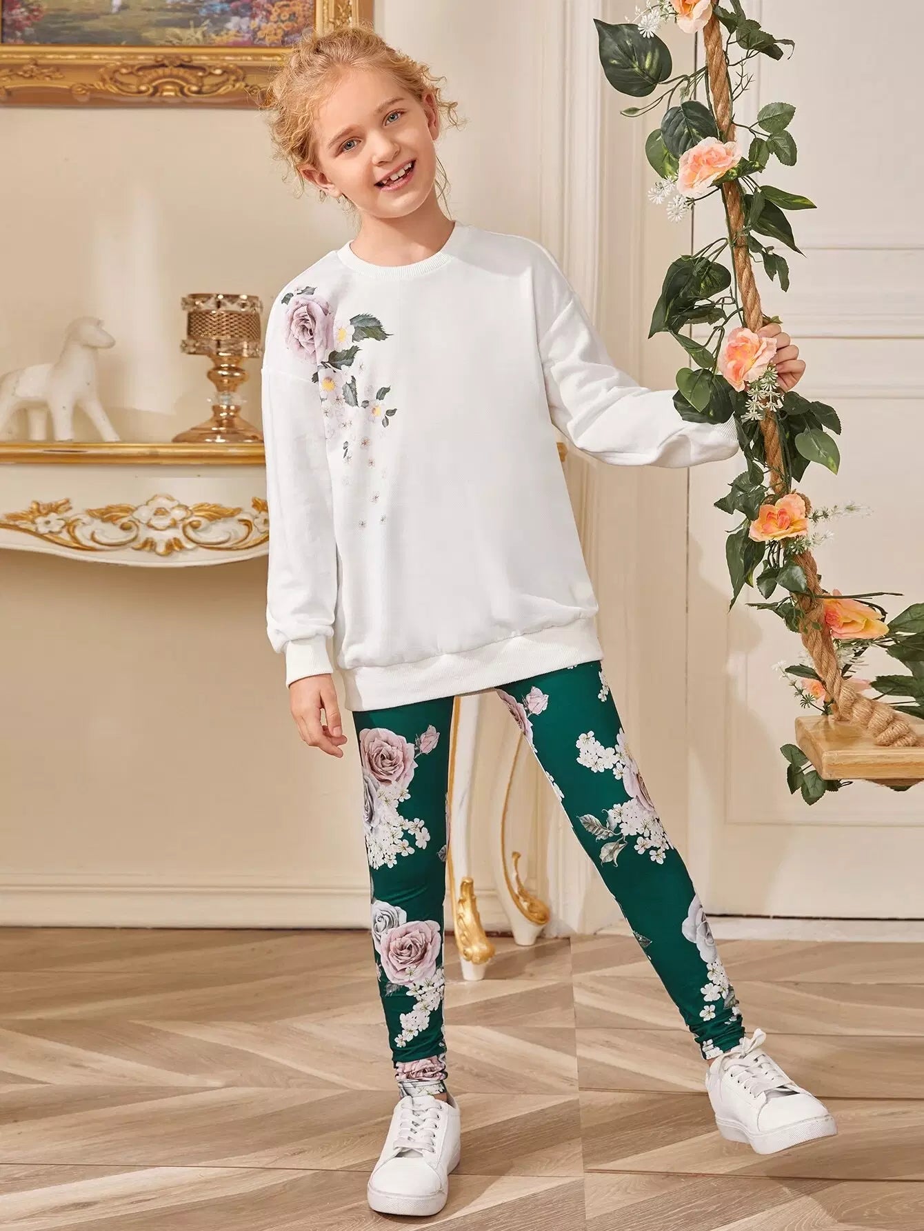 طقم بلوزة وبنطلون ضيق بكتف منسدل مزين بالزهور للبنات