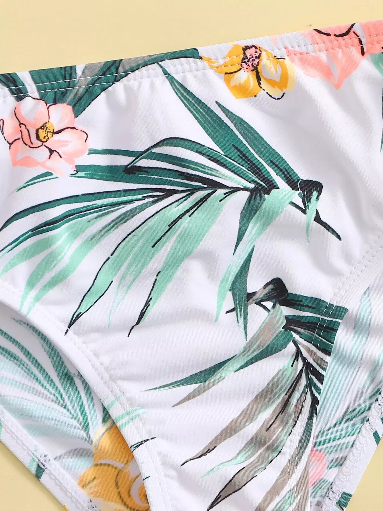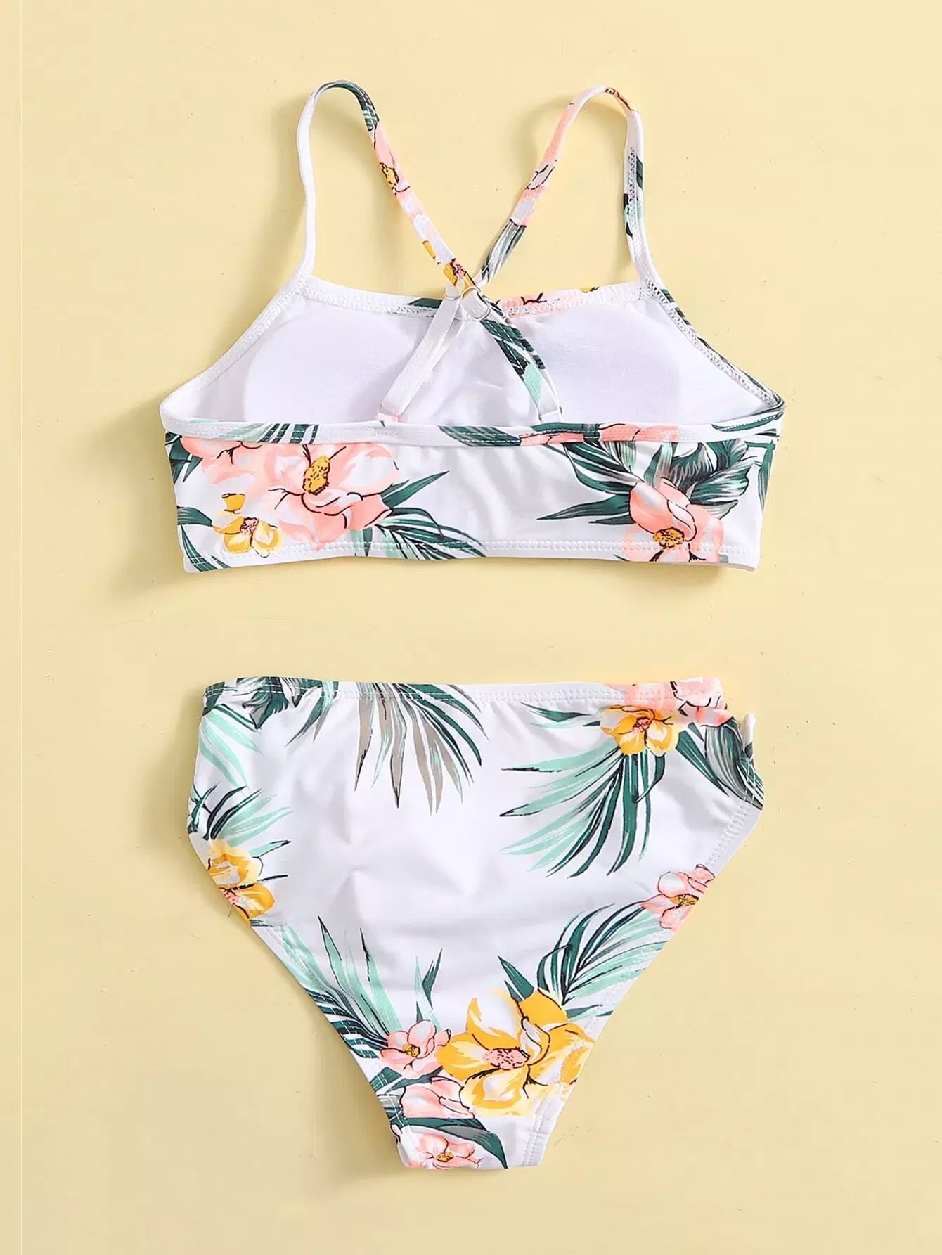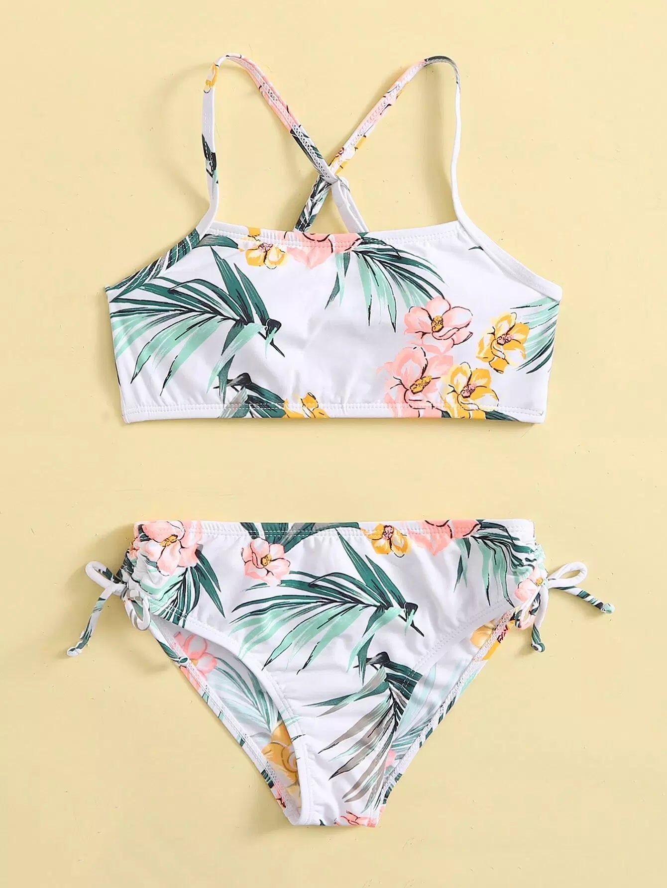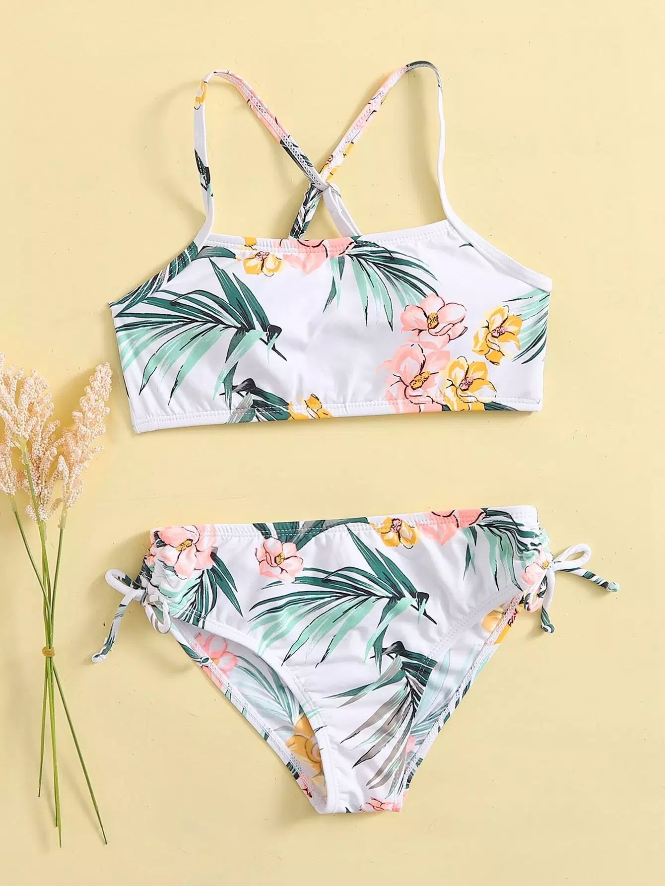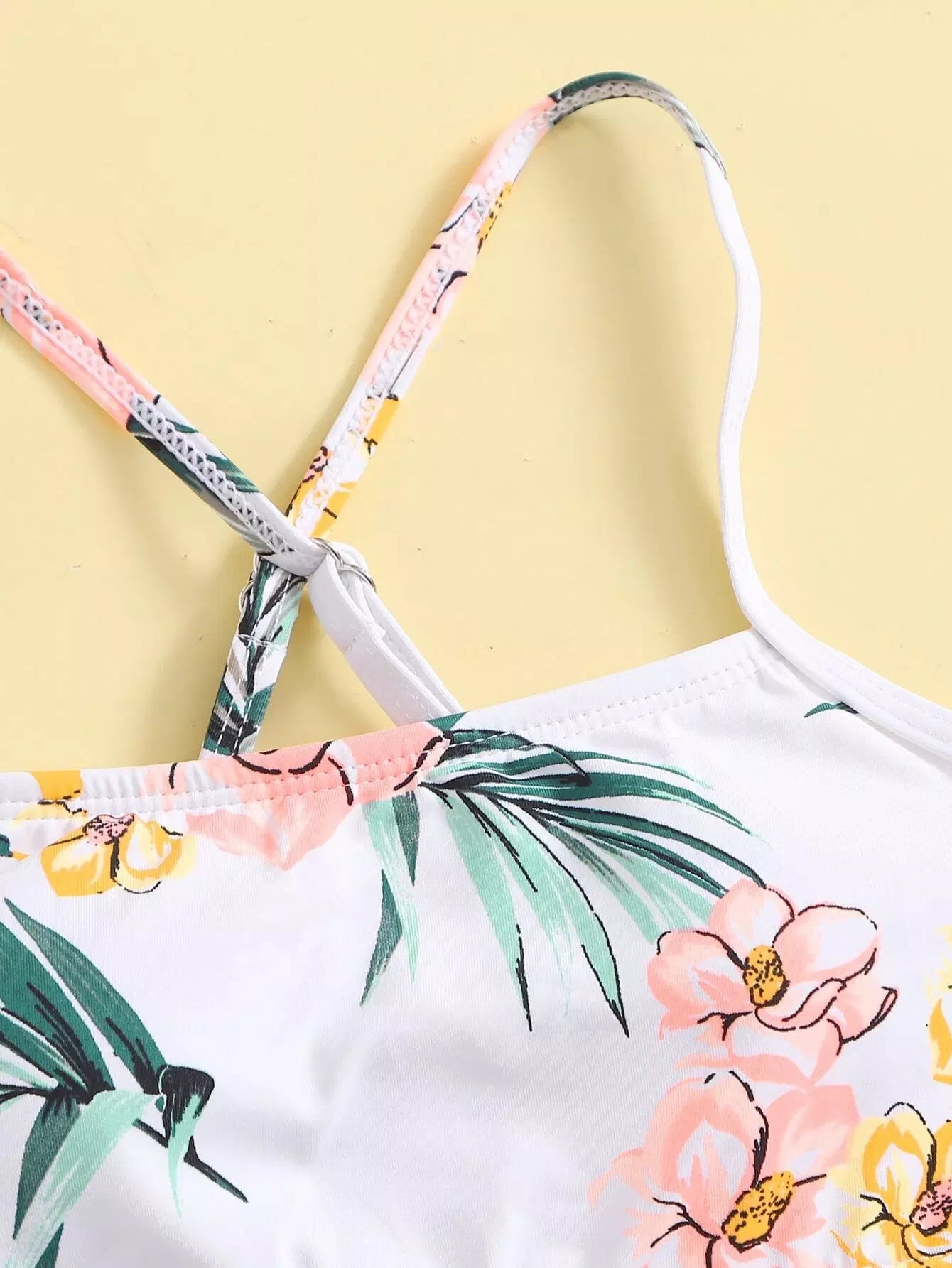 مايوه بكيني سباحة بناتي مزين بالزهور وربطة عنق جانبية استوائية