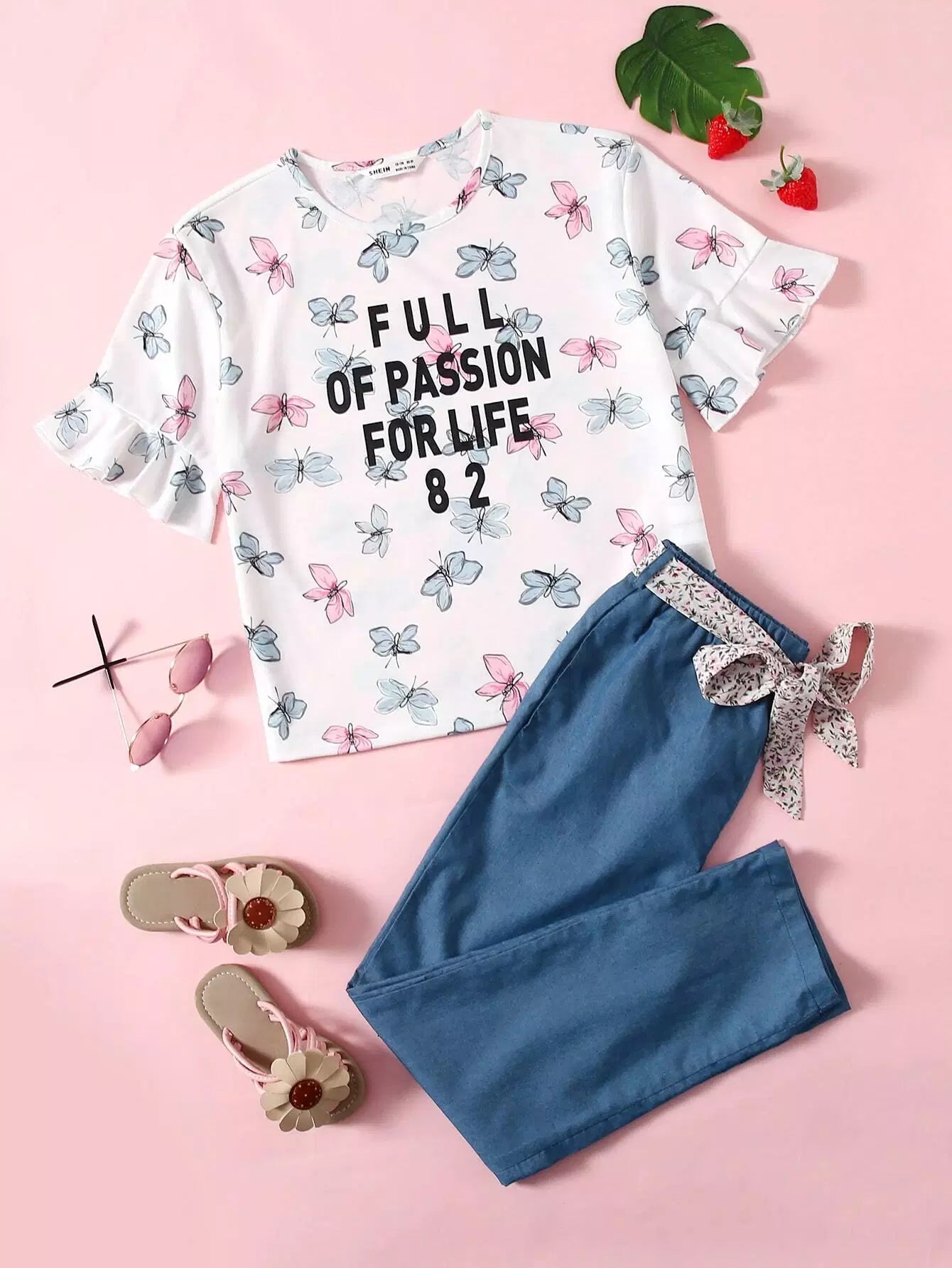 طقم بناتي بأكمام واسعة وشعار وطبعة فراشة وسروال متباين بدون حزام