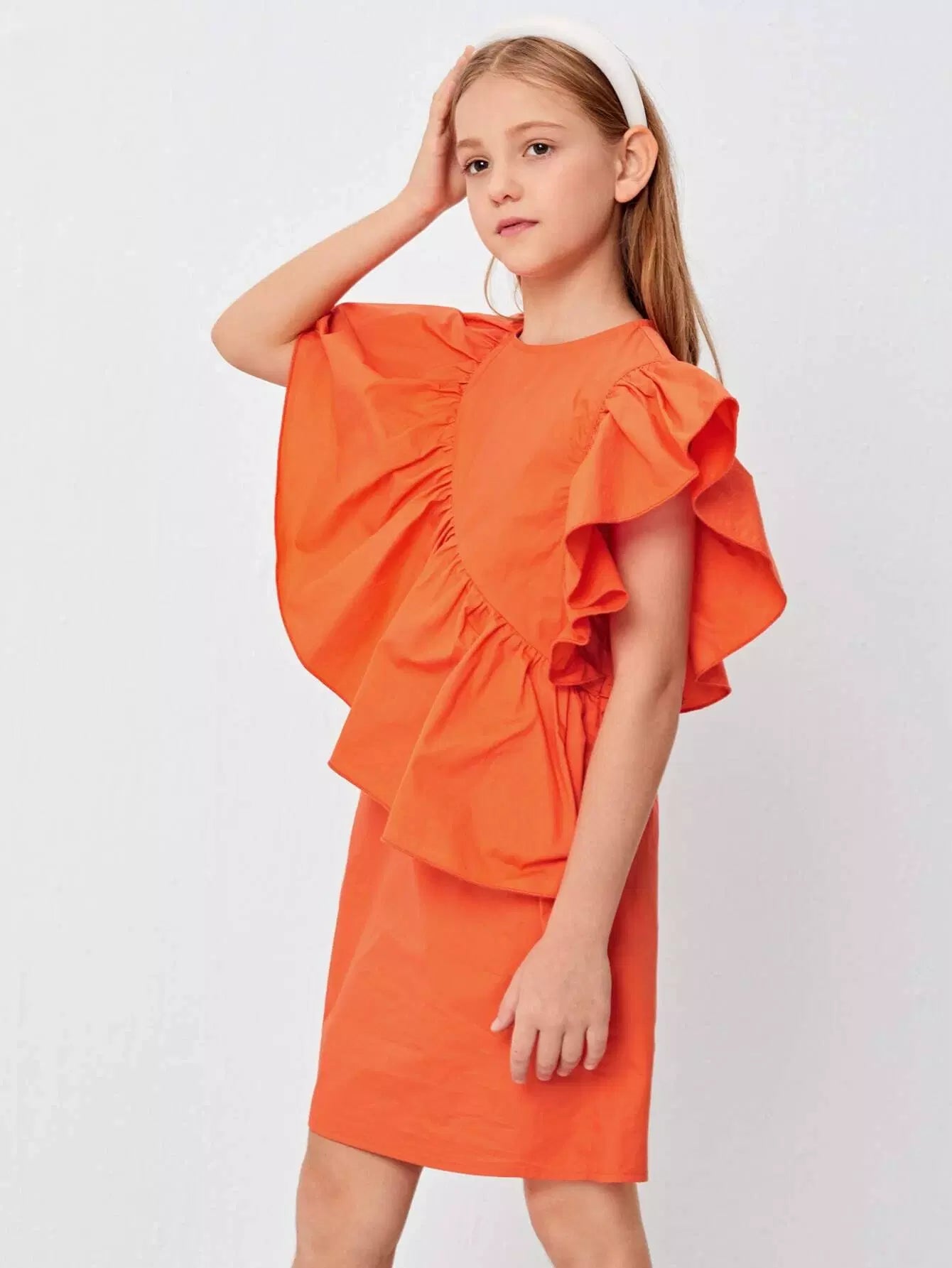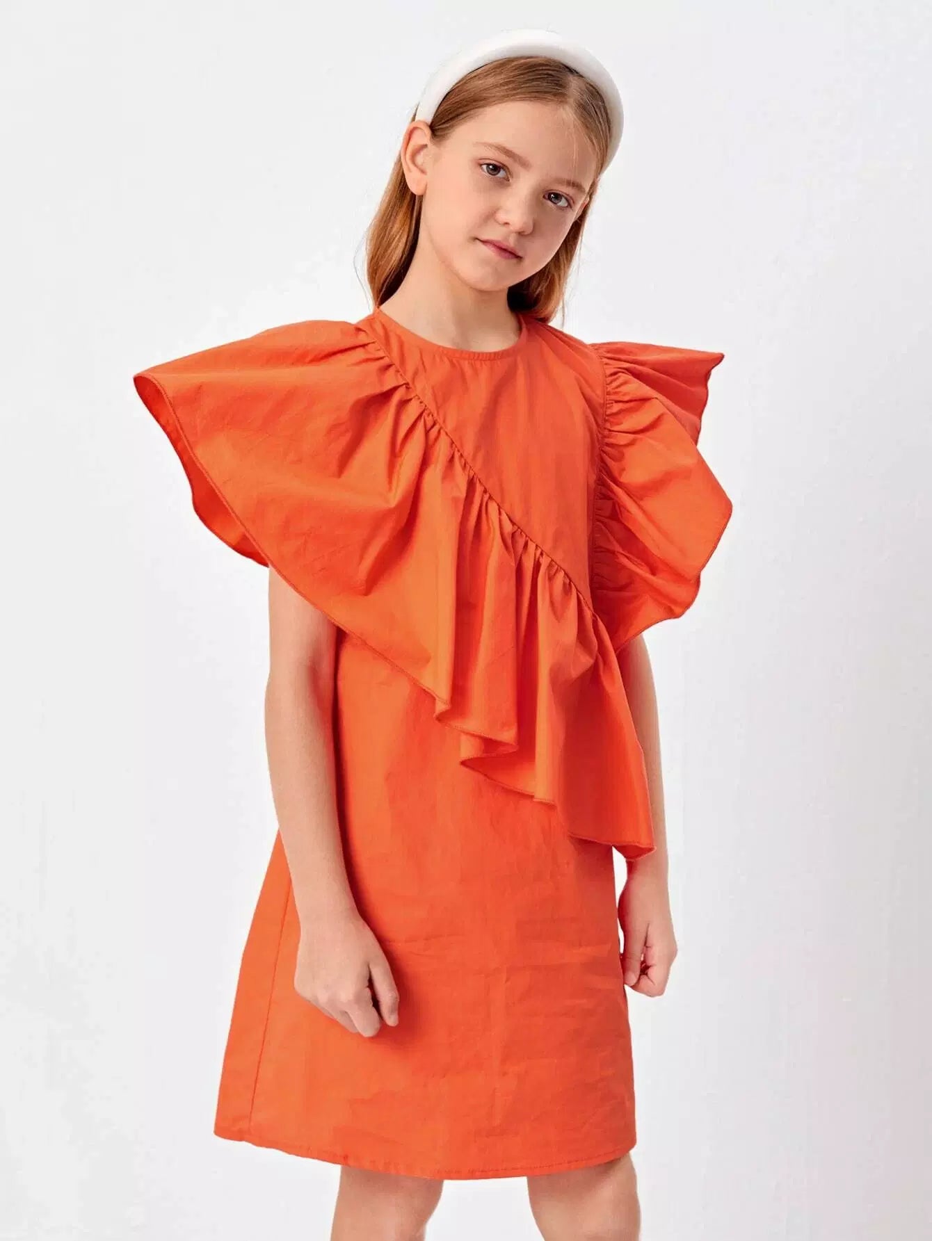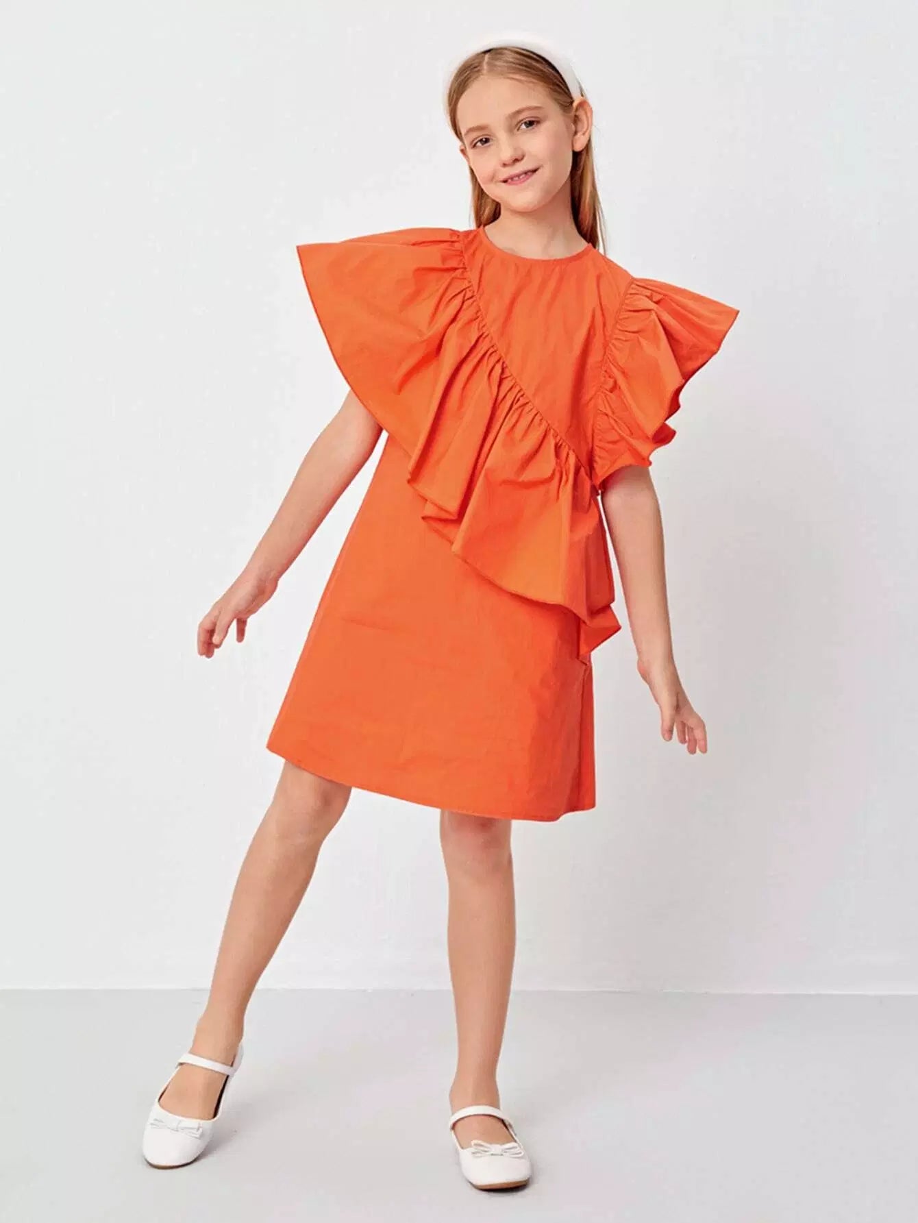 الأطفال - فستان سادة بحواف مكشكشة باللون البرتقالي النيون للفتيات