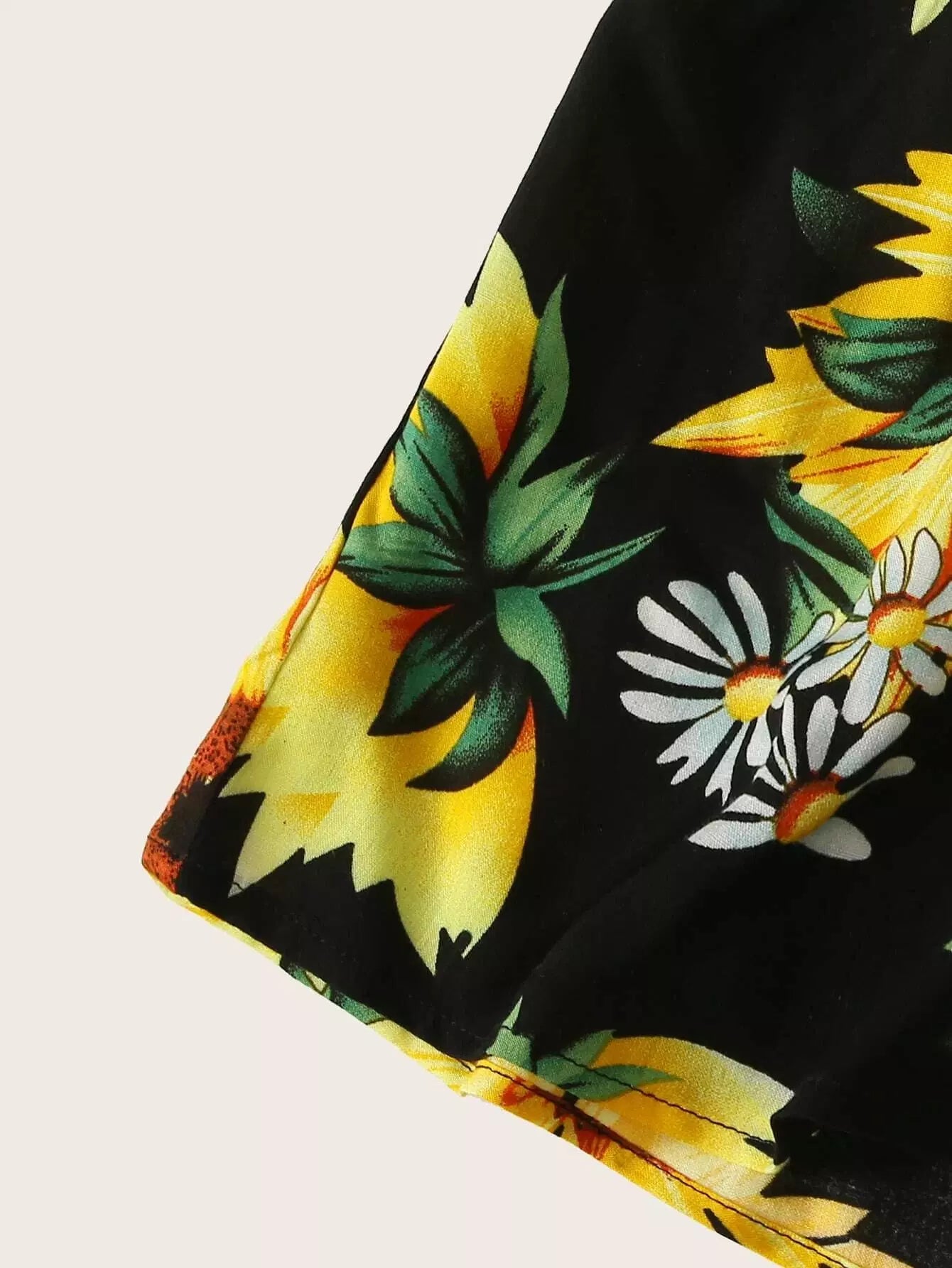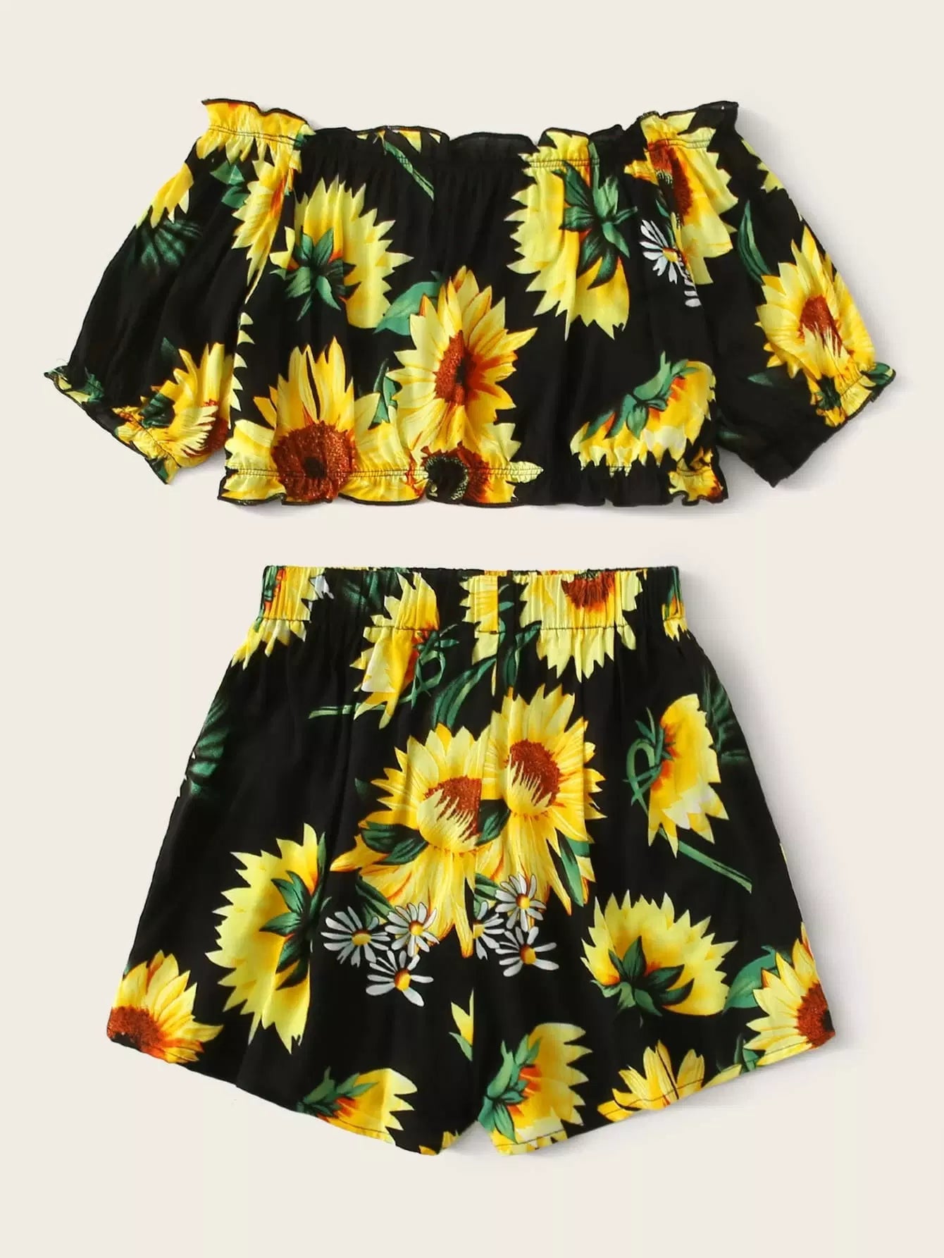 طقم شورت وقميص بطبعة عباد الشمس مع حواف مكشكشة للفتيات
