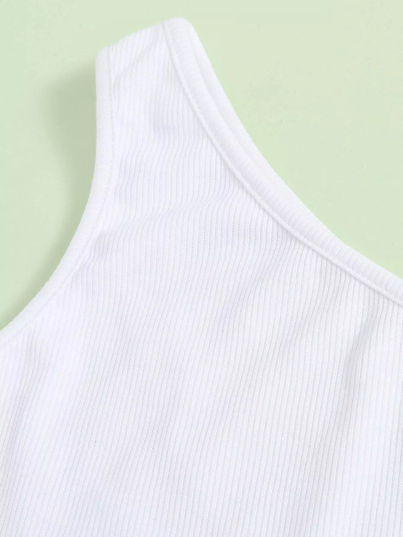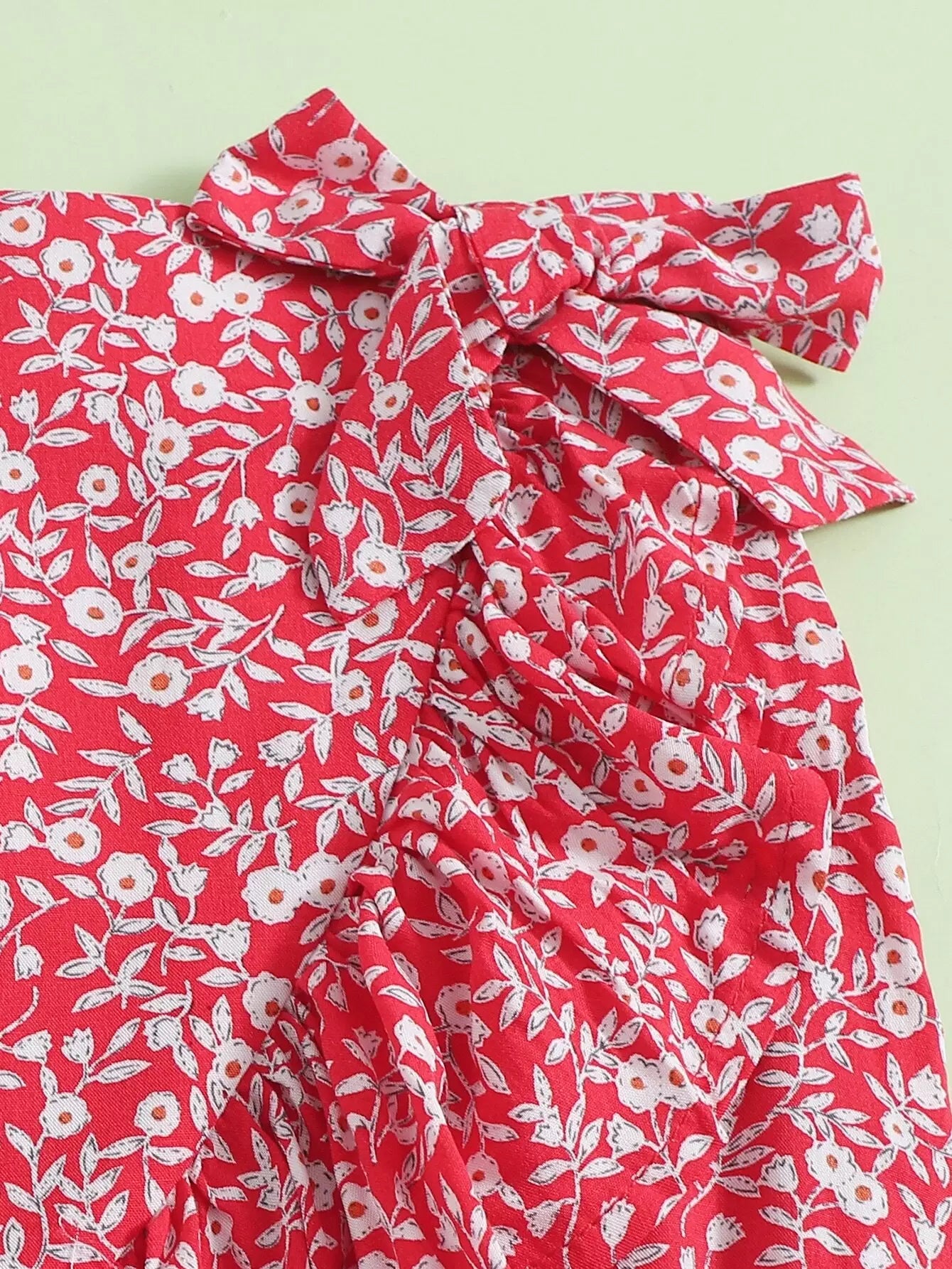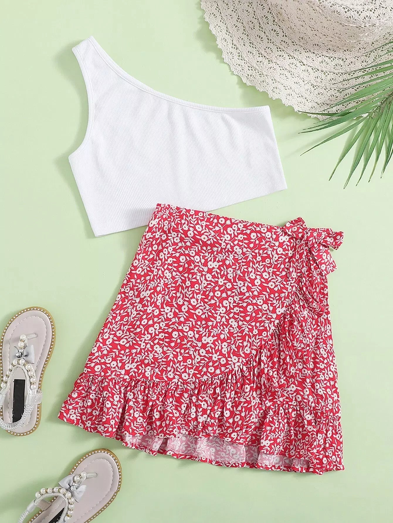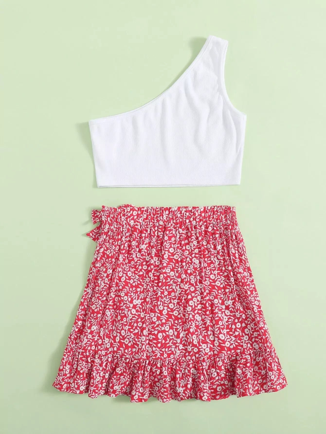طقم بناتي بلوزة بكتف واحد وتنورة مزينة بكشكشة ورباط جانبي مزخرف بأزهار صغيرة