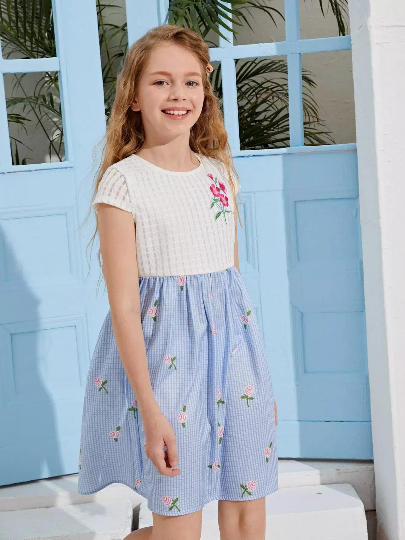 فستان بناتي بطبعات الأزهار والمربعات مع تفاصيل مرقعة