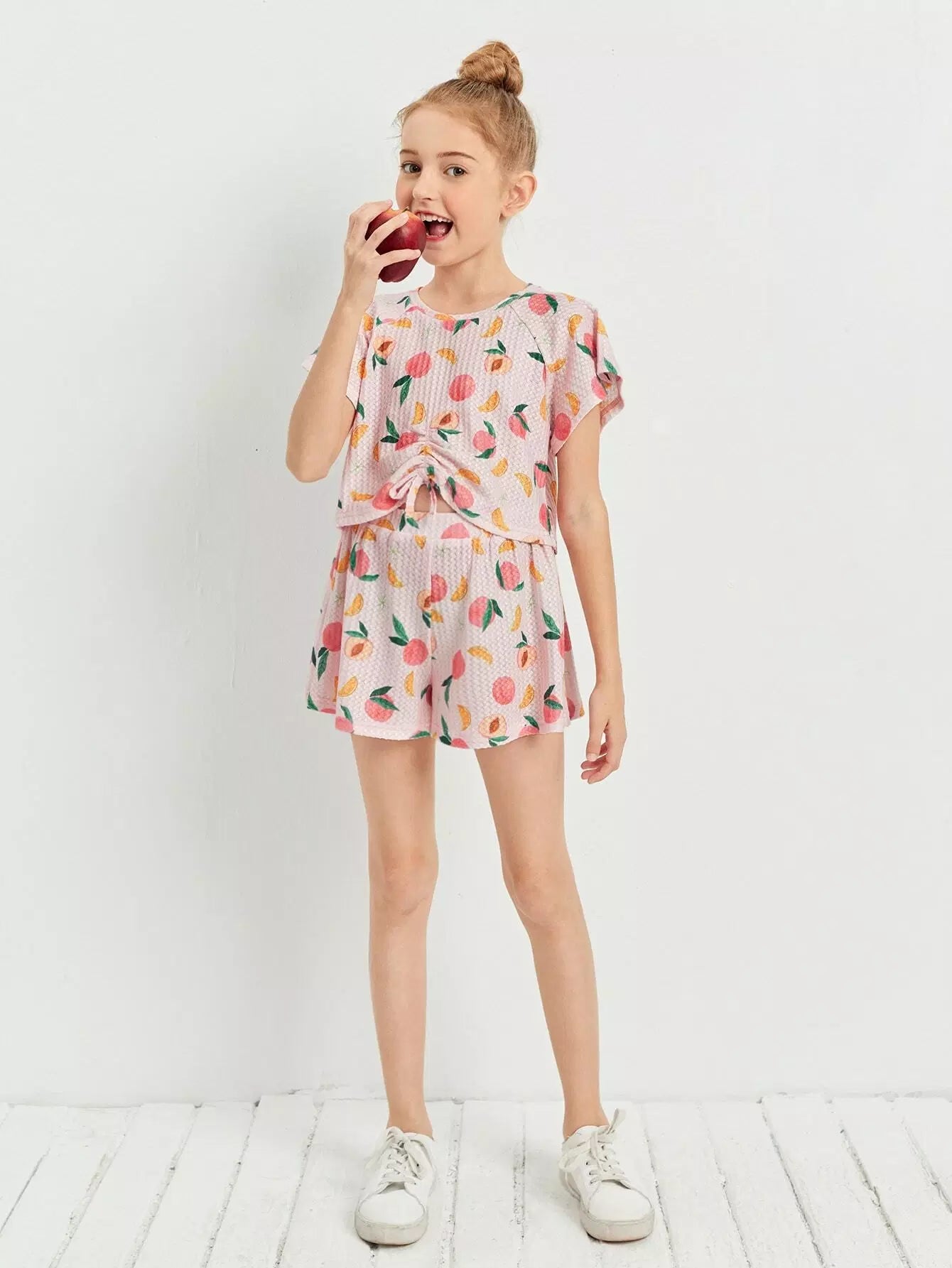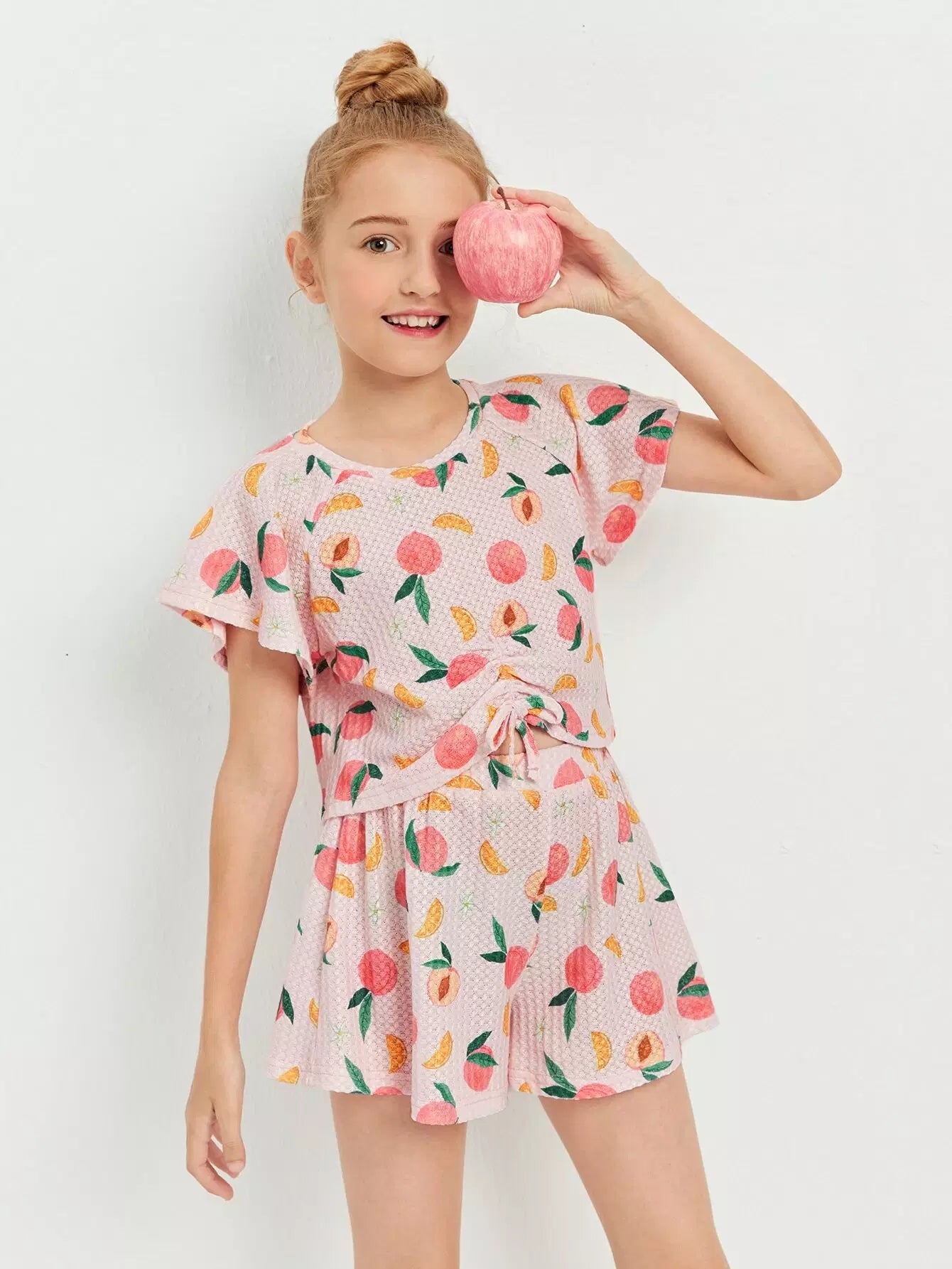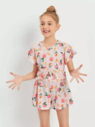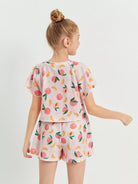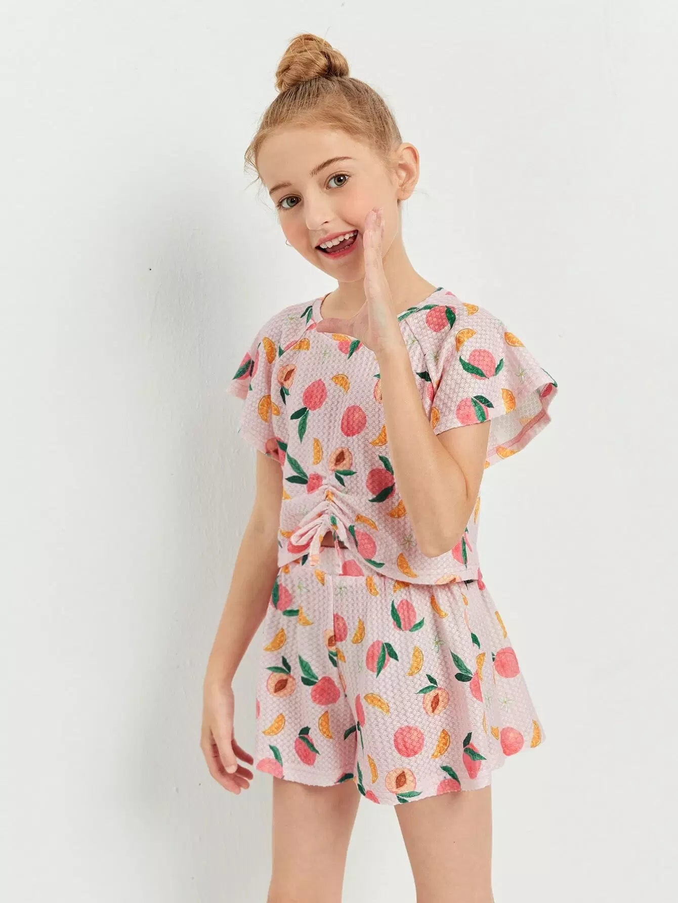 طقم بناتي مكون من بلوزة وشورت بأكمام فراشة بطبعة الخوخ وعقدة مجعدة
