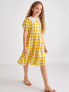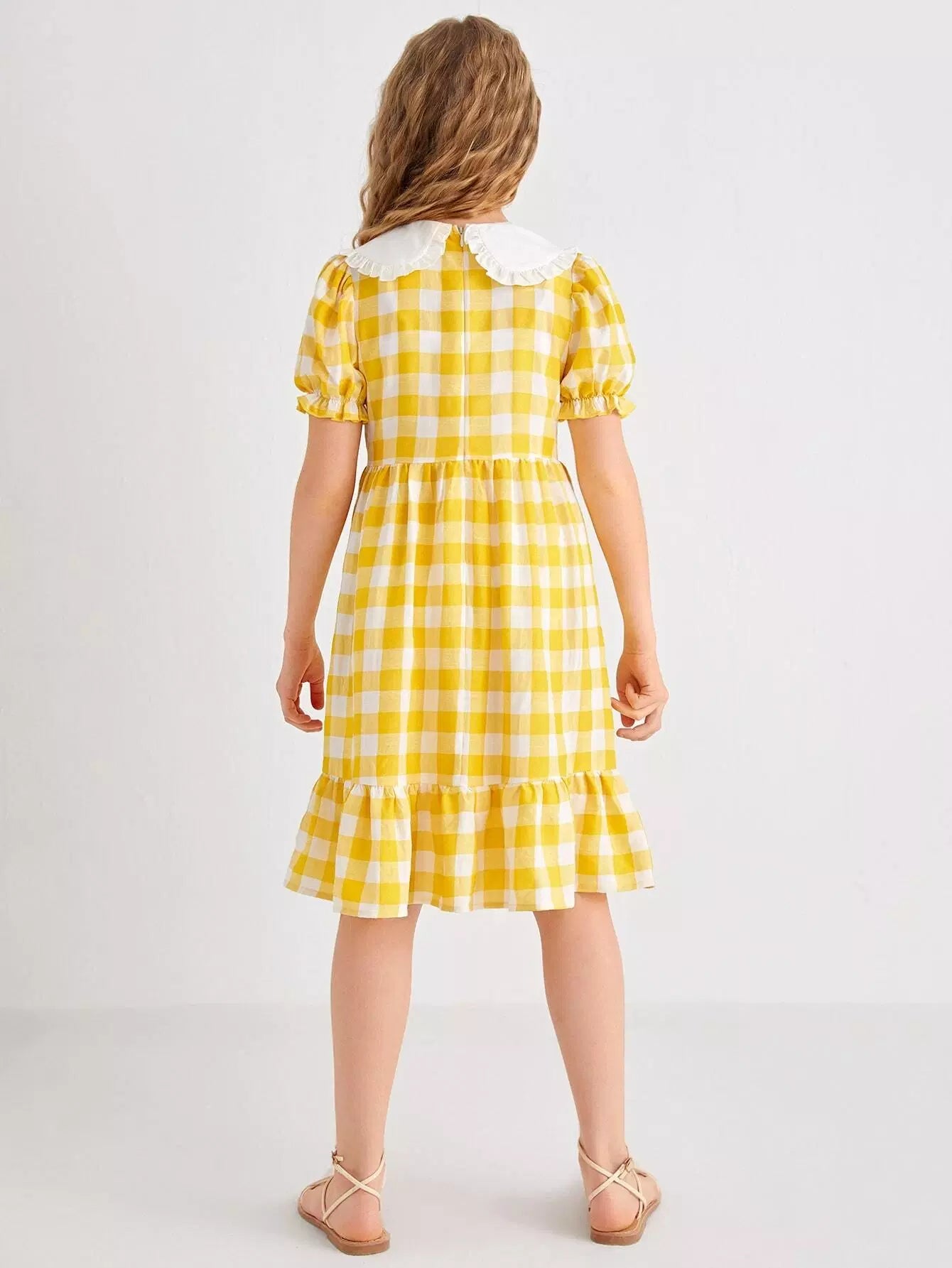 فستان بناتي منقوش بياقة بيتر بان وأكمام منفوخة