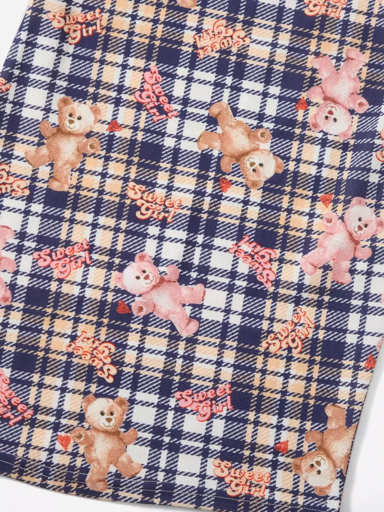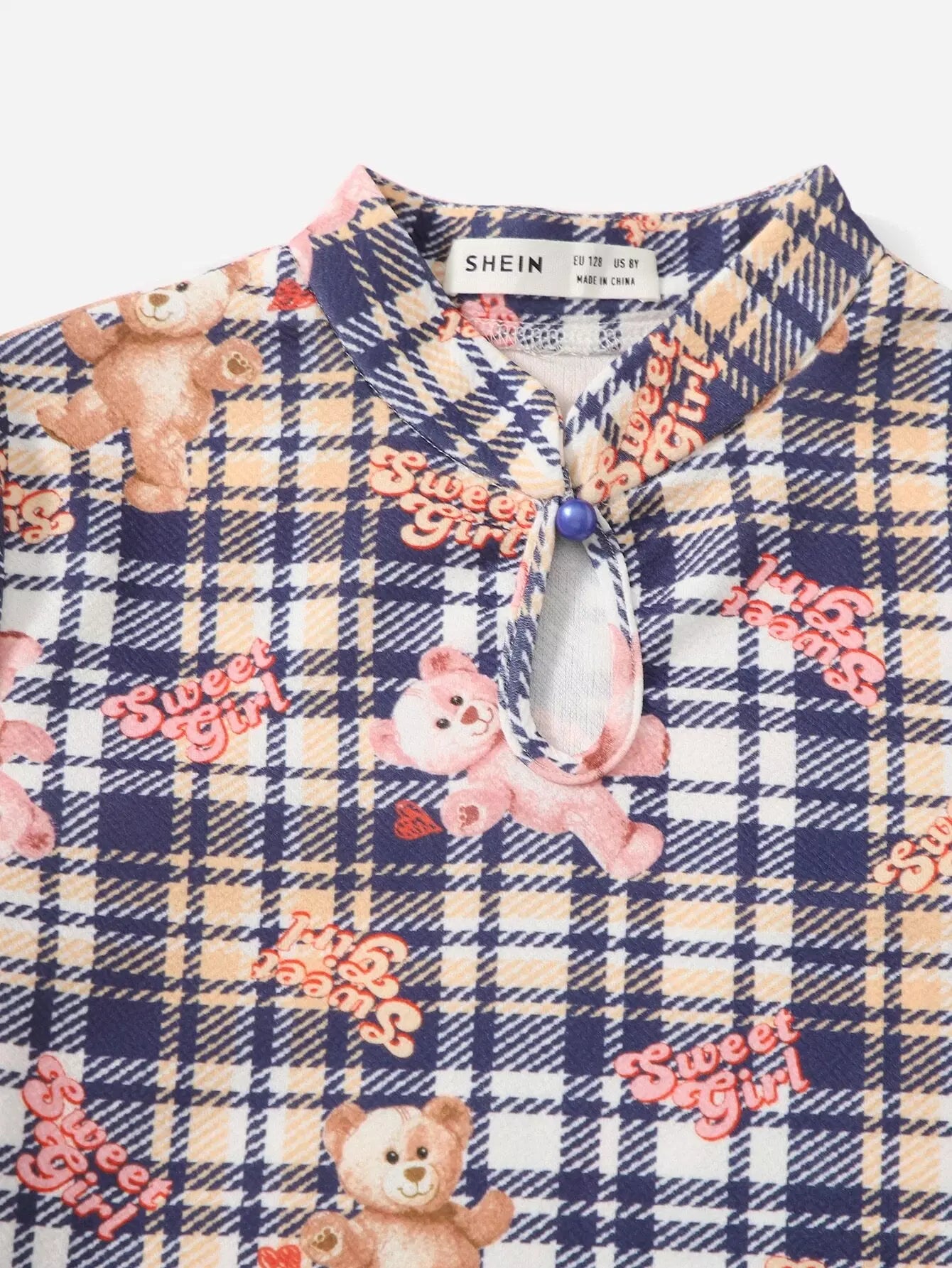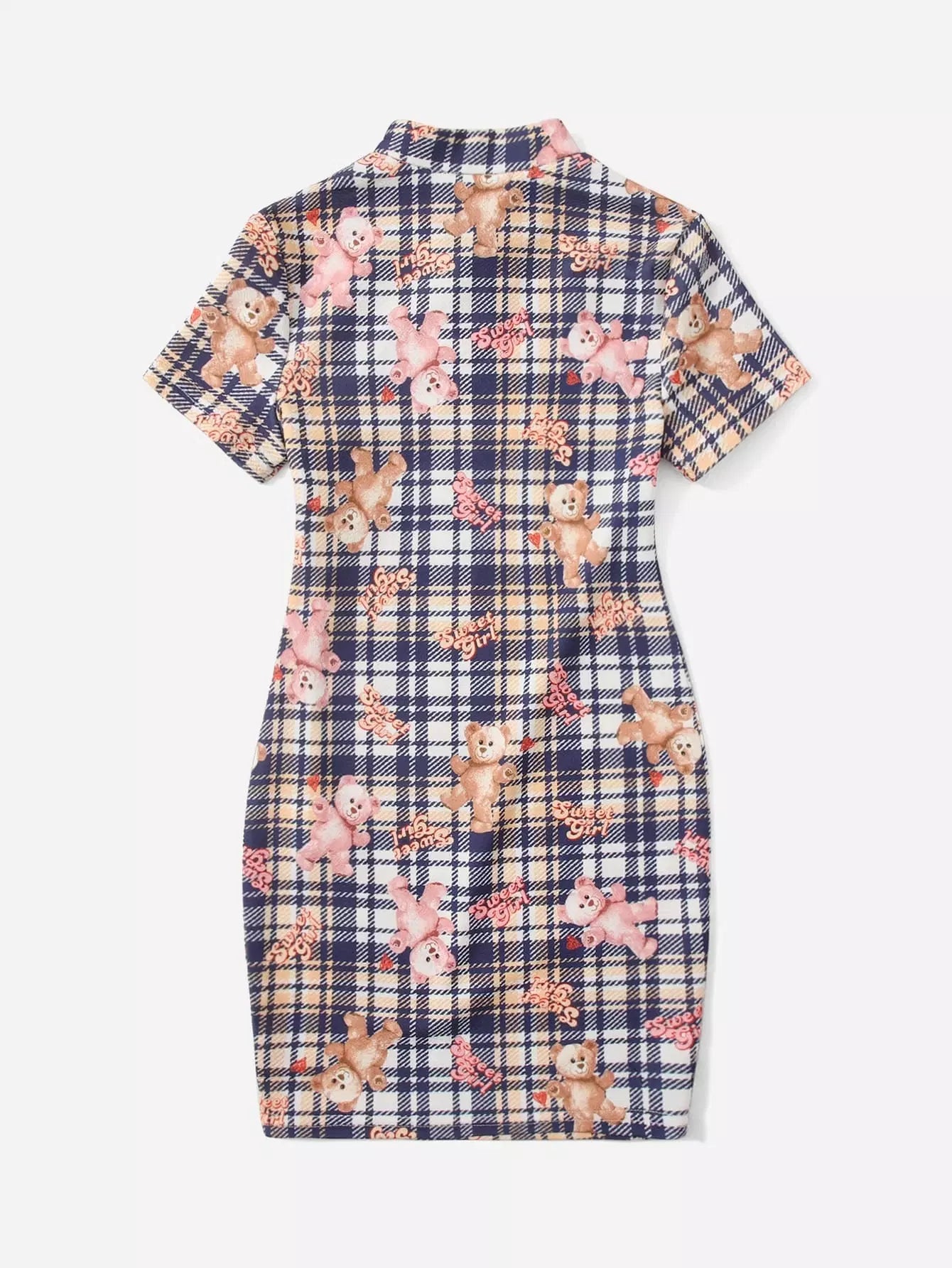 فستان بناتي بياقة ماندرين وطبعة مربعات ودب