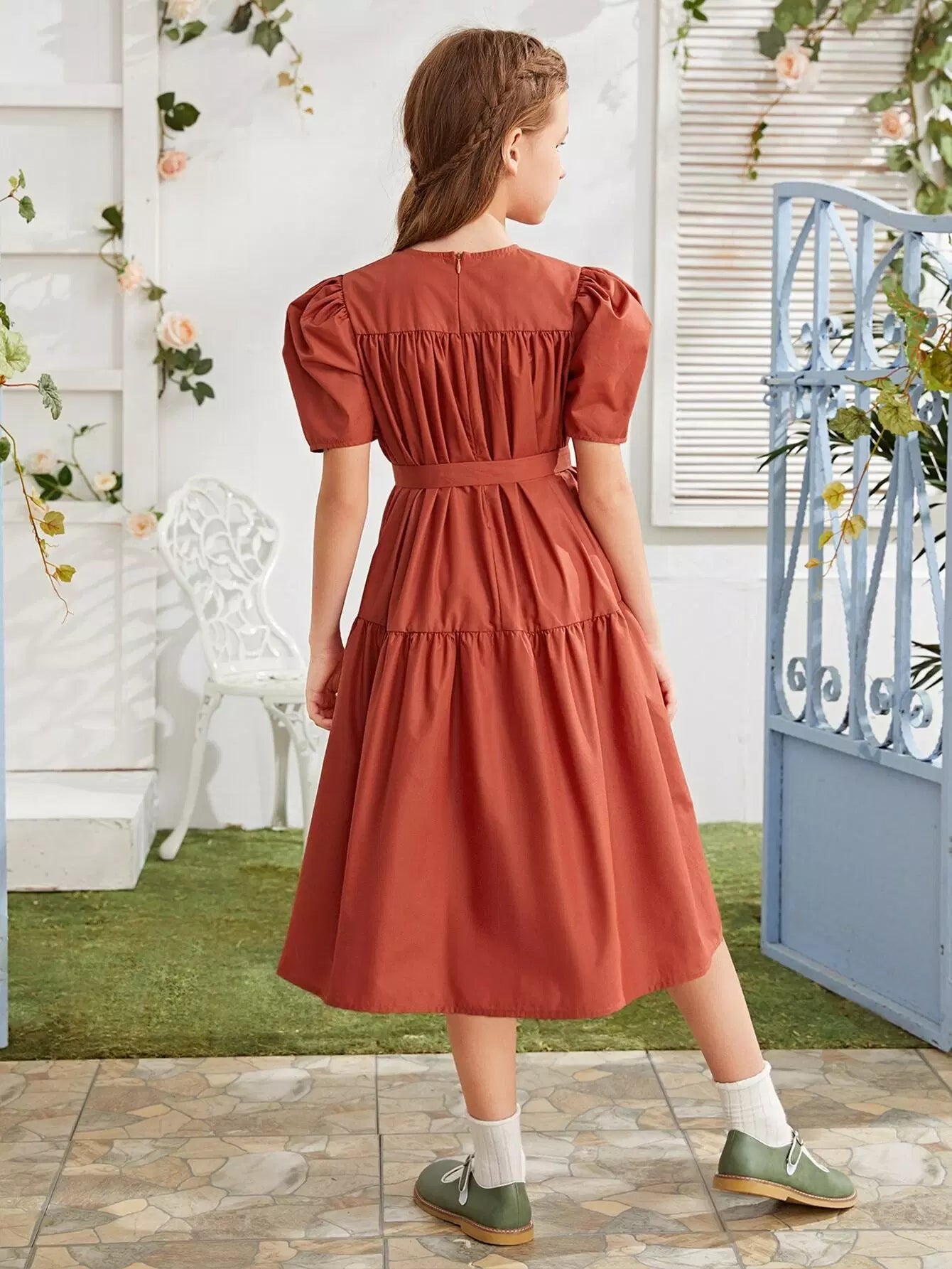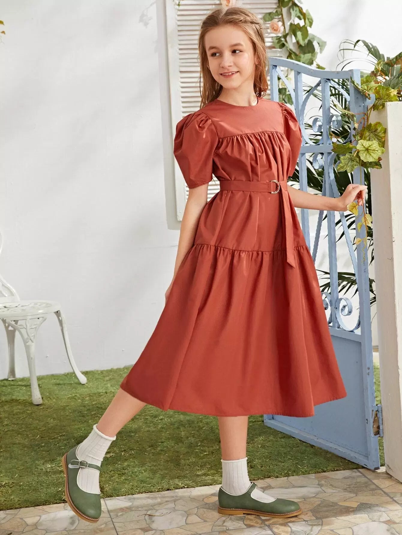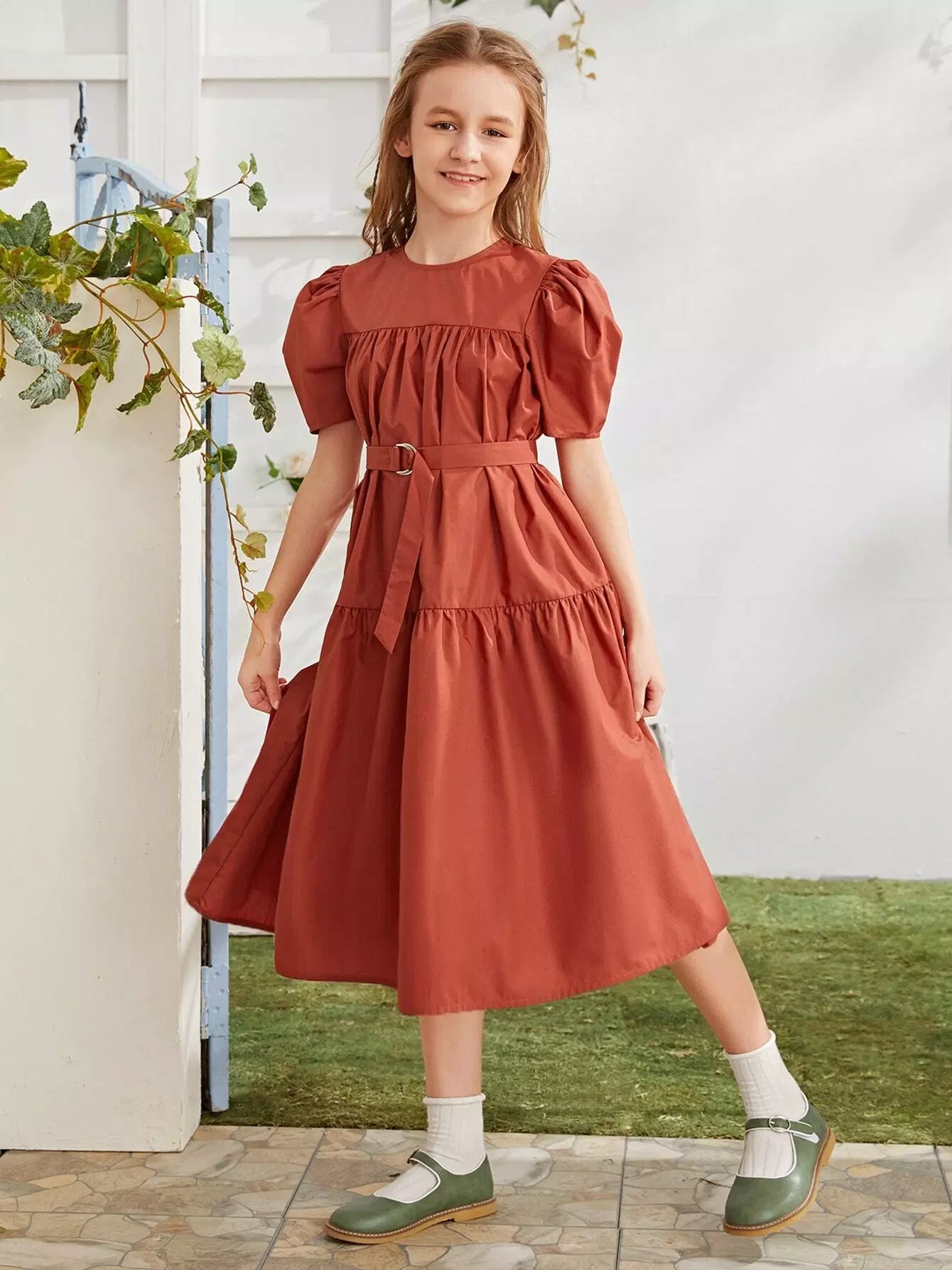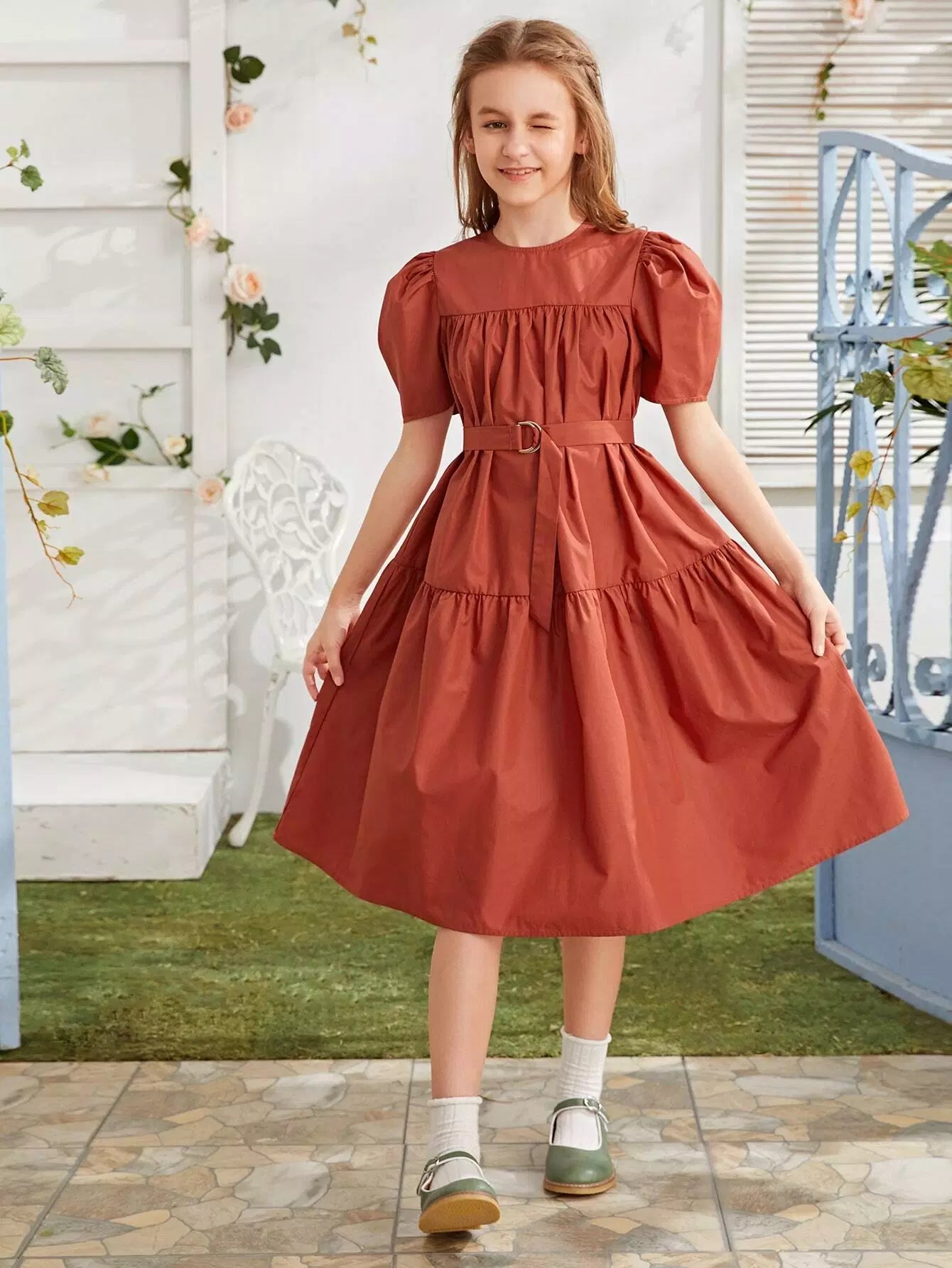 فستان بناتي بإبزيم بأكمام منتفخة بدون حزام