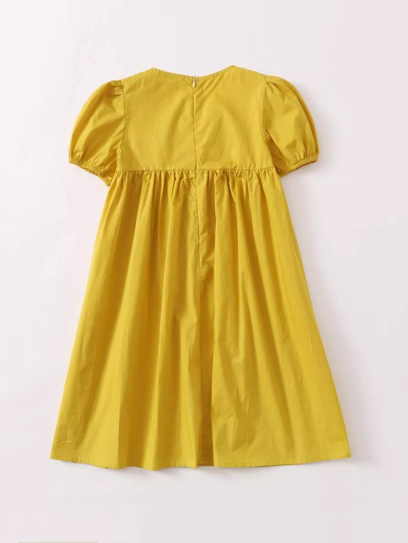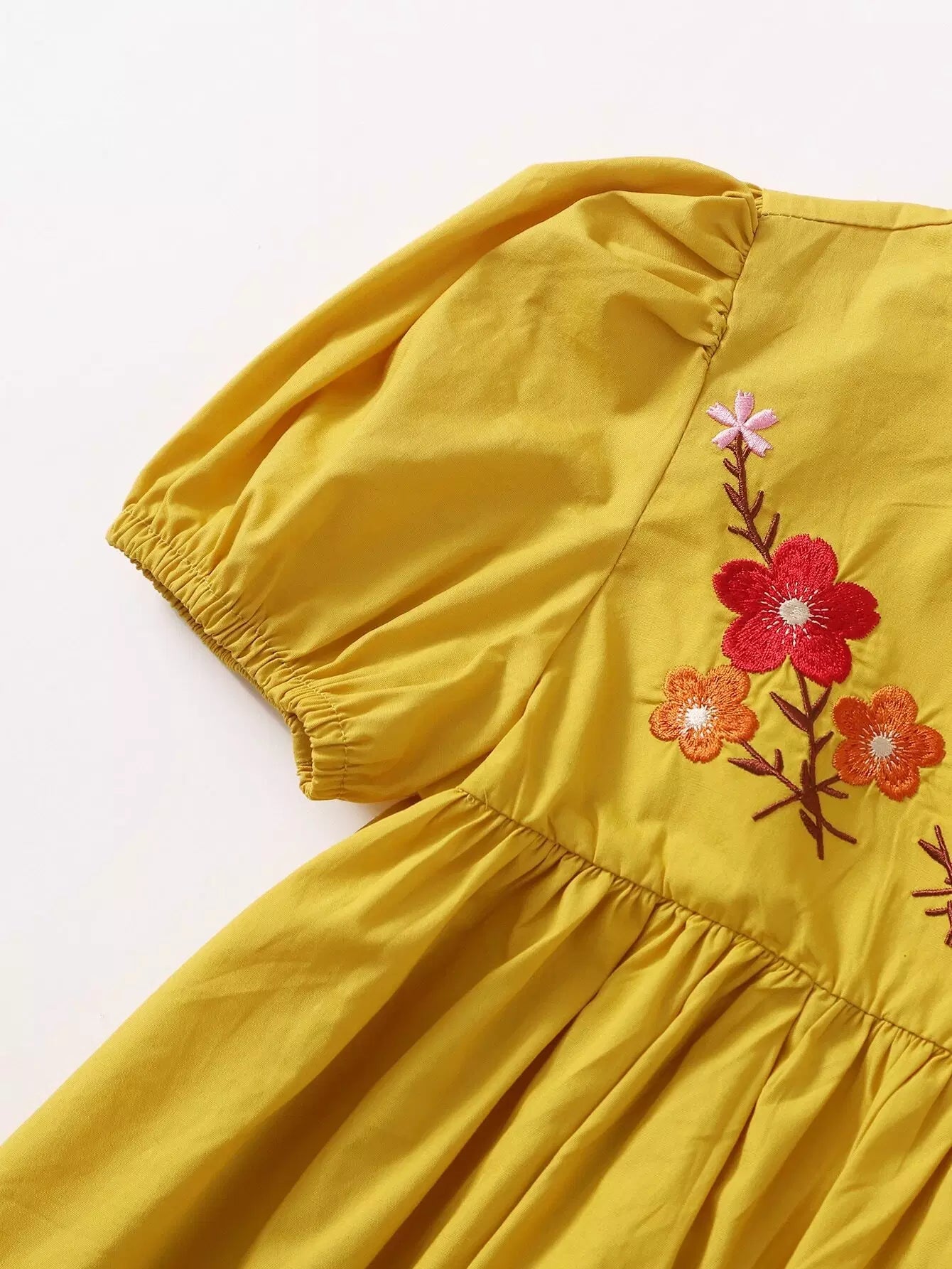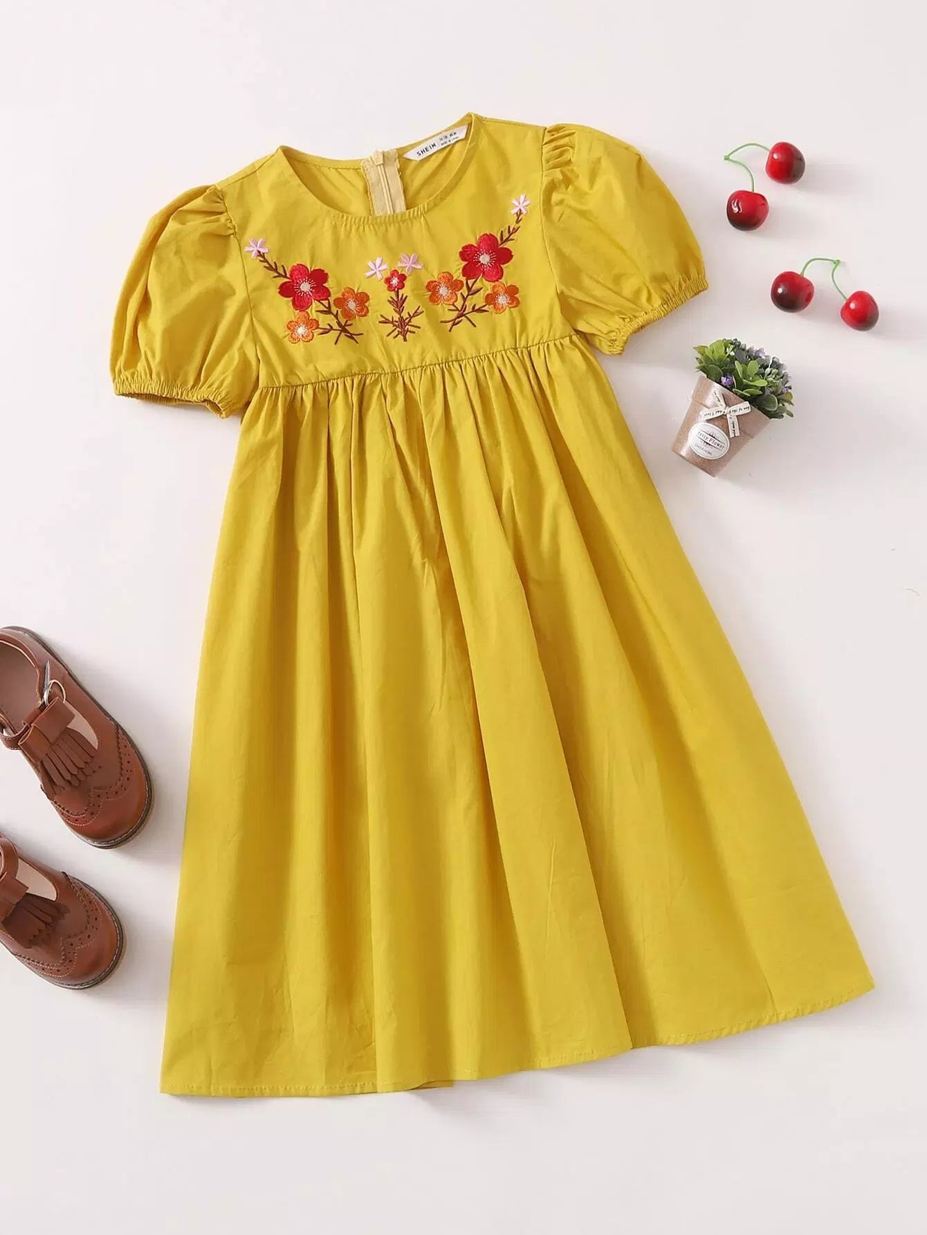 فستان سموك بأكمام منفوشة وتطريزات زهور للبنات