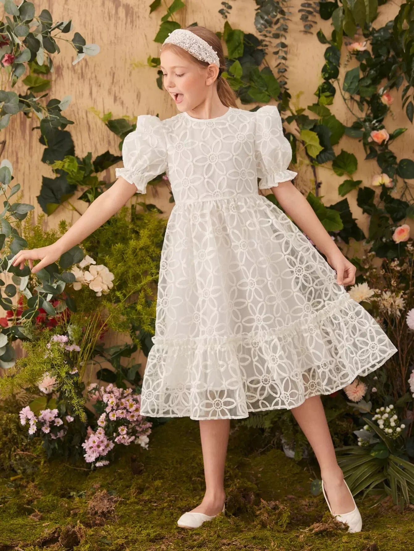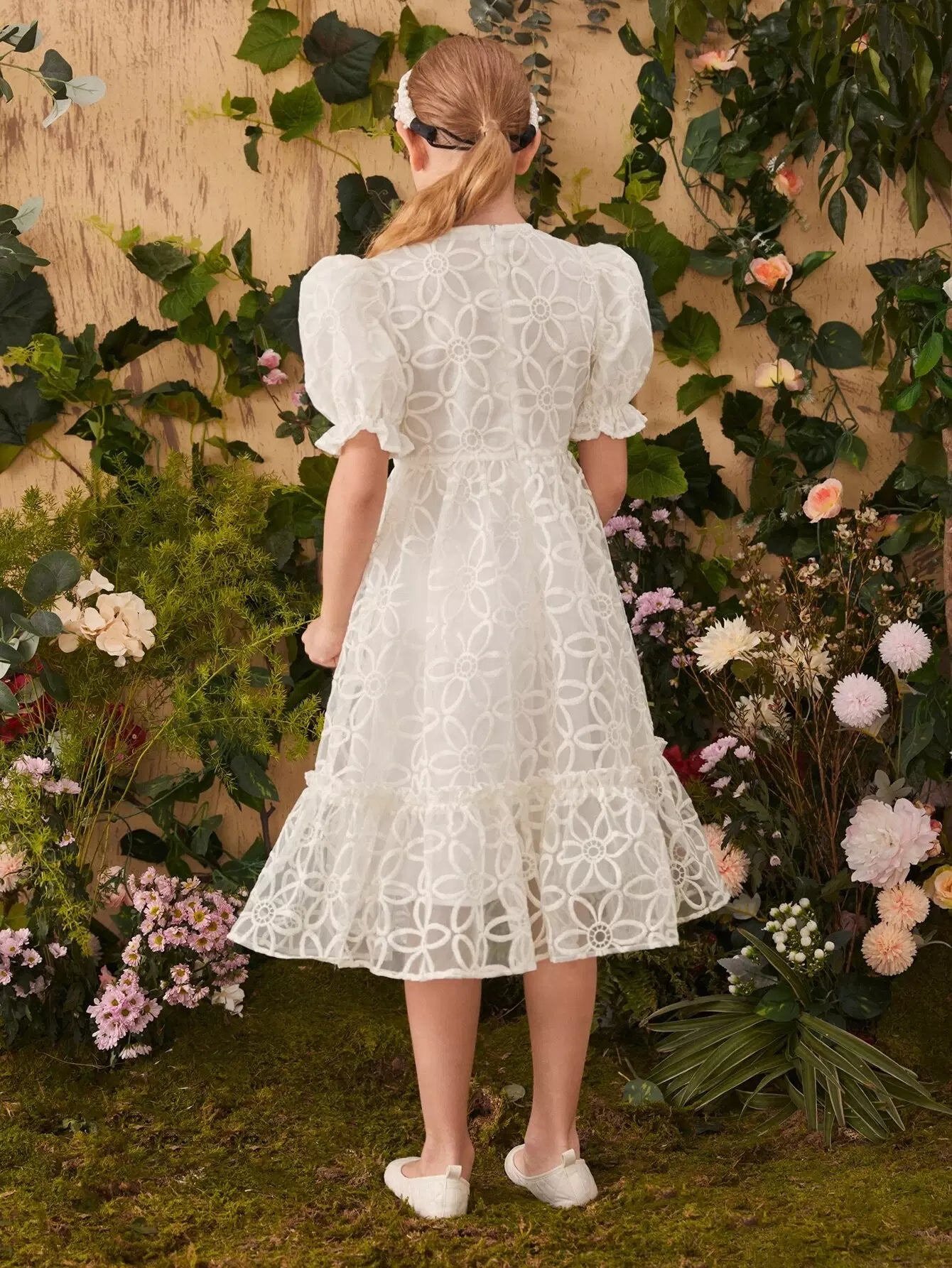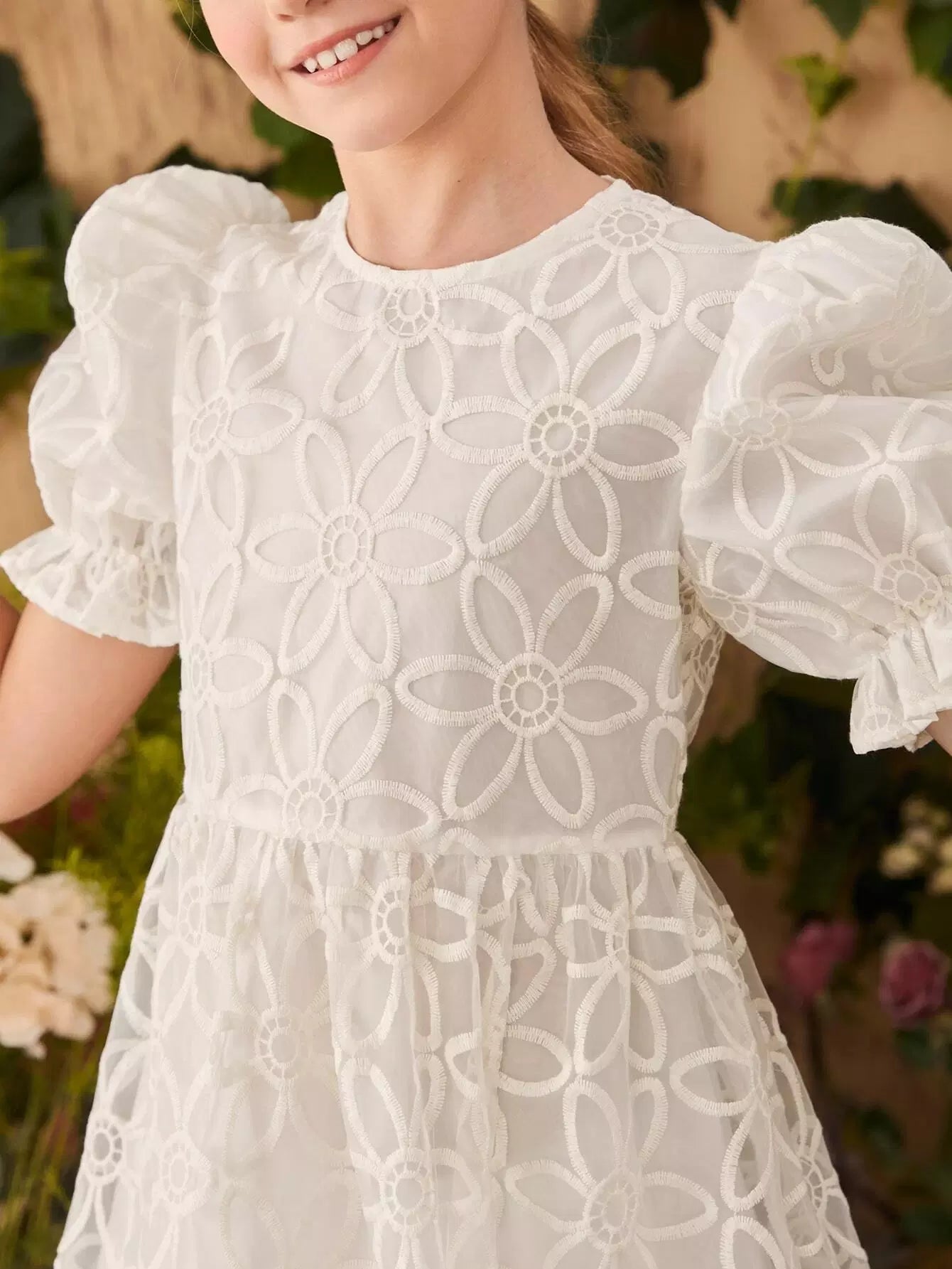 فستان بناتي مطرز بالزهور بأكمام منفوخة