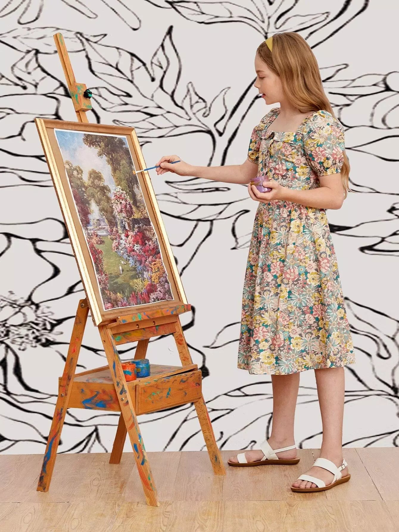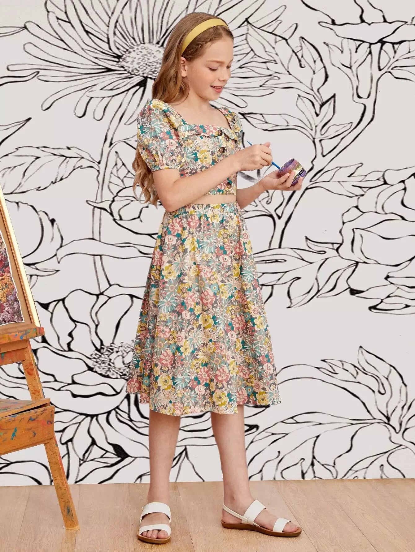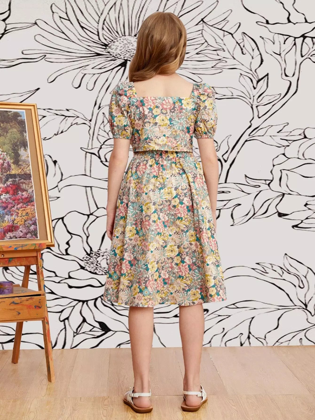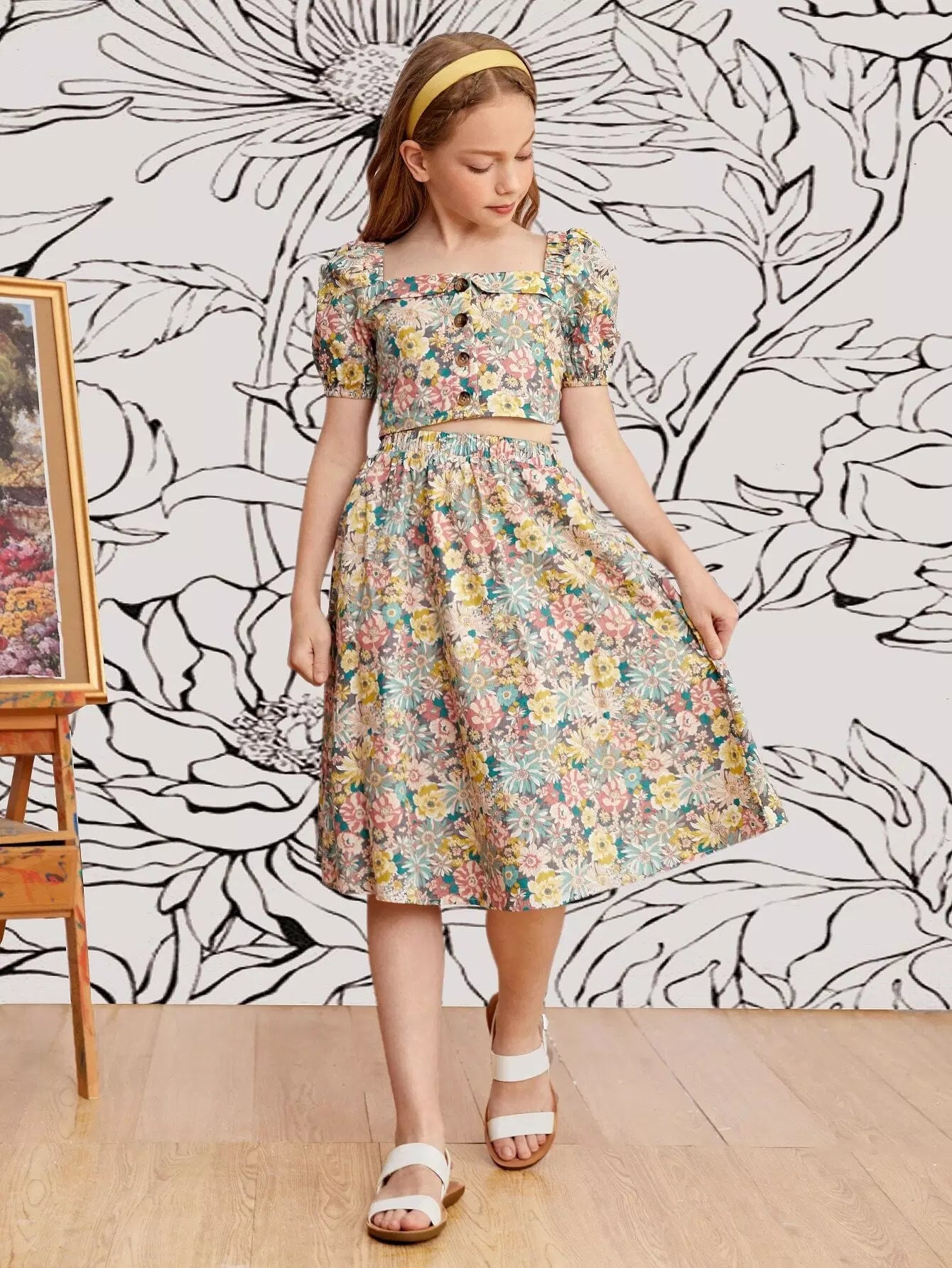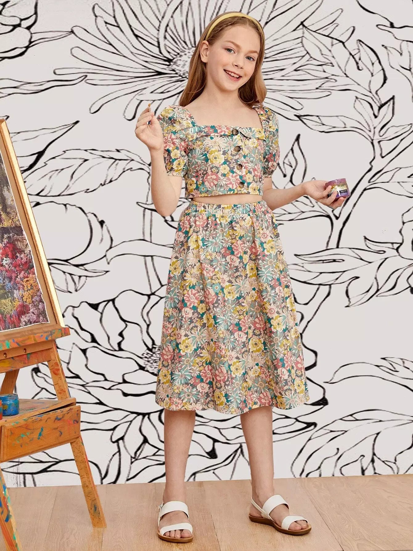 طقم تنورة وقميص بطبعة زهور بأكمام منفوخة للبنات