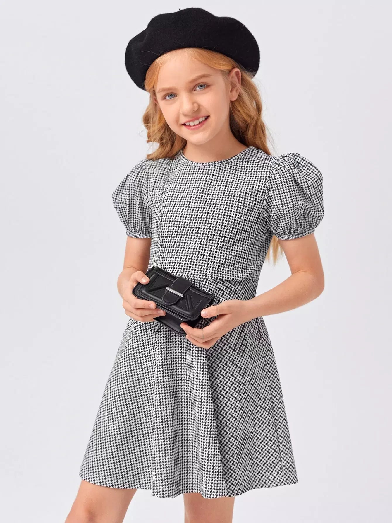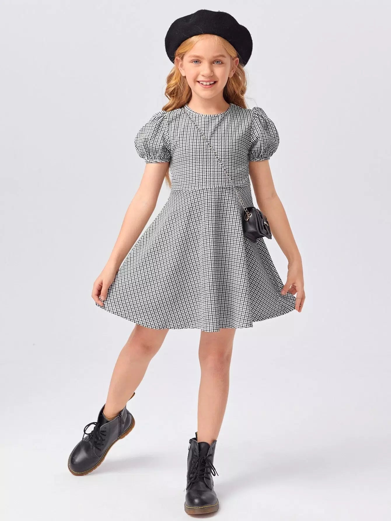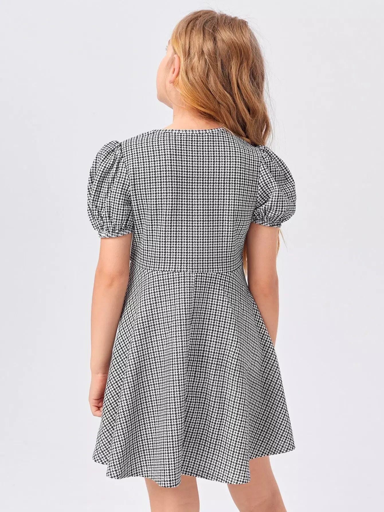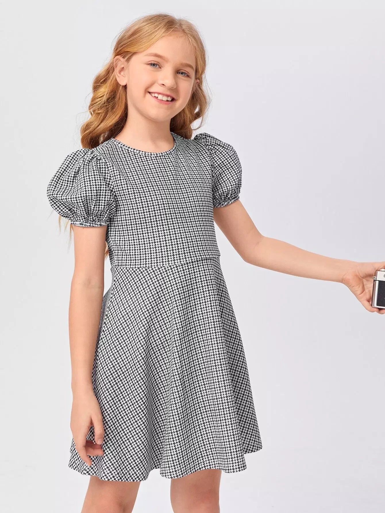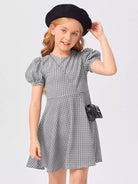 فستان بناتي بأكمام منفوخة ونقشة مربعات