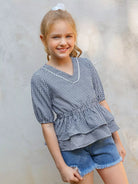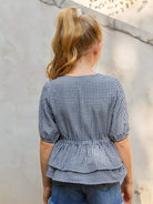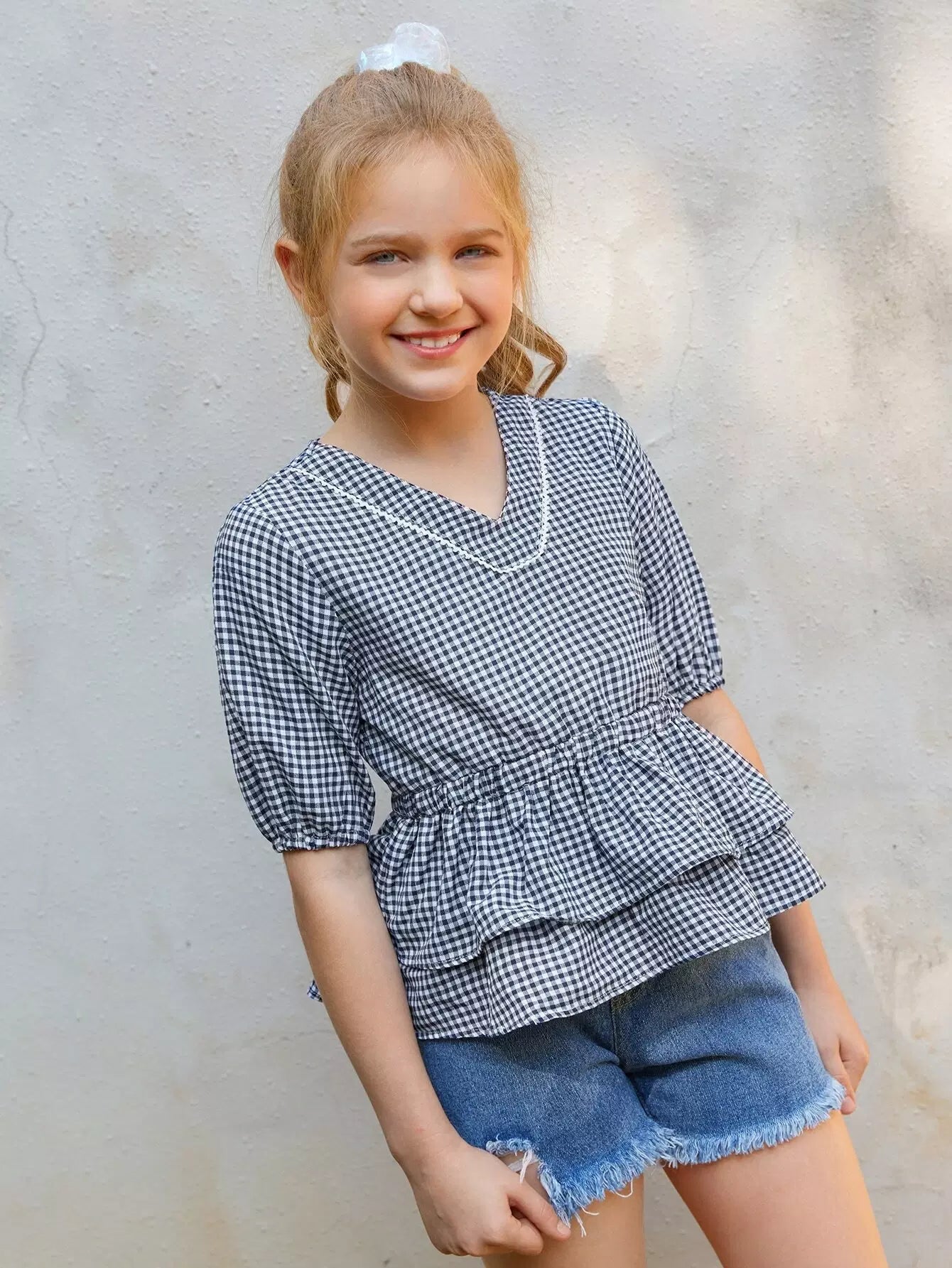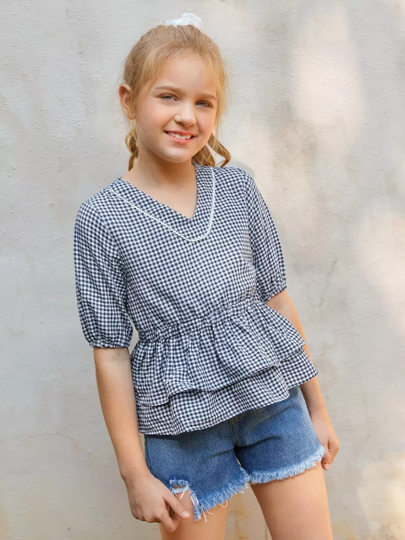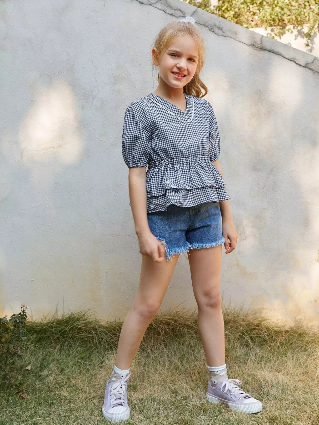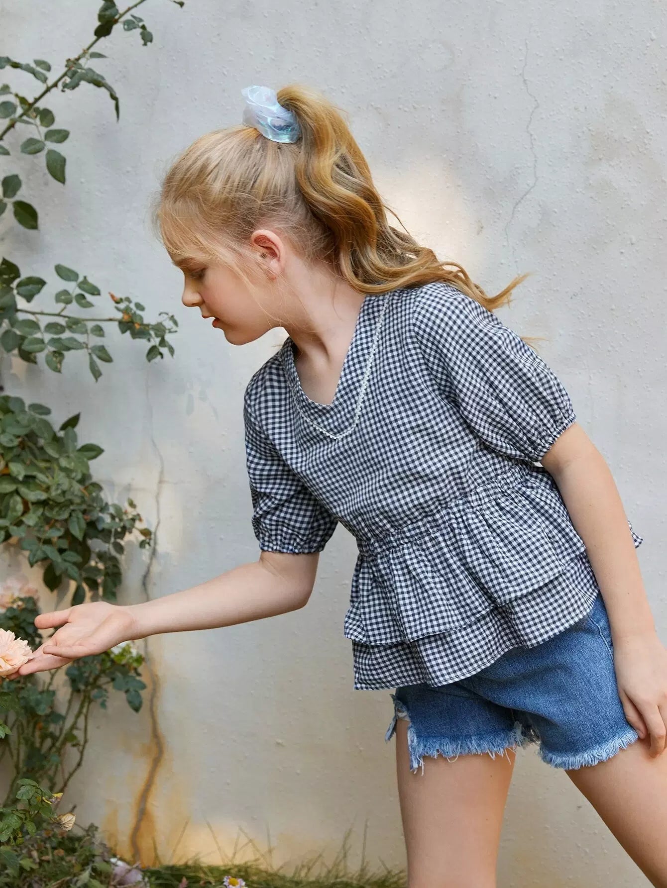 بلوزة بناتية من قماش مربعات بأكمام منفوخة وحاشية متعددة الطبقات