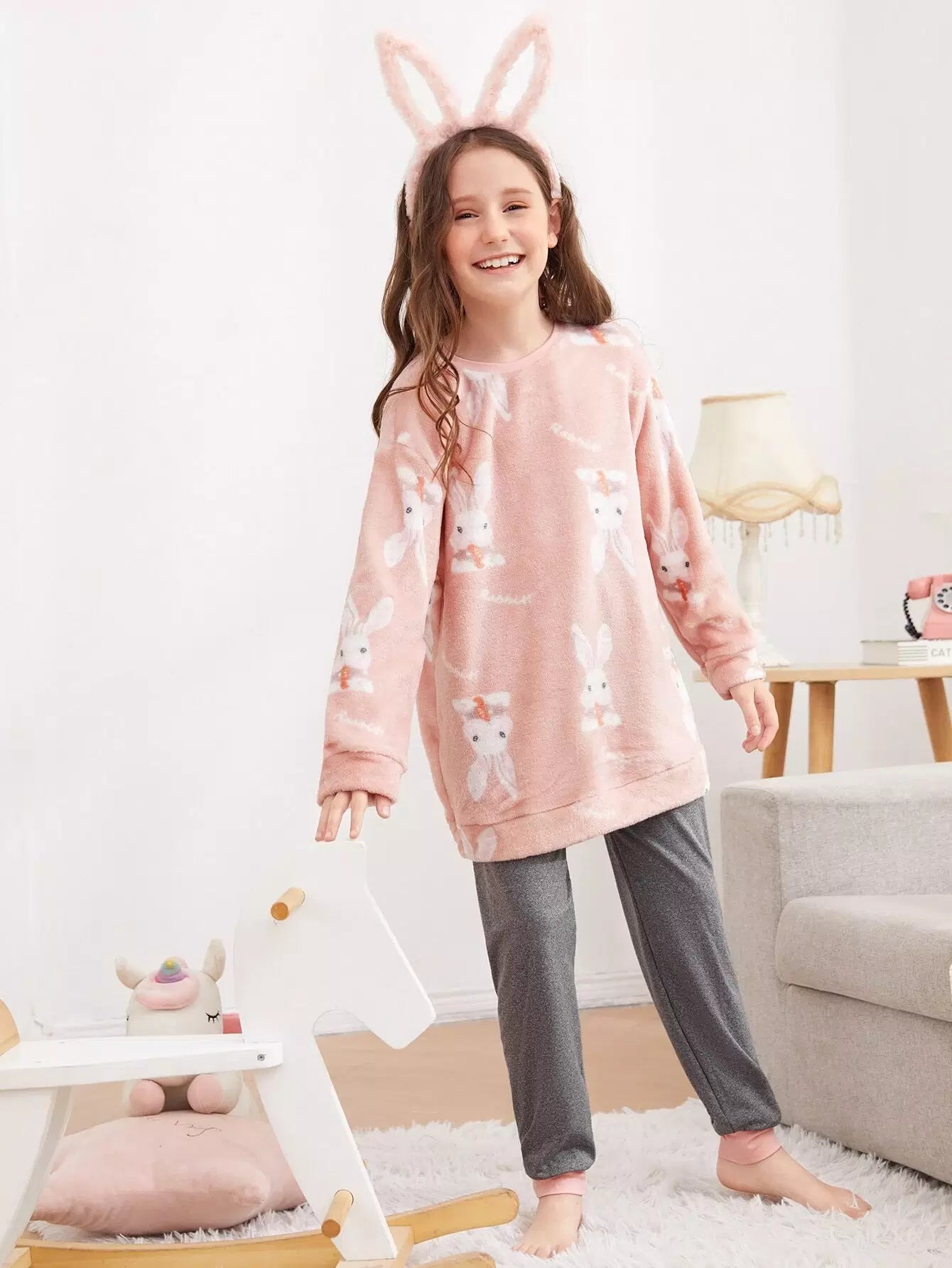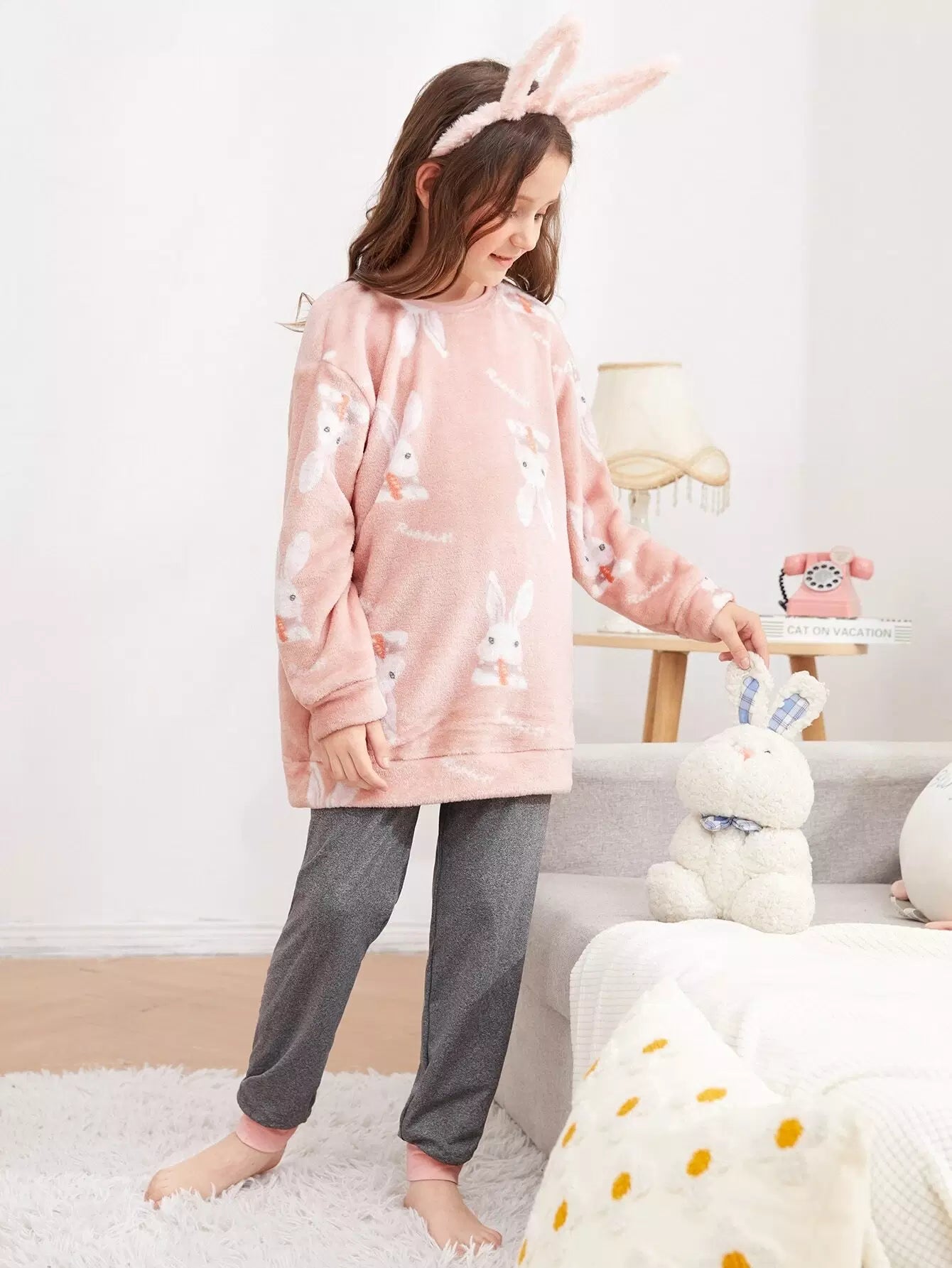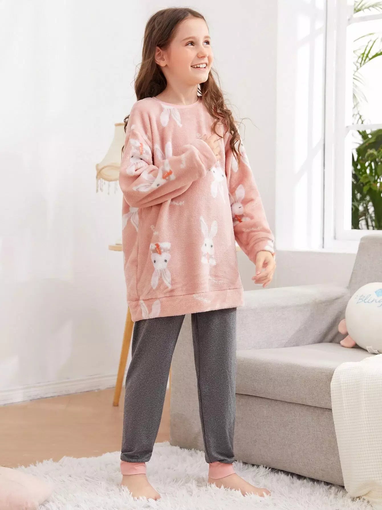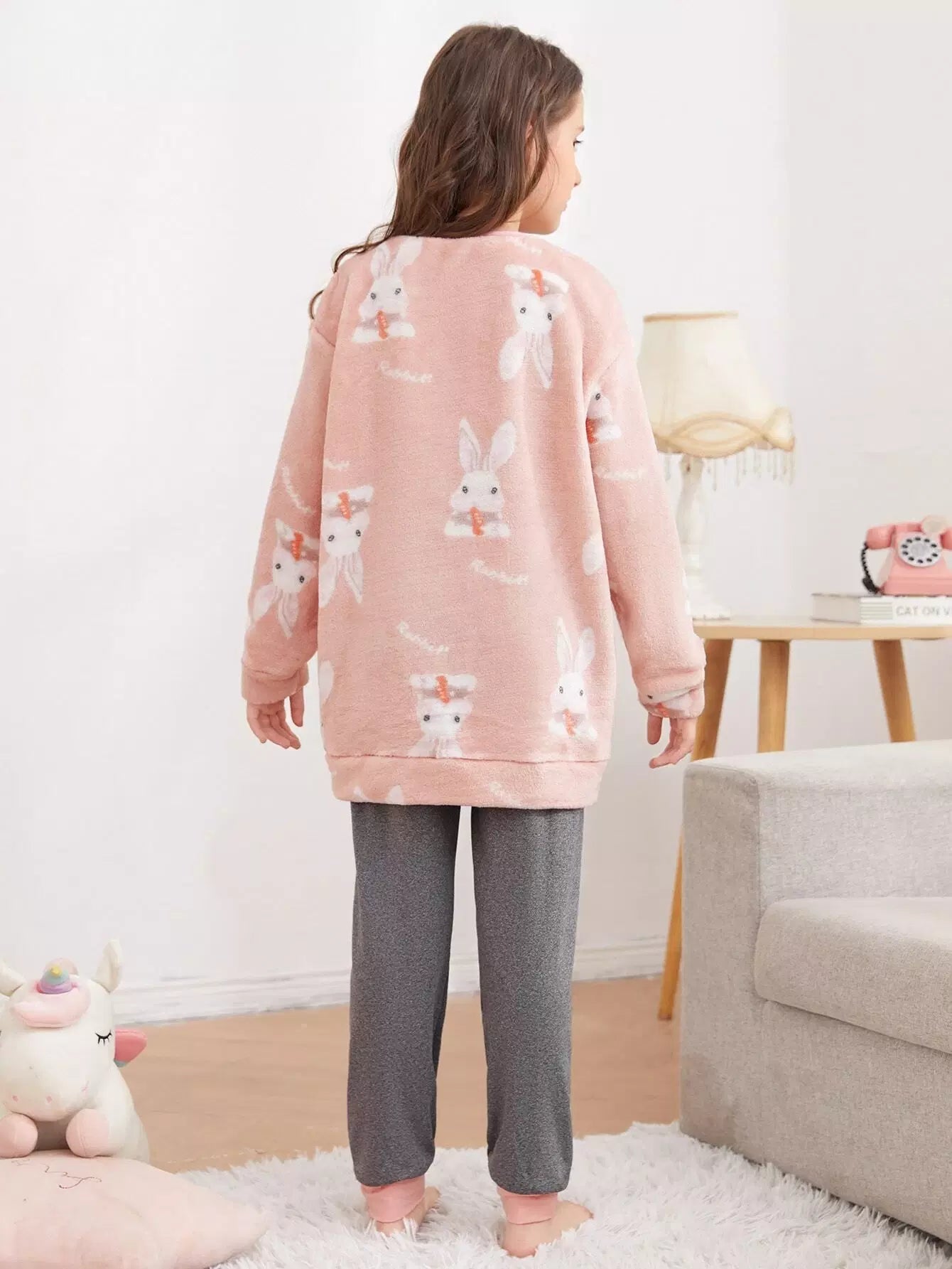 طقم بيجامة للبنات من الفلانيل بجزء علوي منقوش عليه أرنب وحرف وكتف منسدل وبنطلون