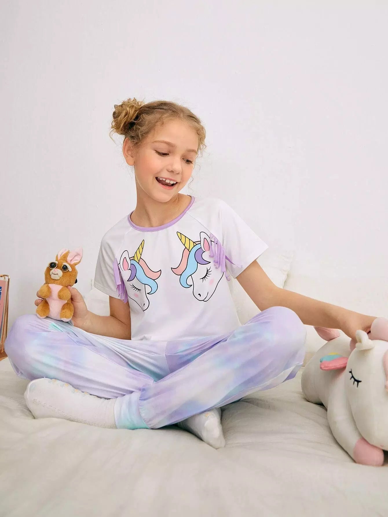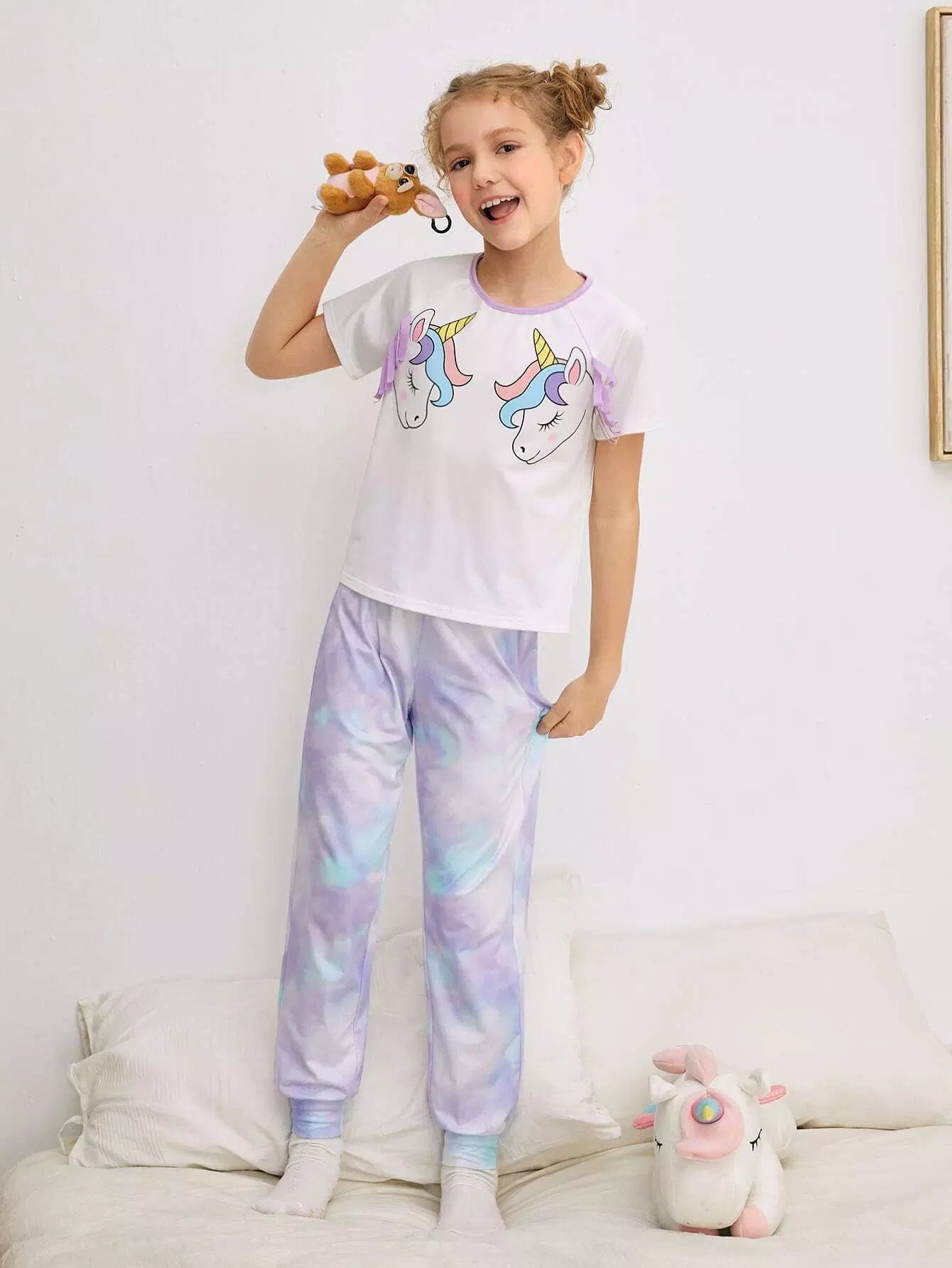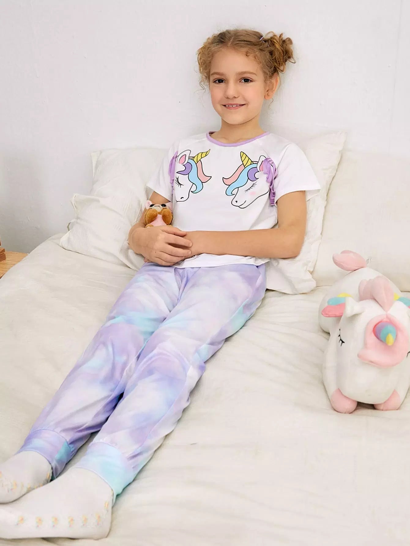 طقم بيجامة بنطلون بأكمام راجلان مطبوع عليها يونيكورن وبنطلون رياضي مصبوغ